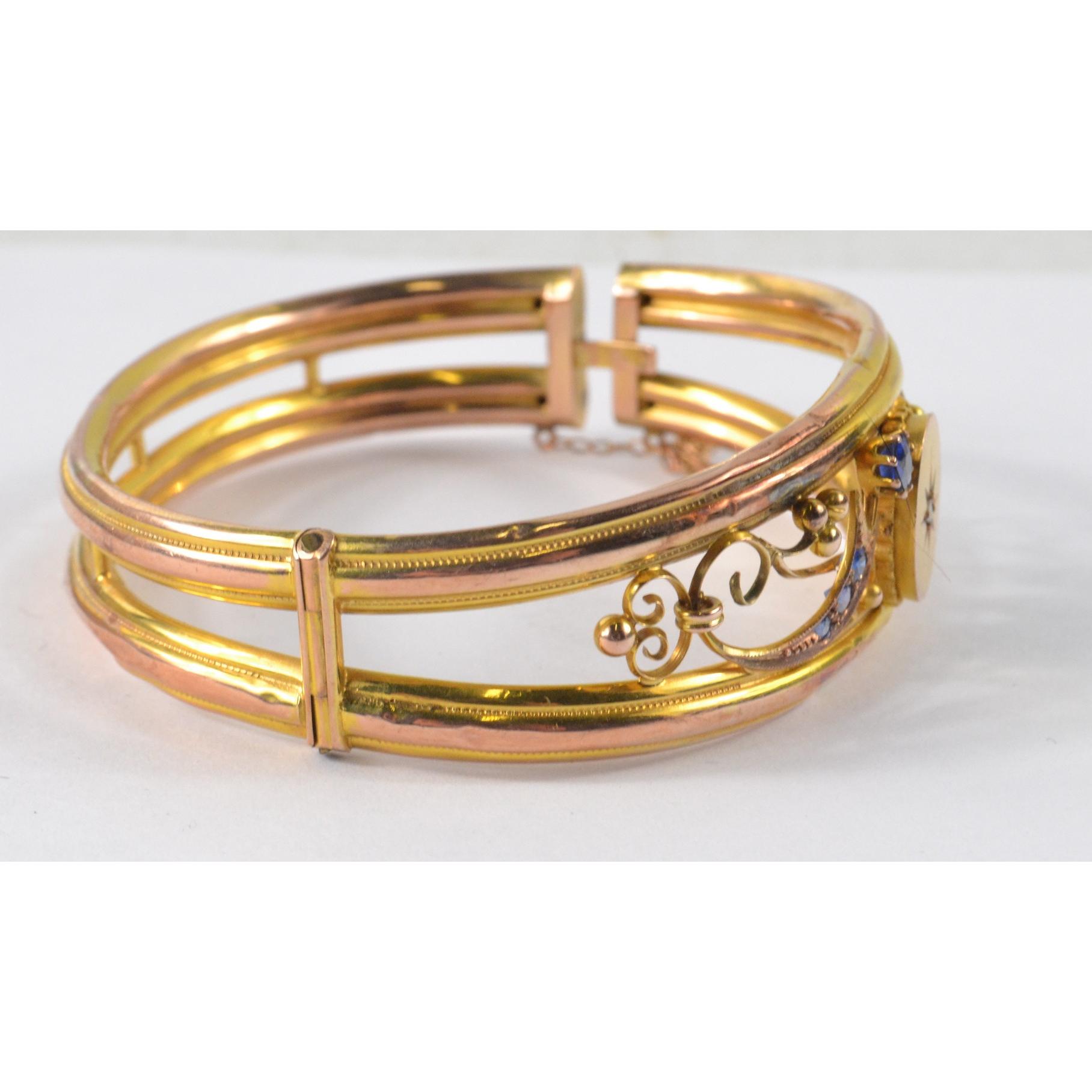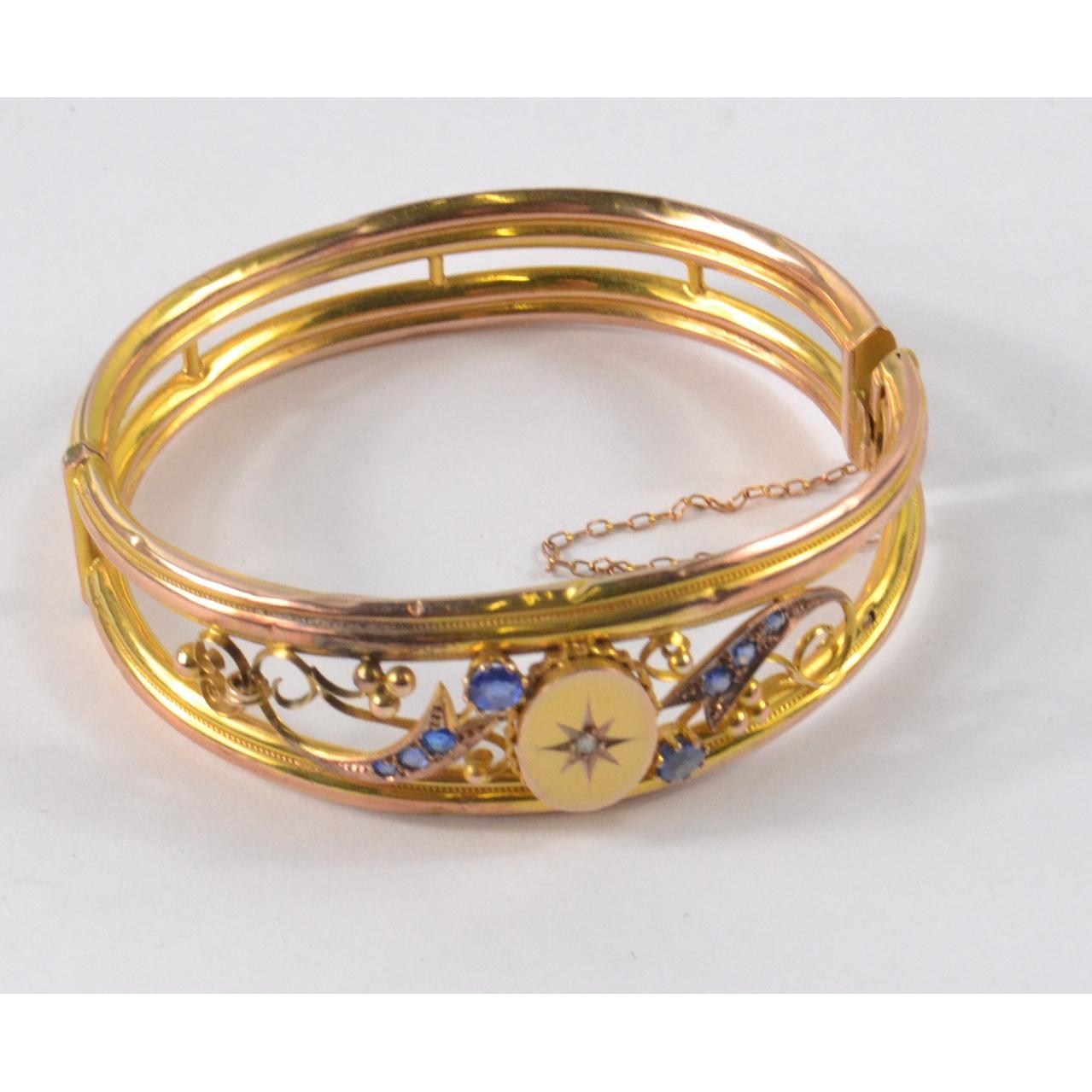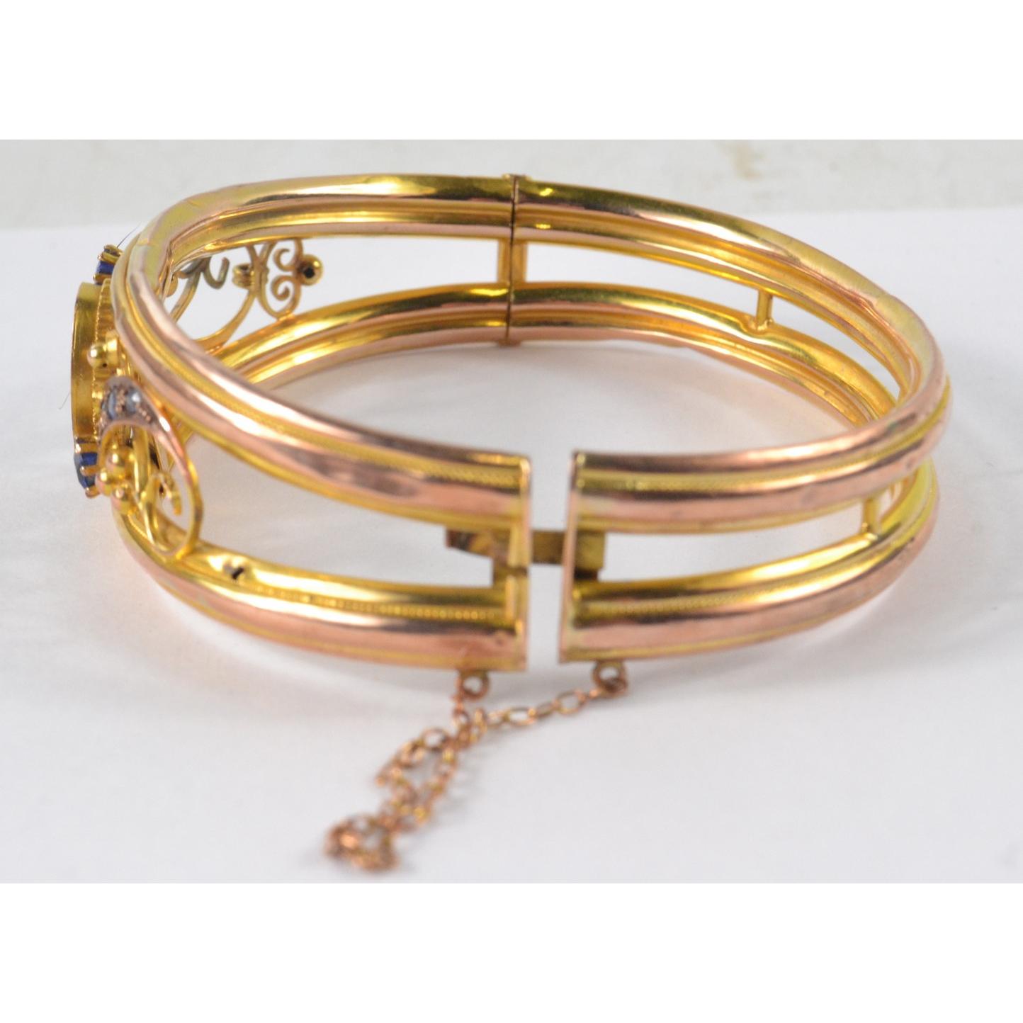 Yellow metal bracelet with a blue stone and clear stone within