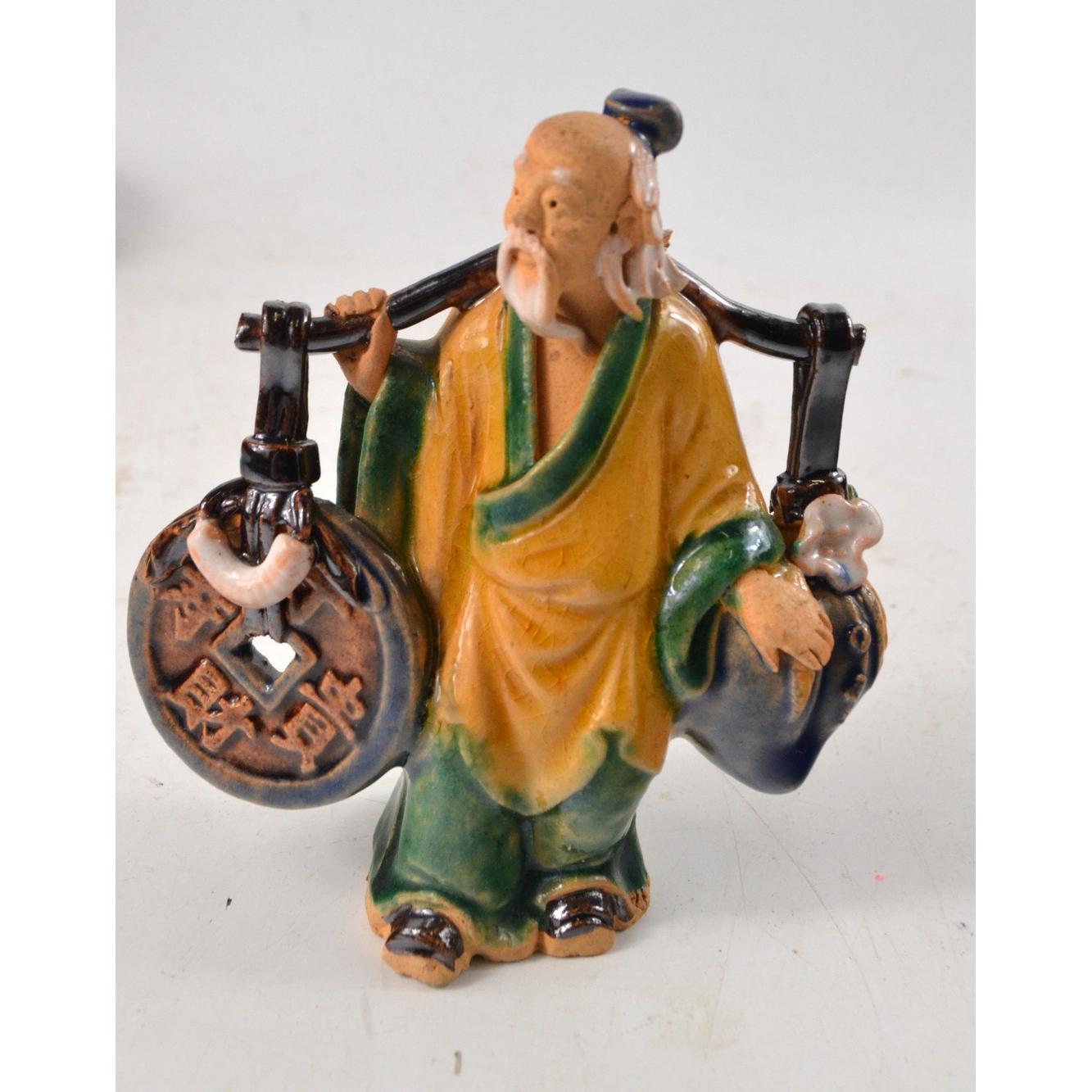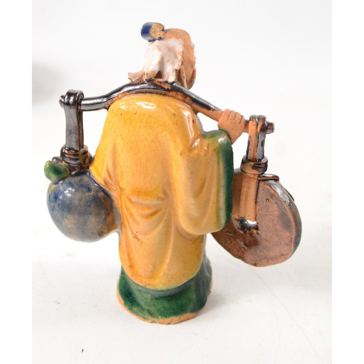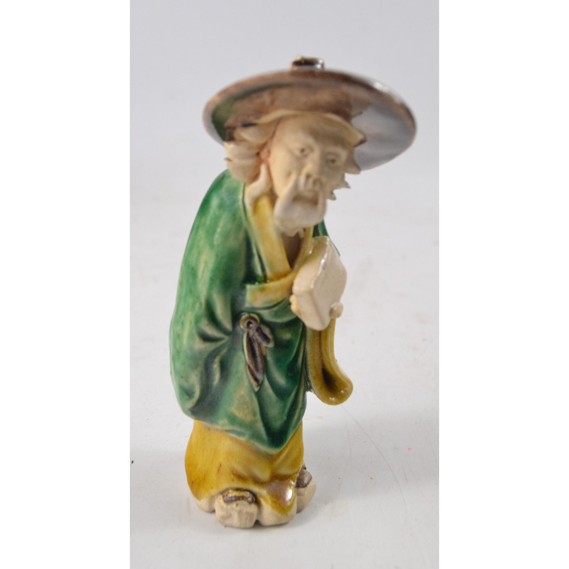 A collection of 4 glazed pottery Chinese men, in varying sizes, 16cm, 12cm 11cm and 9cm Heights, from largest to smallest.Approx 4 pieces
