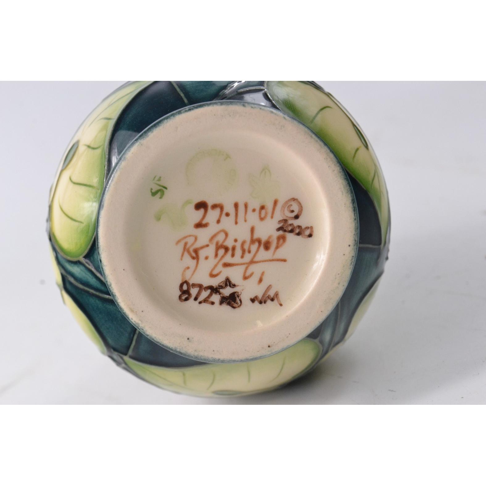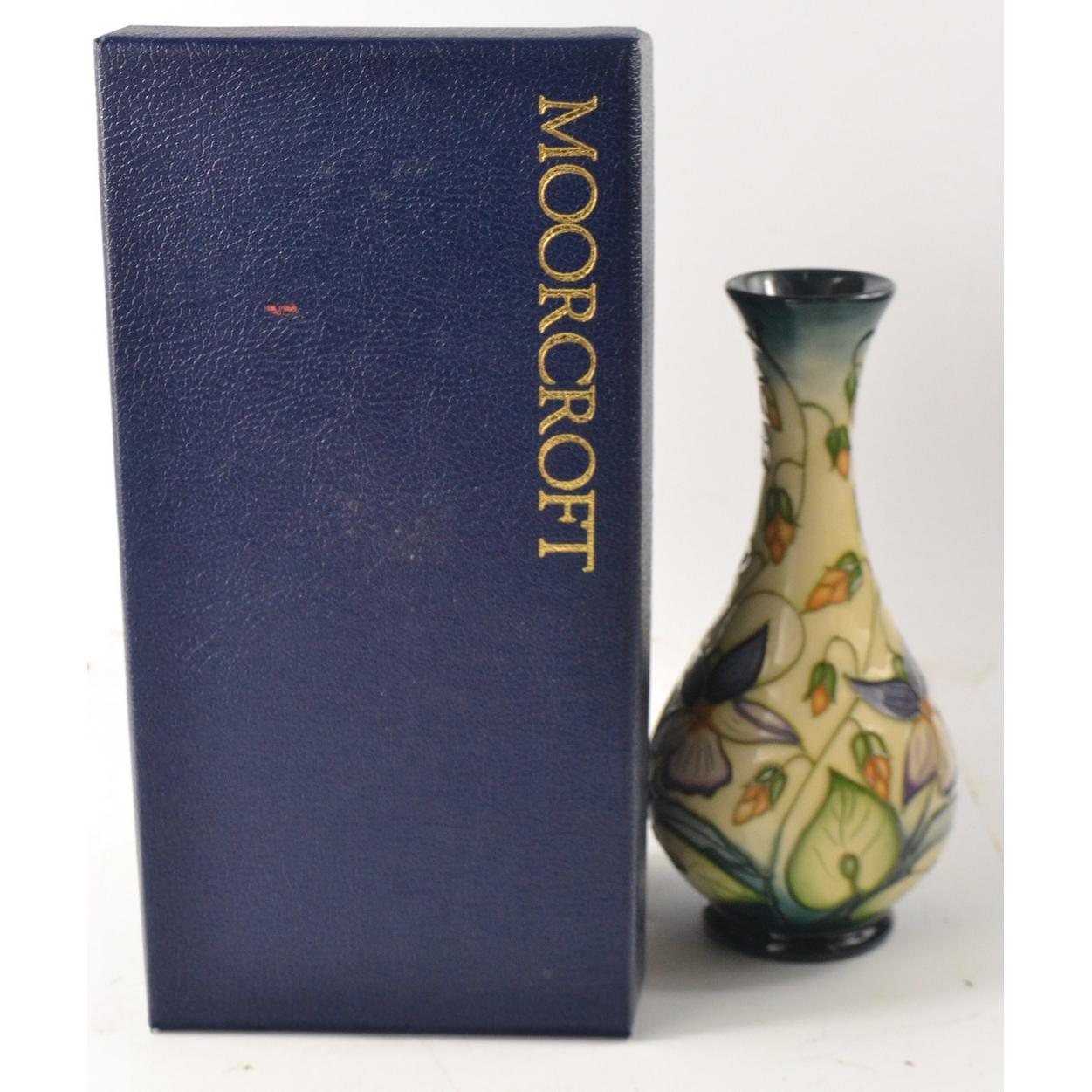MOORCROFT bud style vase in 'Sweet Thief' design. With original box H: 17cm approx