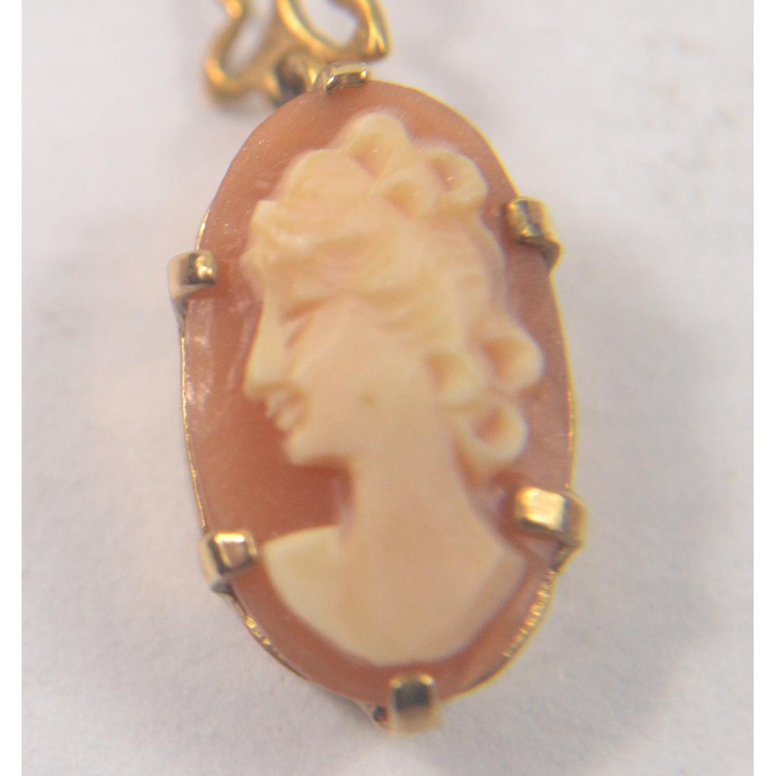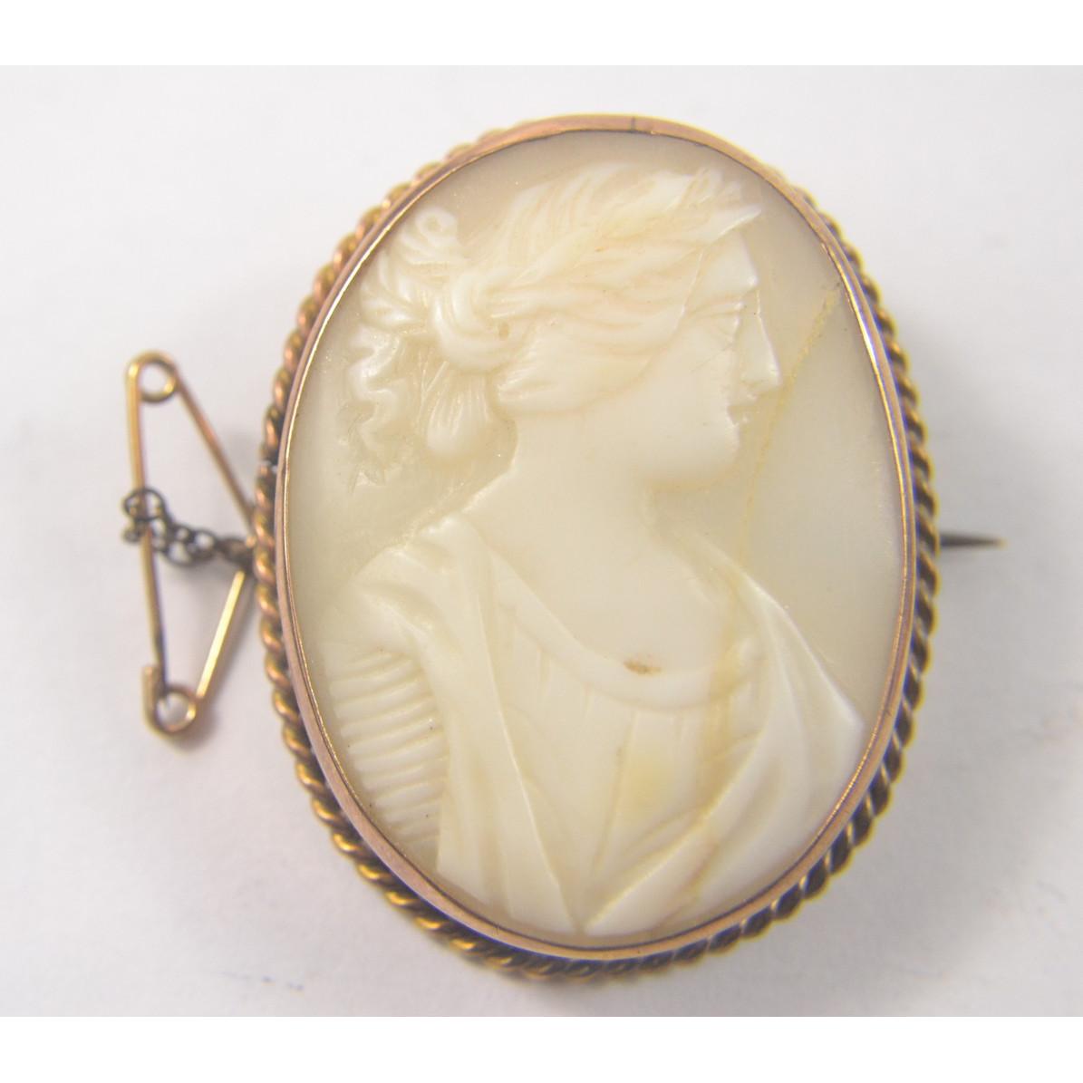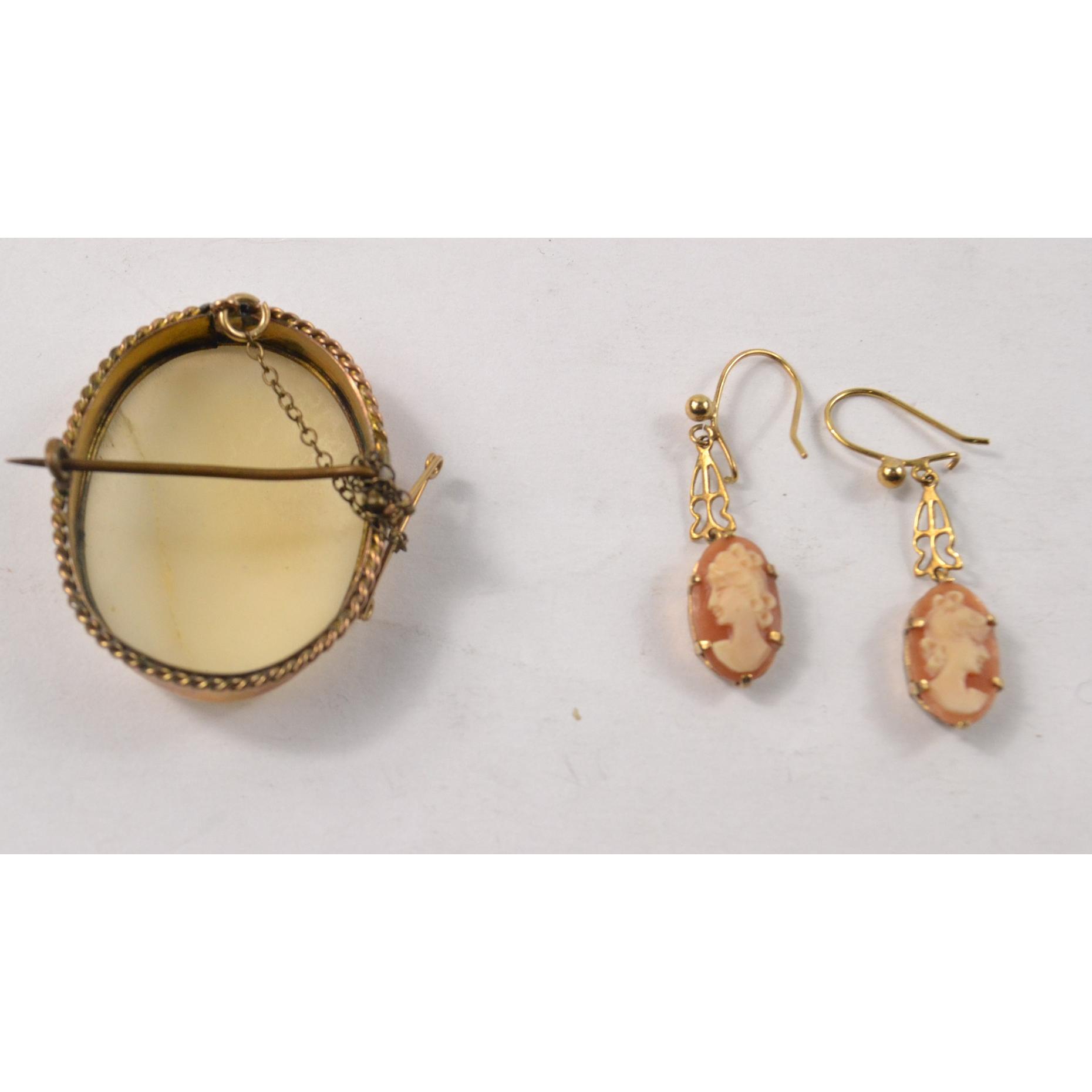 Cameo earring and brooch . Earrings hallmarked 9ct, brooch unmarked.L: Brooch: 3.5cm Earrings: 4cm approx Gross weight approx Earrings:2g Overall: 9.3g