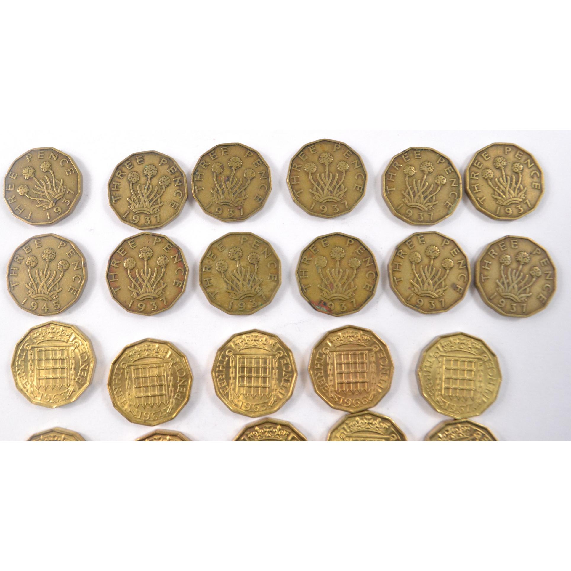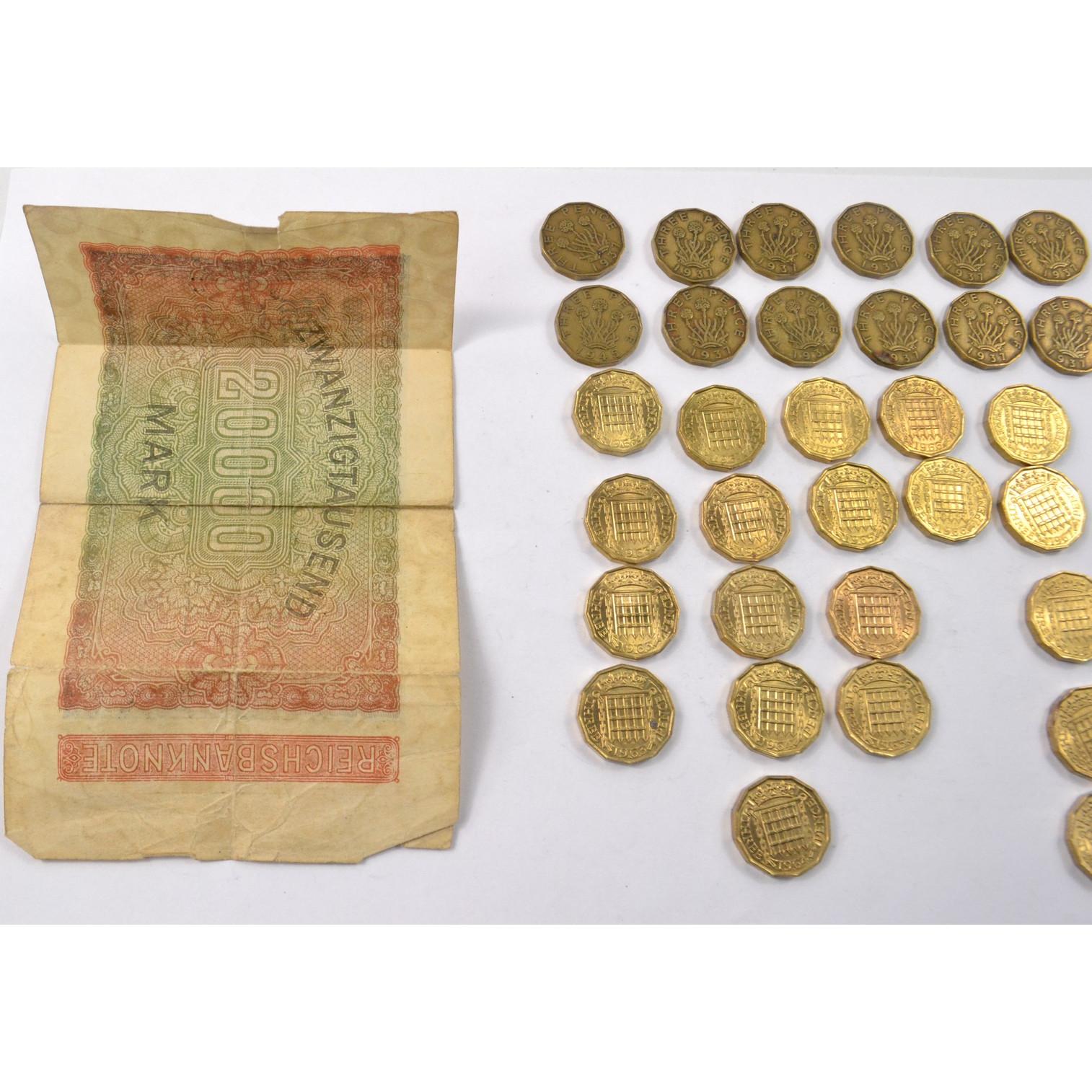 A large collection of three pence brass coins and a 20,000 REICHSBANKNOTE note 1923