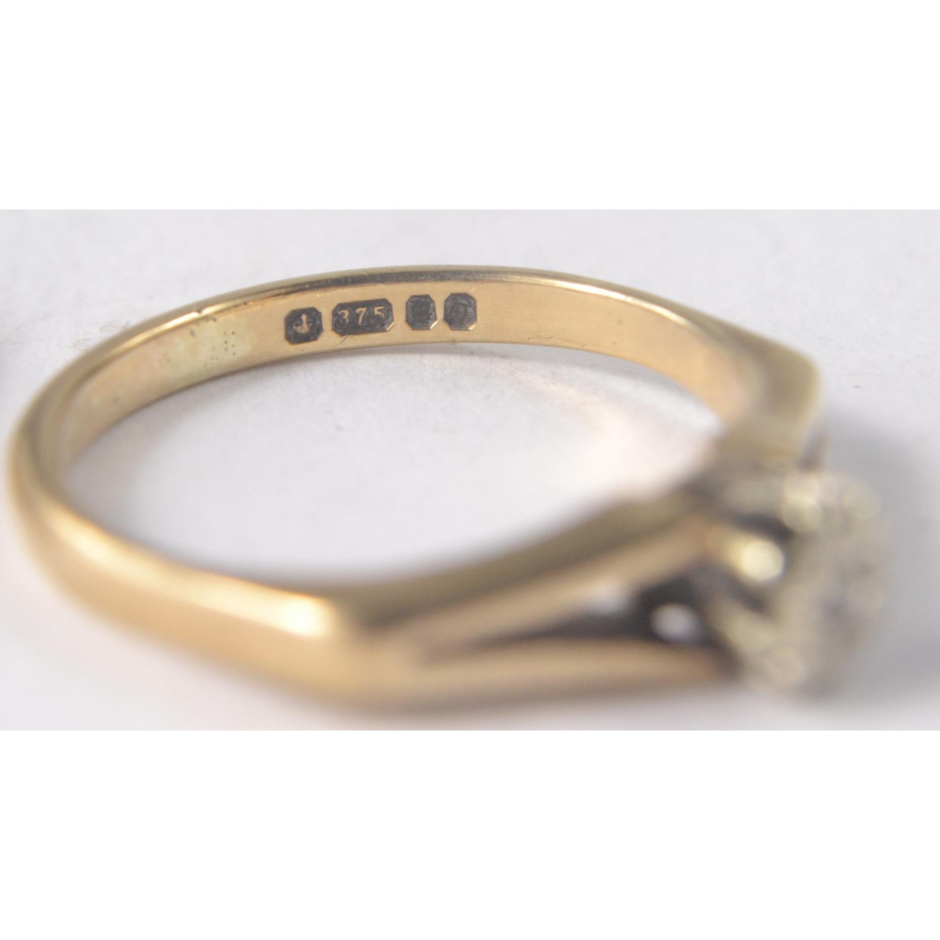 A stamped 375 yellow gold engagement ring with small centered white diamond , gross weight 2.02g size Gross weight approx 2.02