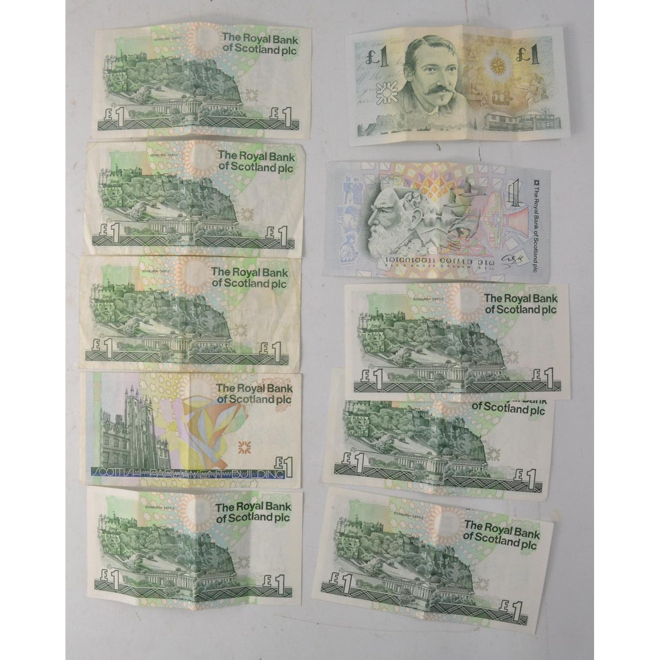 The Royal BANK Of SCOTLAND collection of one pound notes, one note reverse is depicting Alexander Graham Bell, another note with David Livingston, another featuring The Scottish Parliament, and 7 notes featuring Edinburgh Castle