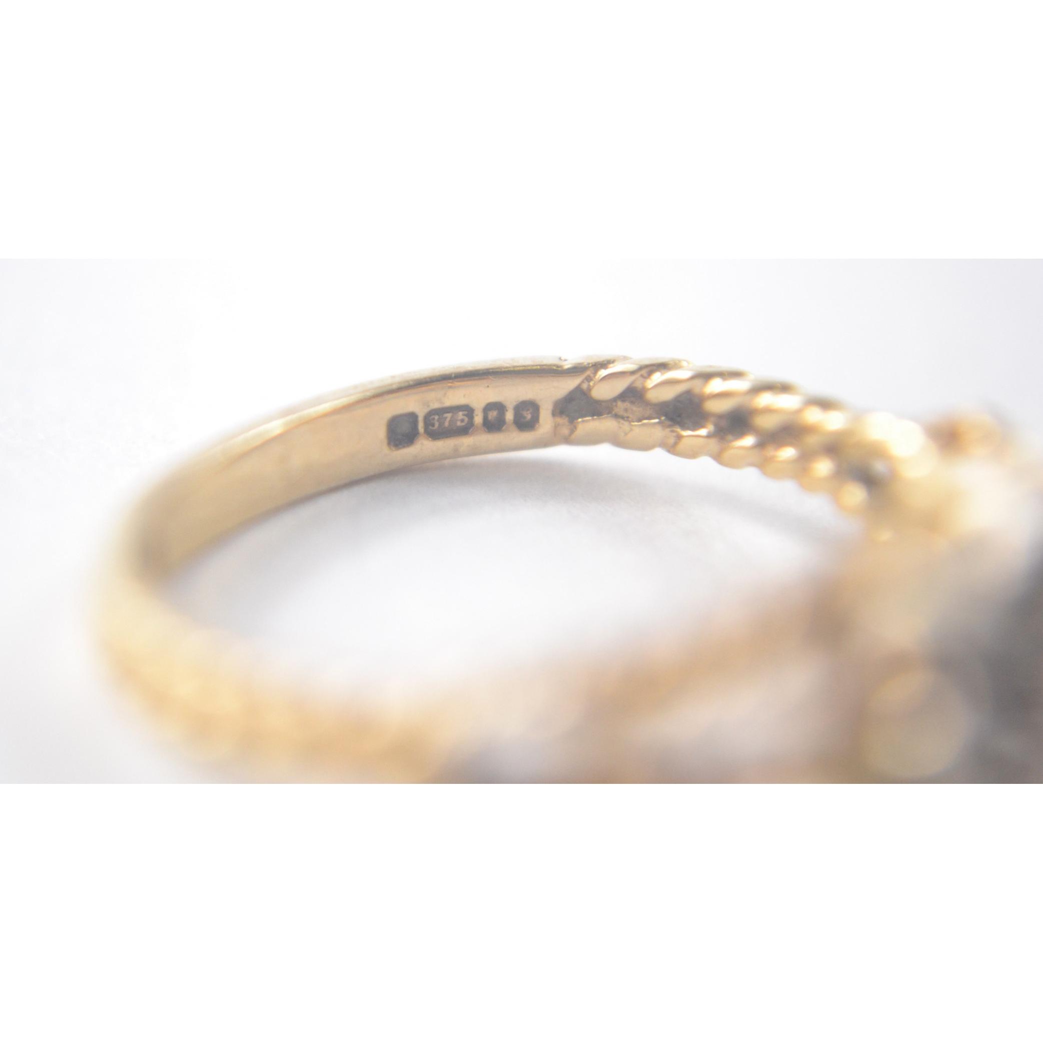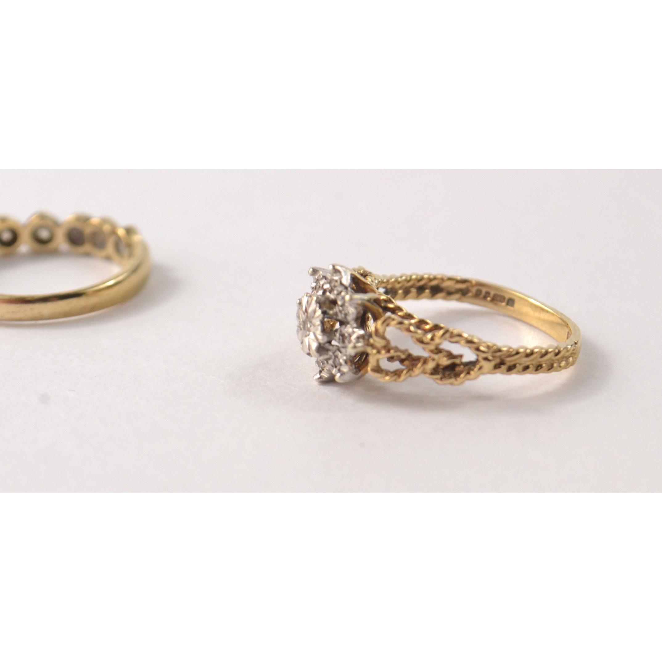 A ladies dress ring 375 stamped gold, with love hearts on either shoulders and centre diamond with smaller diamonds surrounding the centre diamond, a nice ring! gross weight 2.81g size K/L, and another ladies dress ring gold band with 7 small clear stone on upper band gross weight 2.35g ring size N