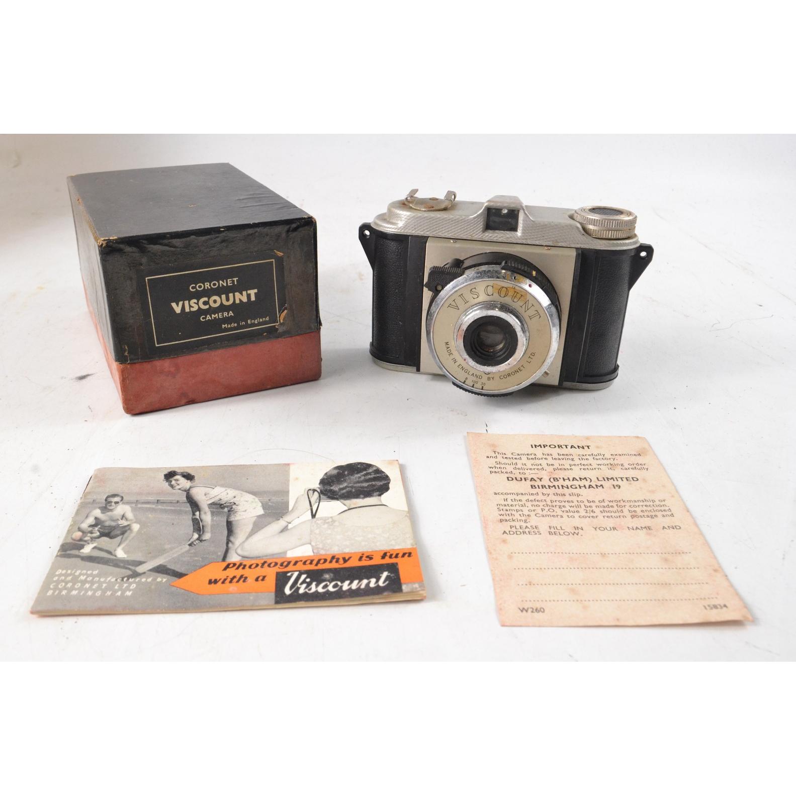 Collection of vintage cameras to include a BEIRETTE K100 with case, KODAK BROWNIE 111 with some spools, POLAROID SWINGER camera in original box, a VISCOUNT CORONET camera and lots of accessories to include KODAK camera cases still in original boxes etc