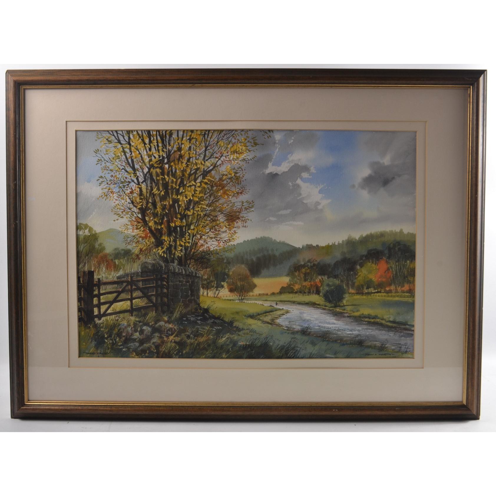JOHN F MARTIN (1970-2006) framed watercolour 'Tweed Valley'. Glasgow School of Art 'Newberry medal. Glass brokenW: Picture: 55.5cm approx H: Picture: 37cm approx