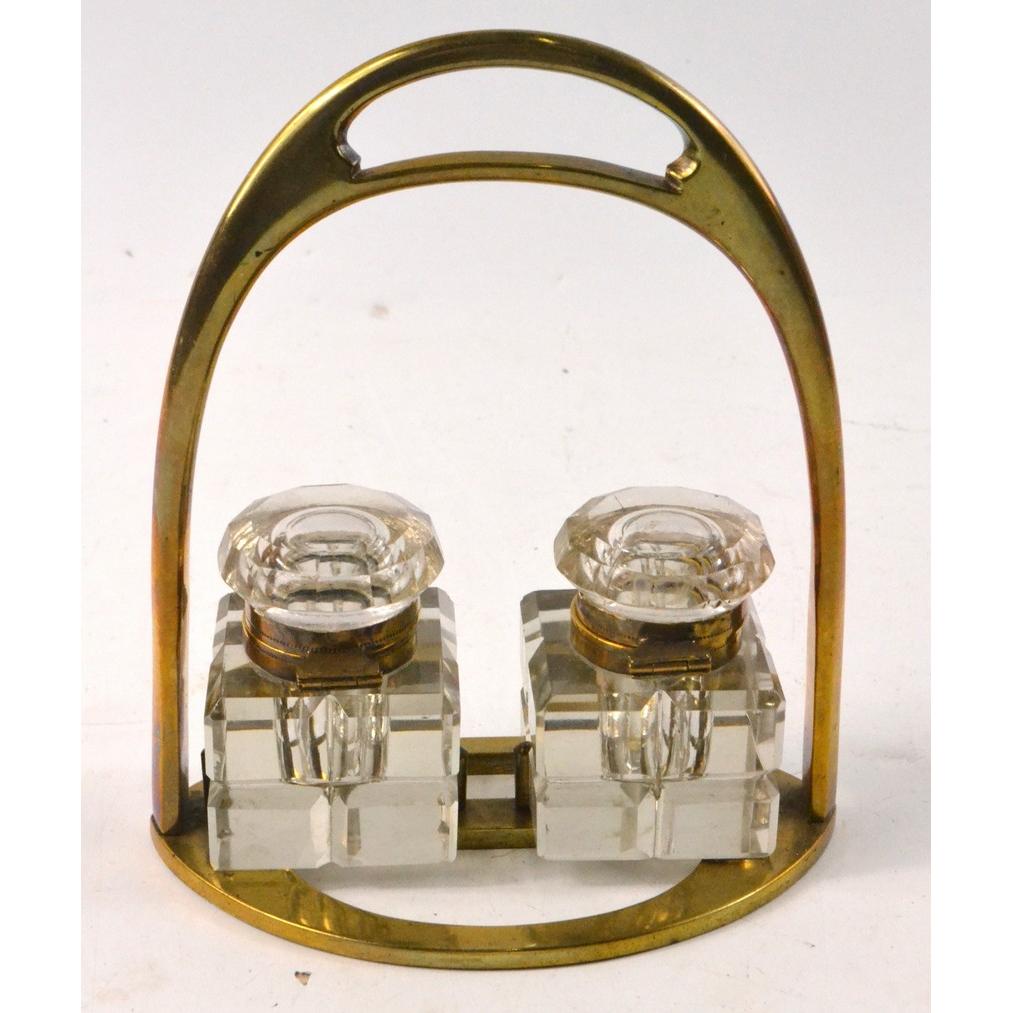 ART DECO style pair of cut-glass inkwells with brass stand - UNUSUALApprox 3 pieces