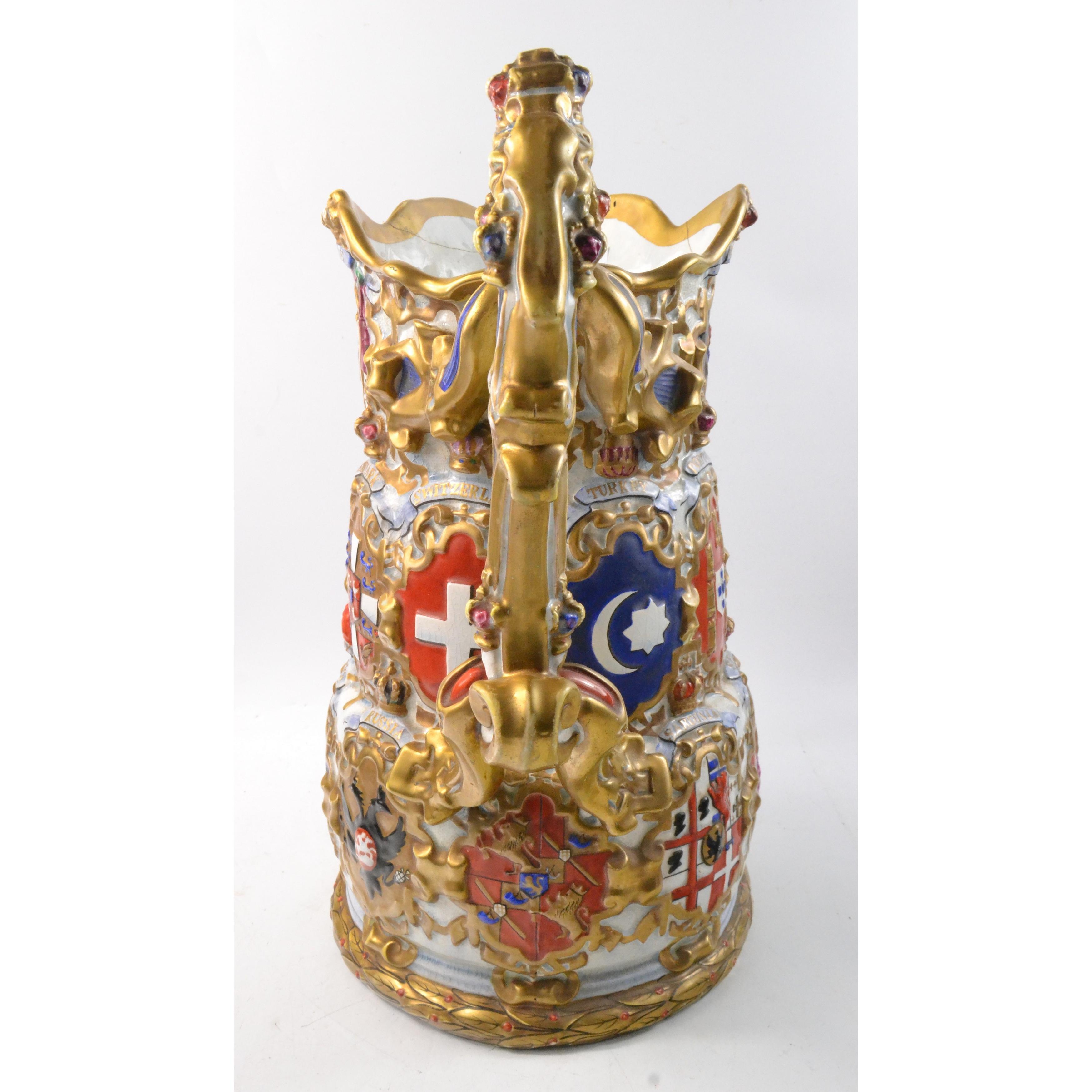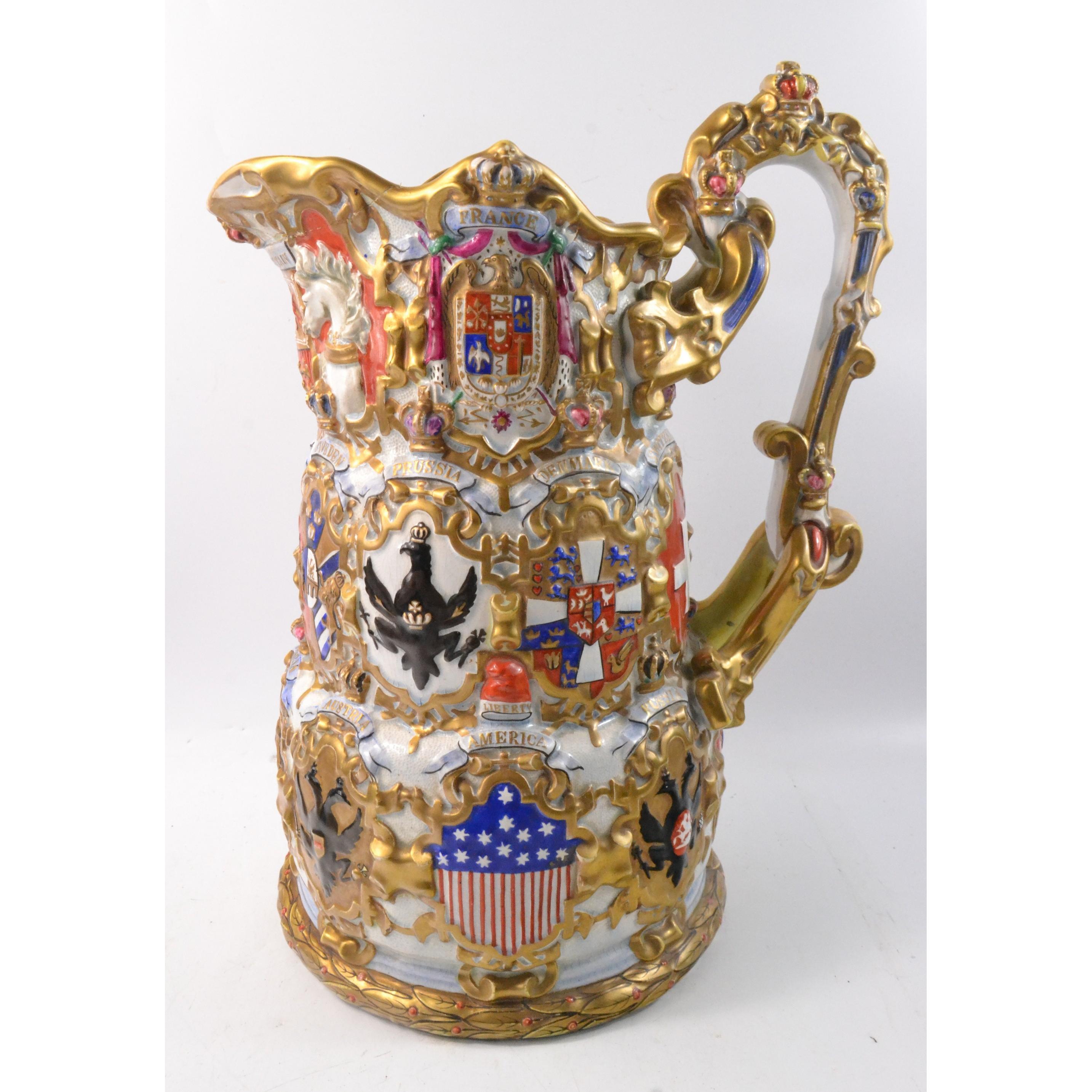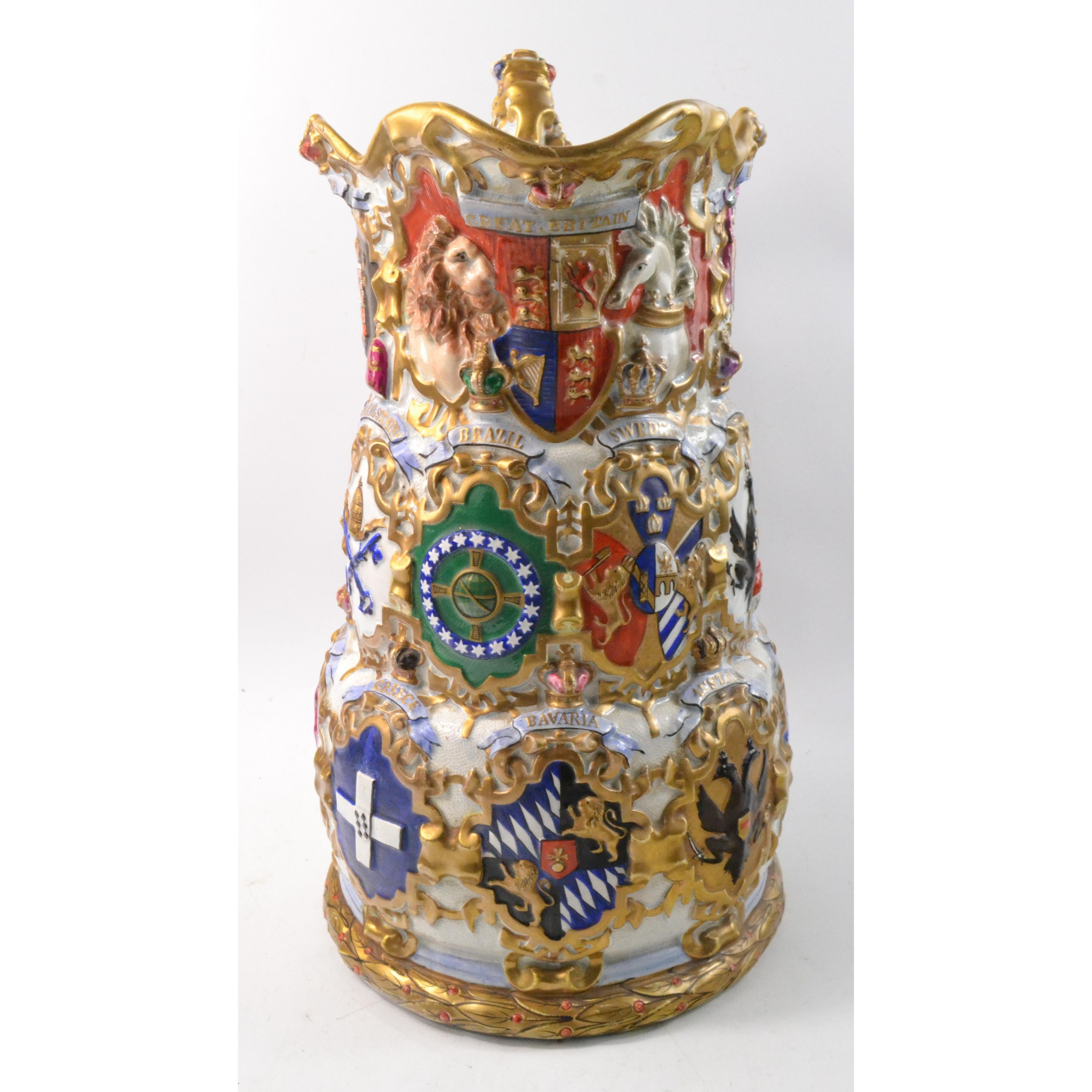 Heraldic large decorative crested jug. Damage repaired but does not detract from the item