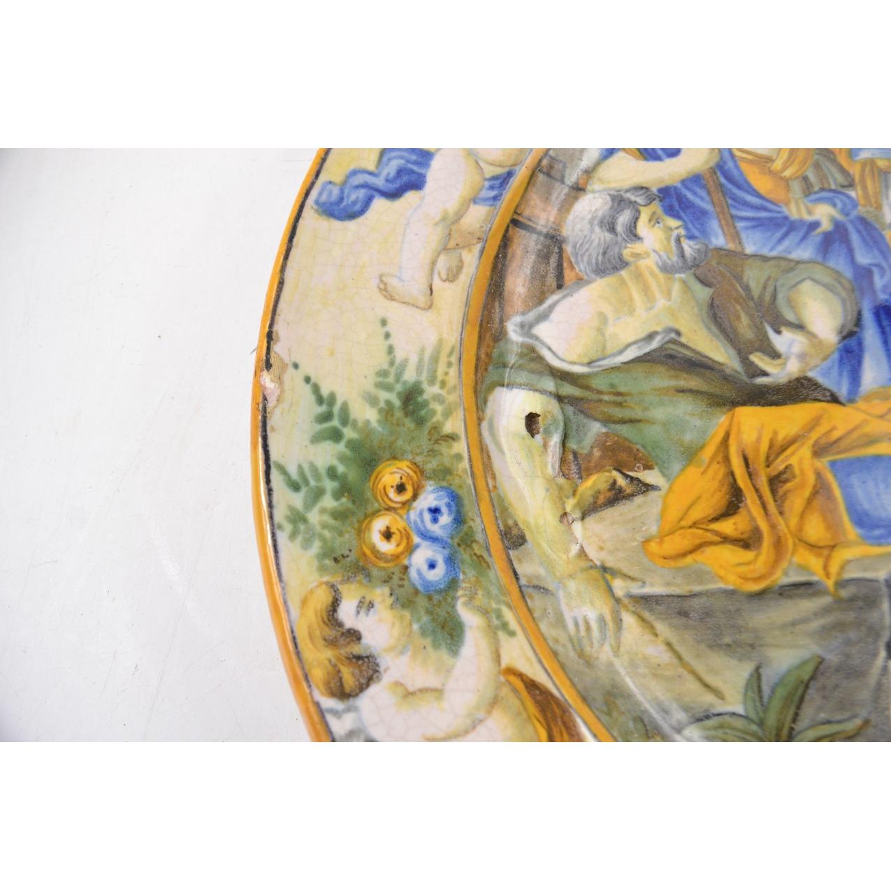Italian Majolica style cherub edged platter, slight edge chip and a natural bubble, otherwise a stunning piece.D: 43cm approx