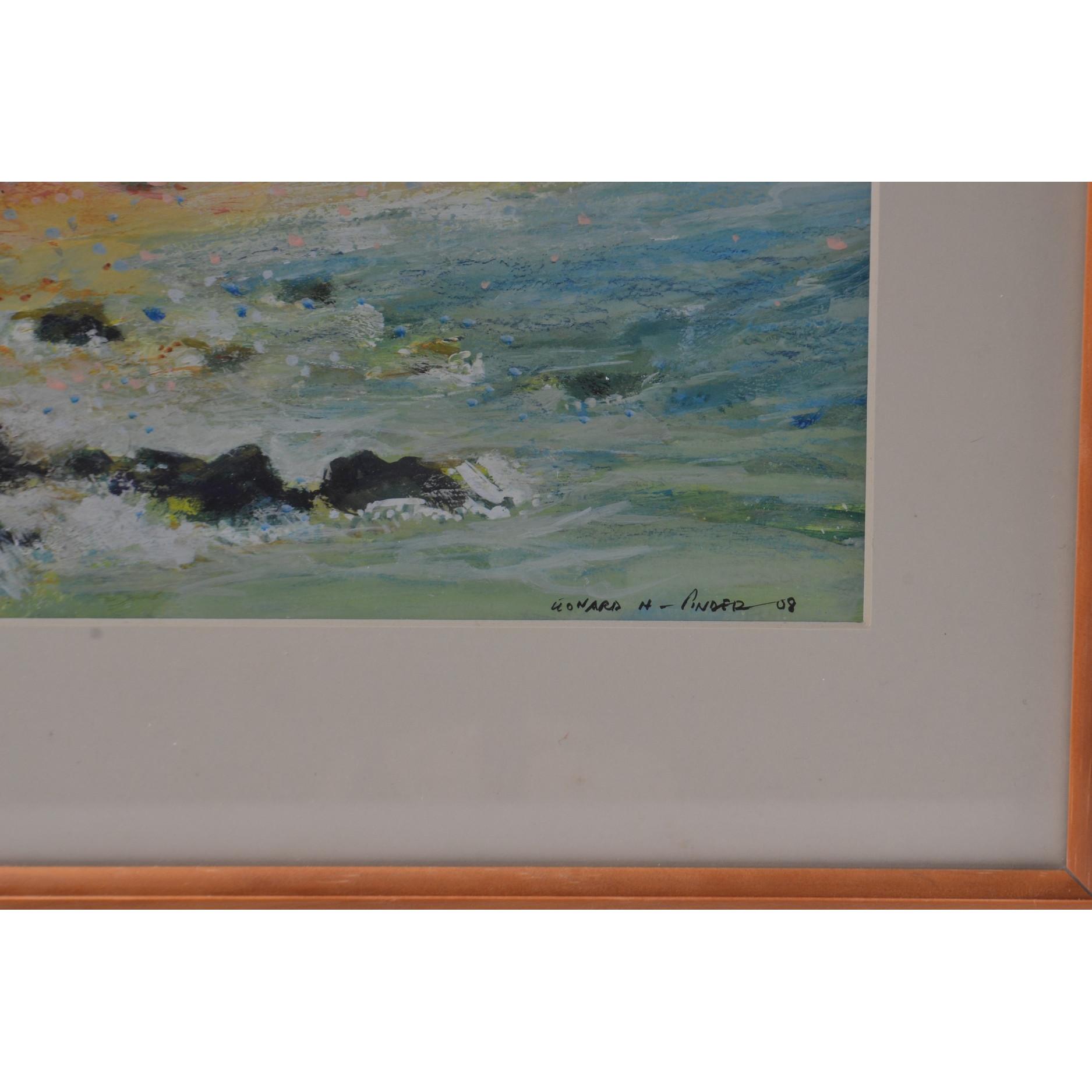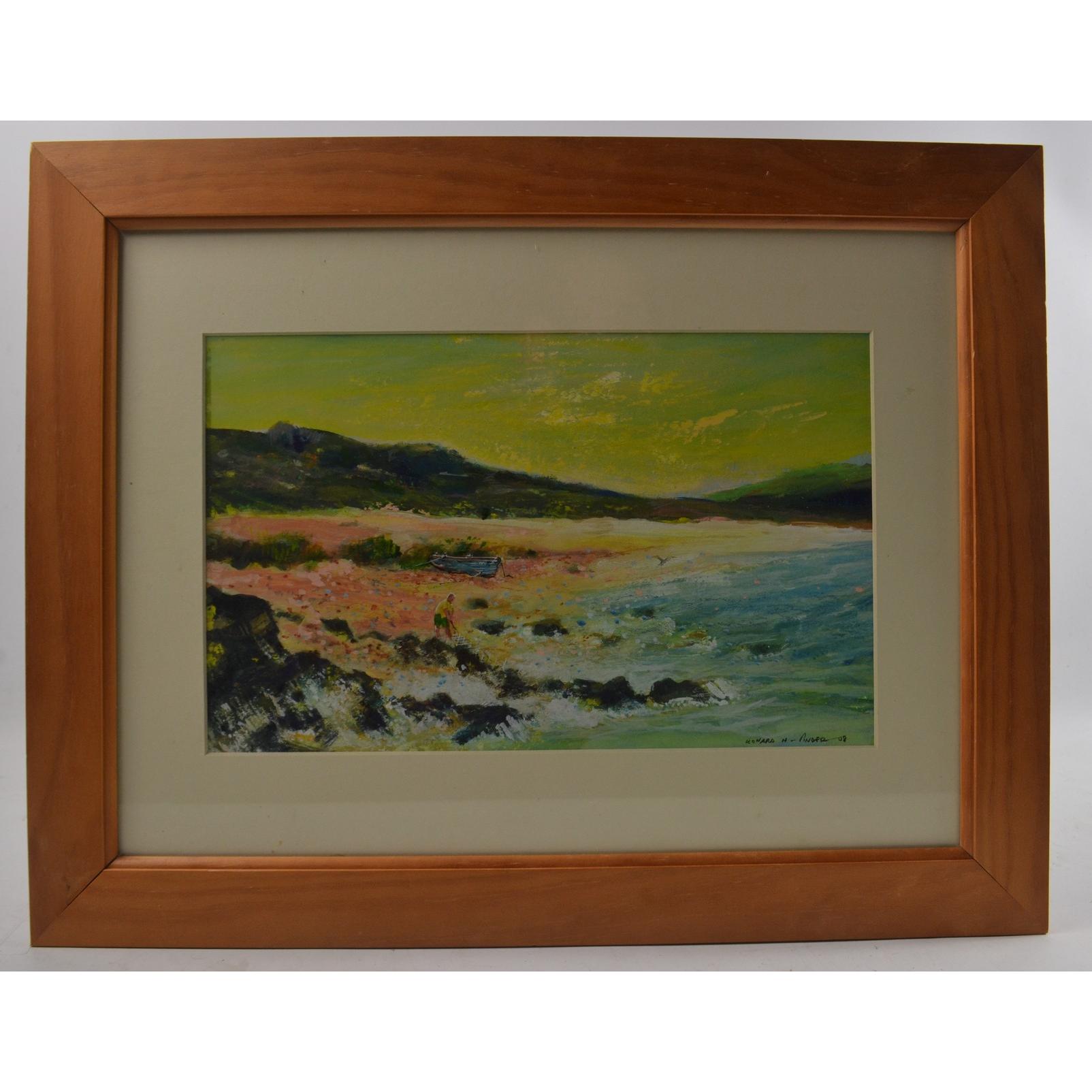 Leonard Pinder British Framed and glazed oil painting of Scottish coastal scene entitled "Bringing in the nets" Dimensions 46 x 36 cm.