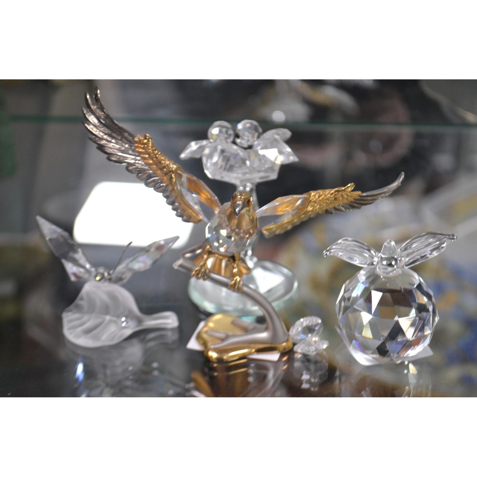 SWOROVSKI , a collection of to include a bird of prey on a branch 7cm H, an apple H 6cm, a butterfly on a leaf 5cm and a a pair of birds perched on a bird table H 8cm and a small oyster with a seed pearl H 1cm