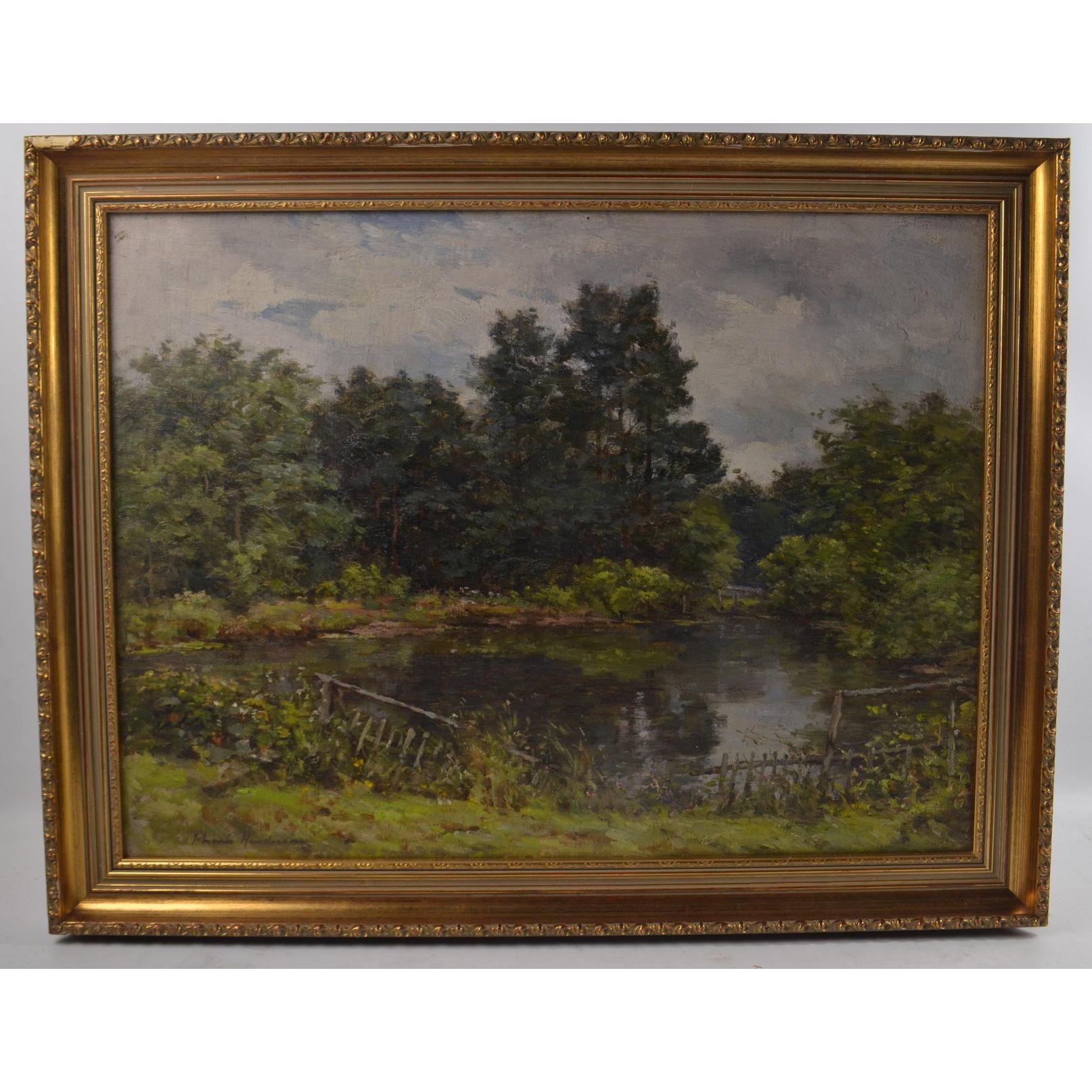 Oil painting on canvas signed lower left waterside scene size 60cm x 45cm approx Scottish Impressionist.