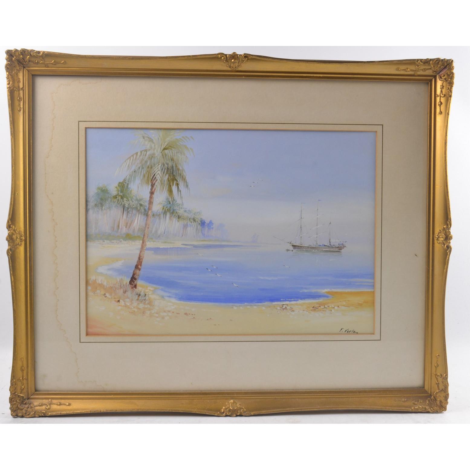 Fred H. Varley British (1881-1969) watercolour c1920's no title tropical bay scene with moored ship