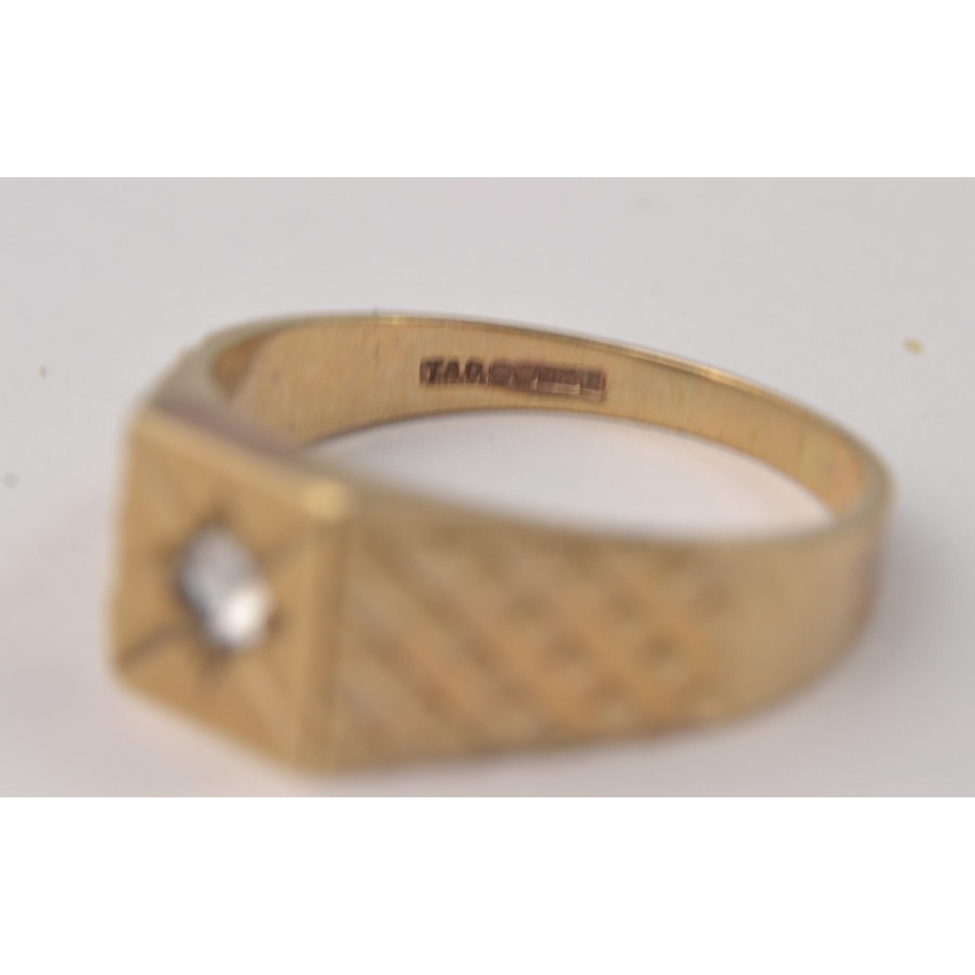 Gents 9ct yellow gold ring set with central clear stone and starburst design. Shoulders with studded design. Size ZGross weight approx 5.2g