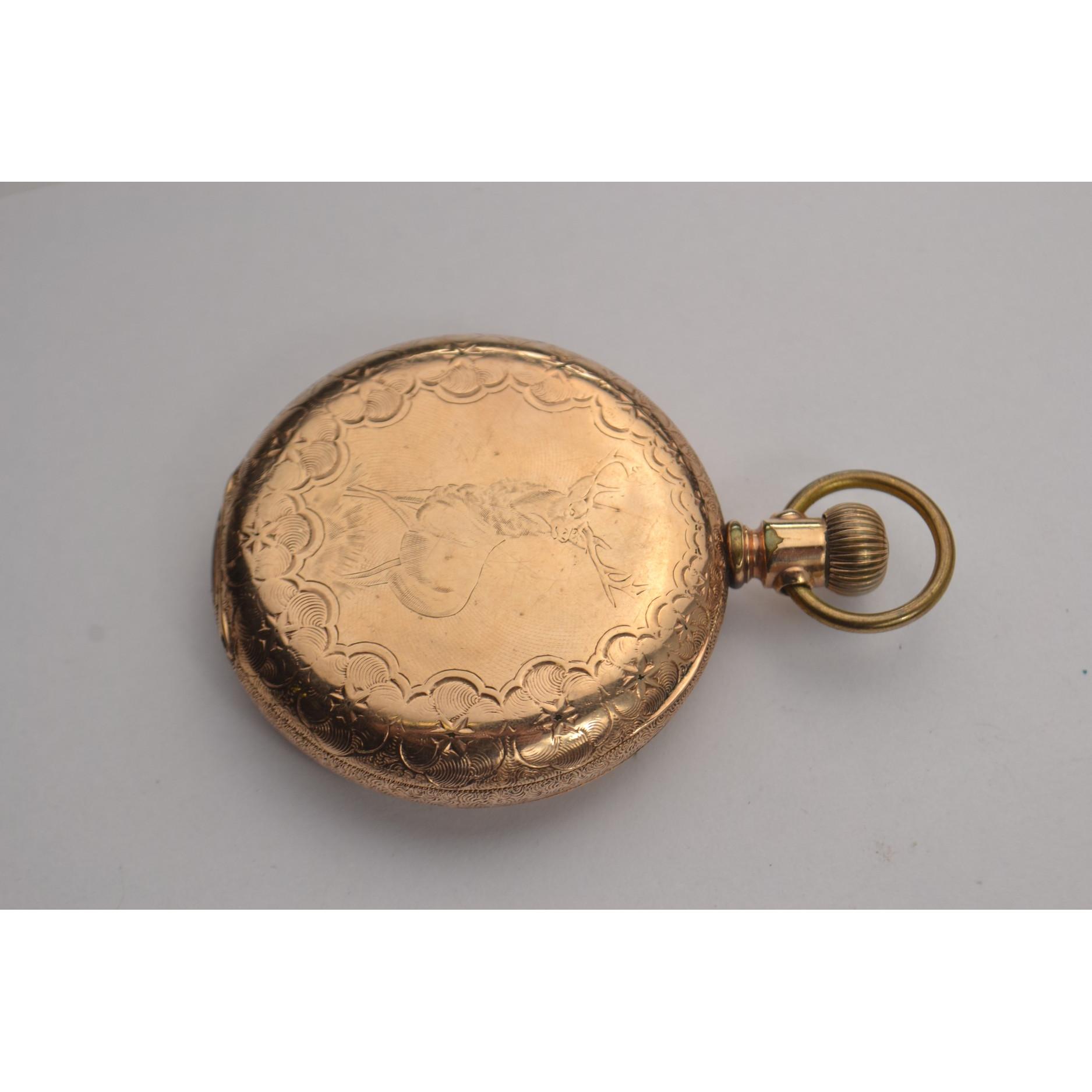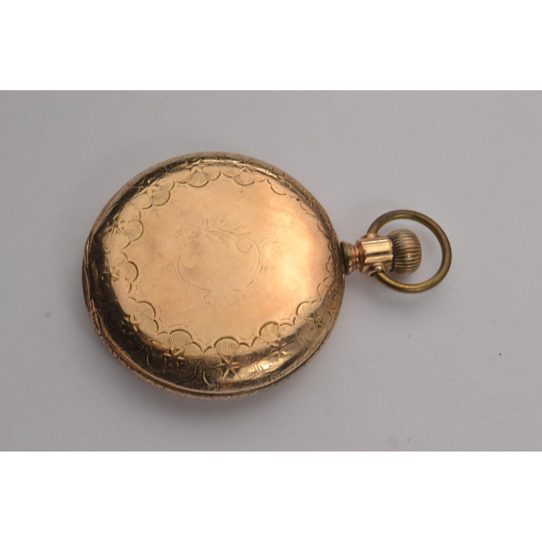 AWW and Co Waltham full Hunter gold plated pocket watch with engraved casing