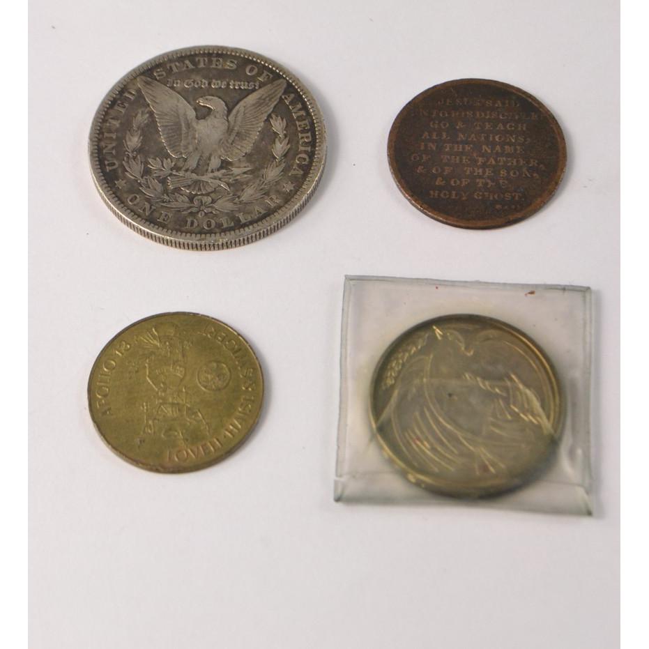 Selection of coins to include 1888 silver dollar, dove of peace £2 1995 coin, commemorative Apollo 13 coin (unusual) and a coin with bible verse on each side (4)Approx 4 pieces