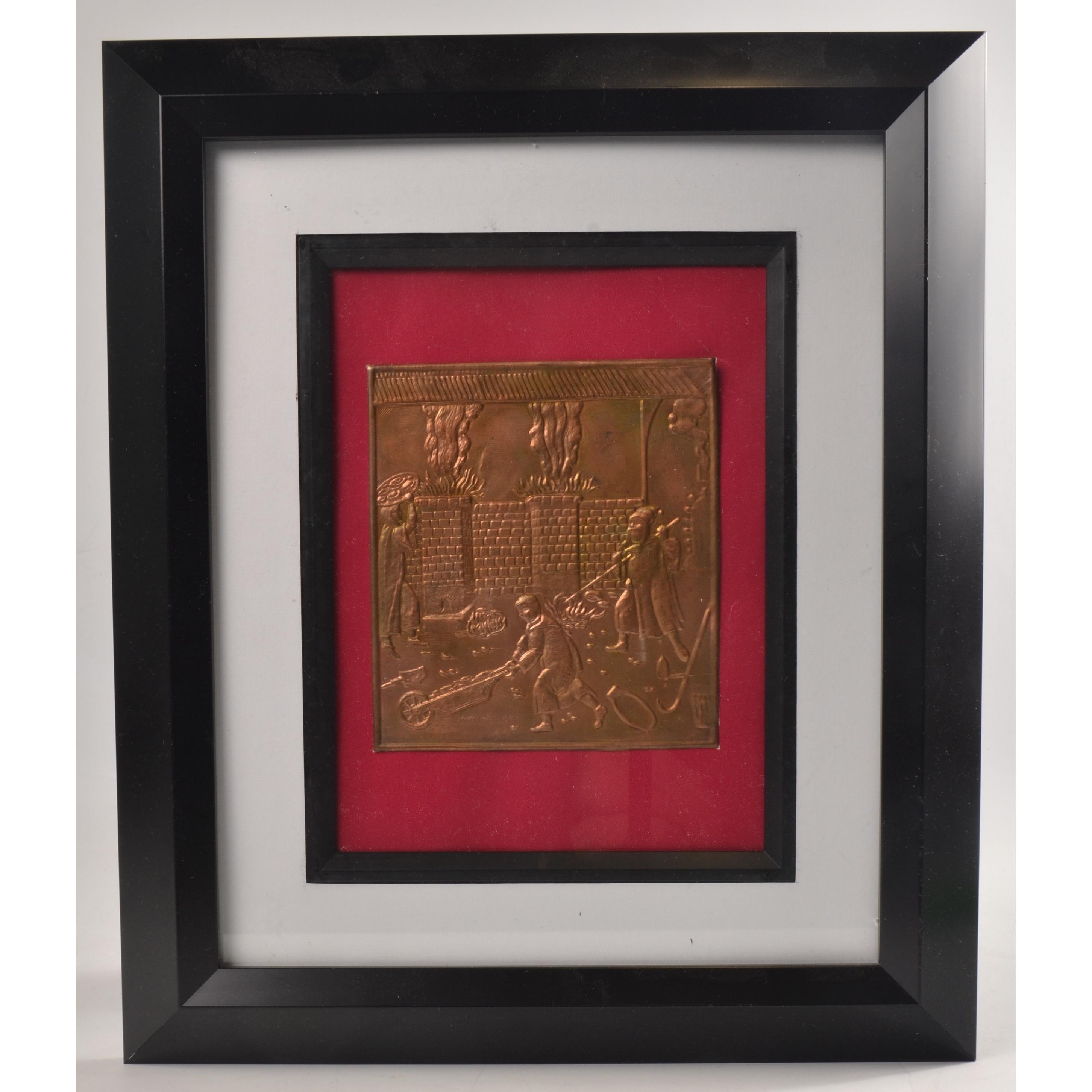 LILIAS LALOUNIS 'Metallurgy' beaten copper on bronze plate attributed & Stamped, Greek Jeweller, artist and academician, 125mm x 115mm x 3mm