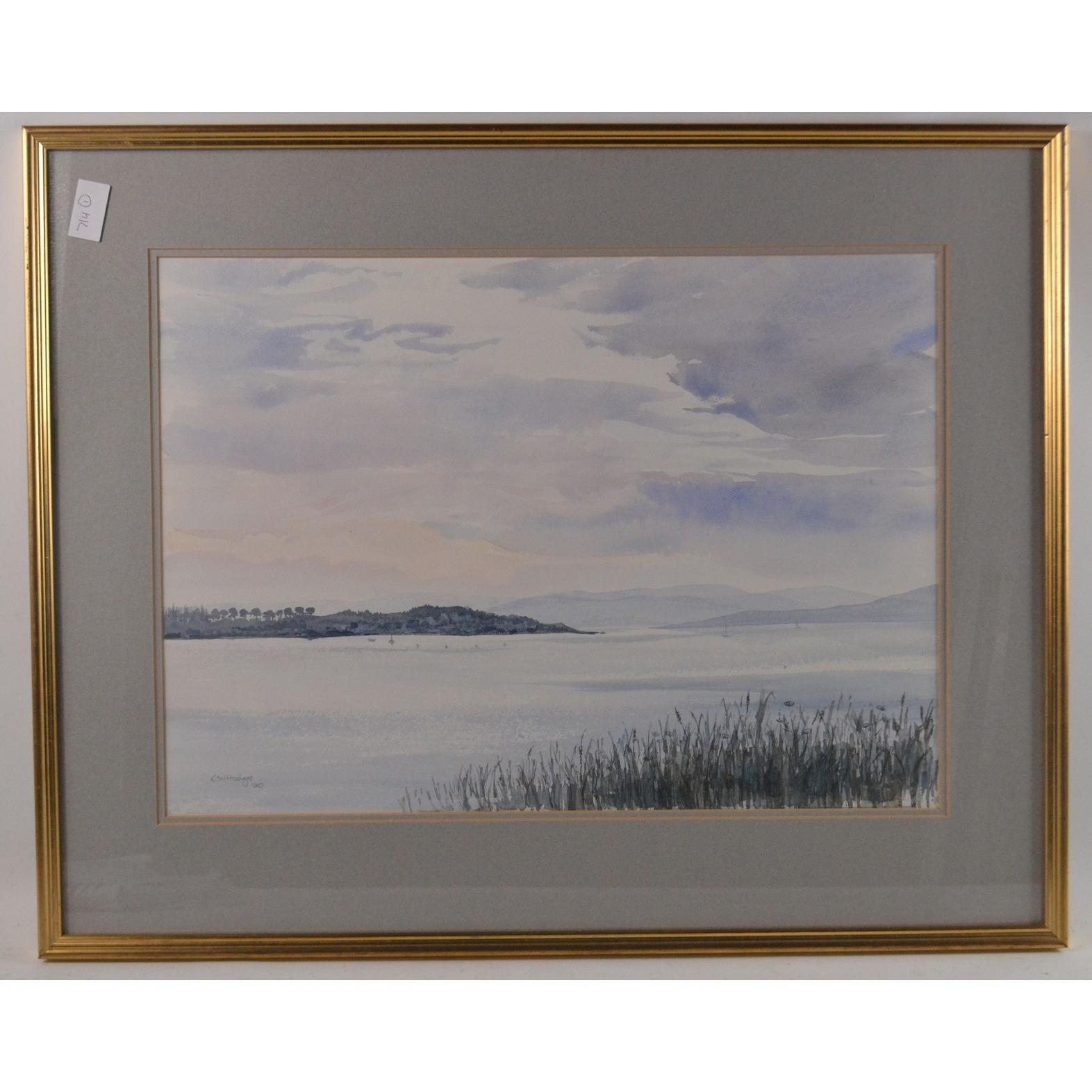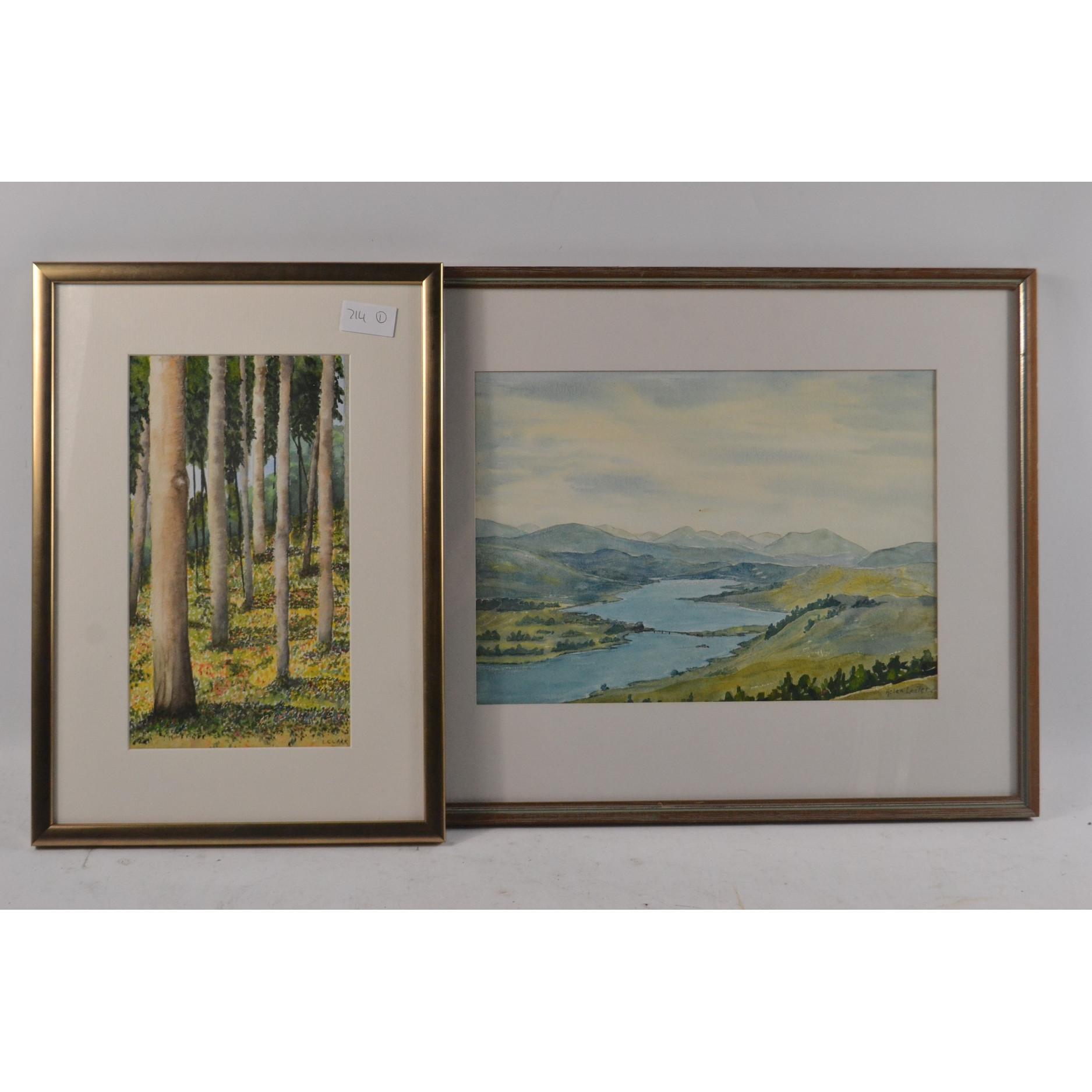 Watercolour of a silver birch forest scene 27.5cm x 15cm and also A Loch Garry watercolour by Helen Lester 34cm x 24cm and an EW Hodge 38cm x 52cm lake scene signed pencil Approx 3 pieces