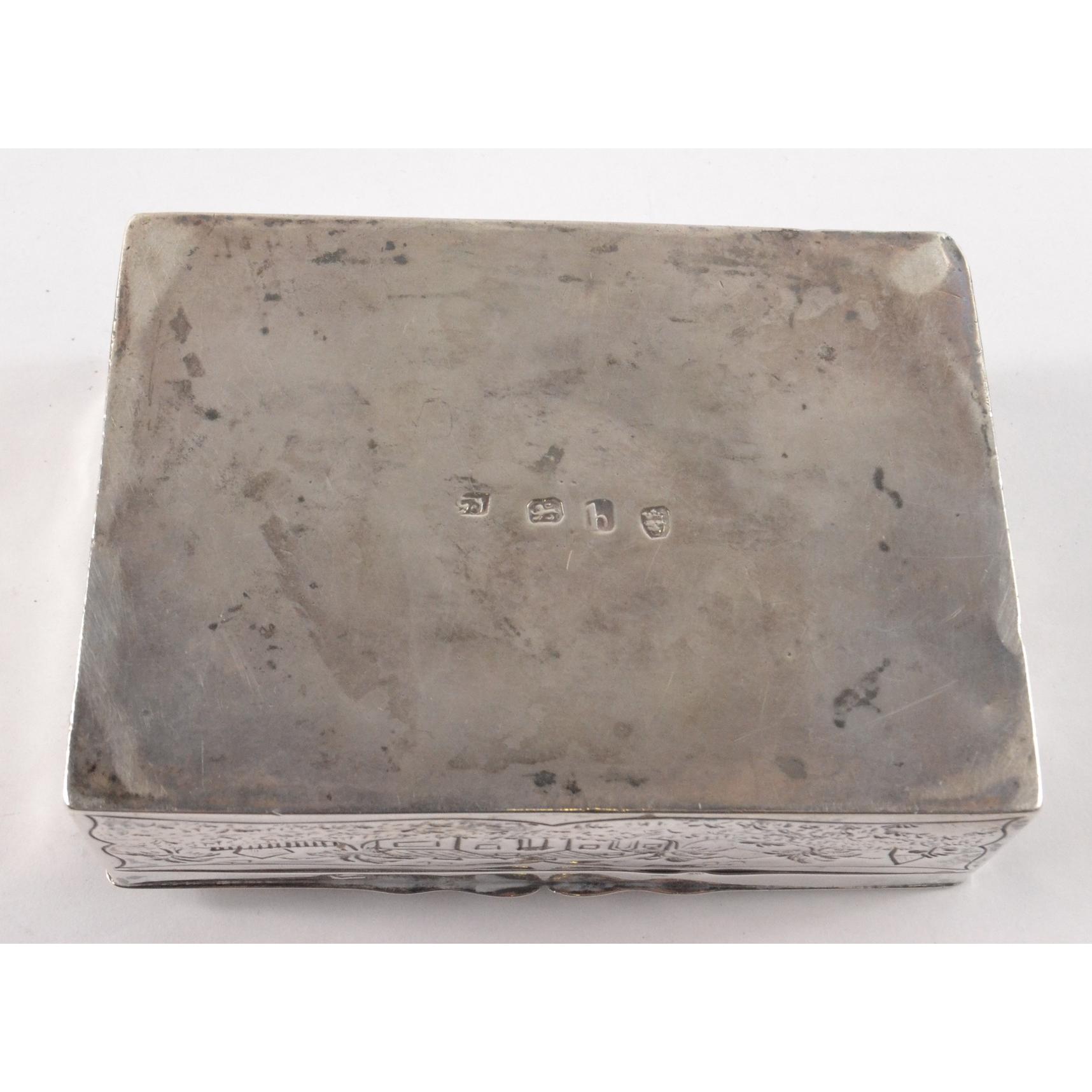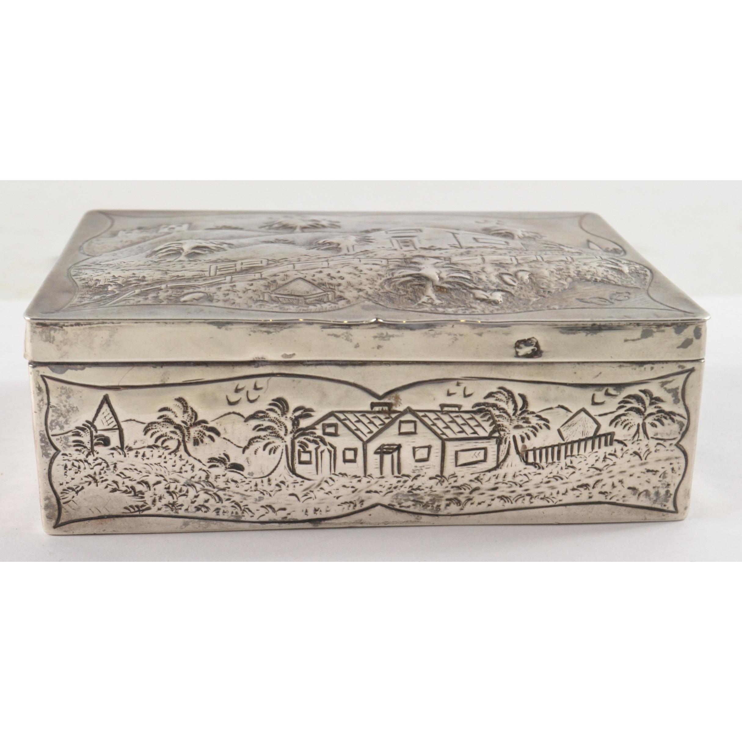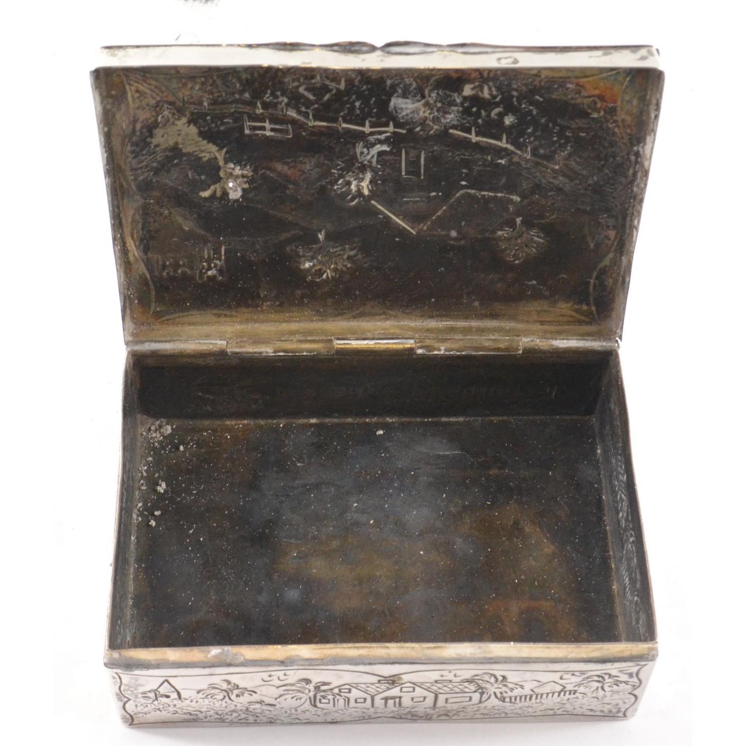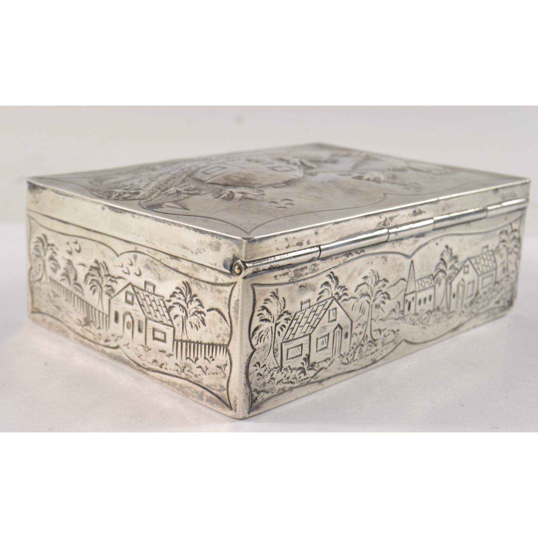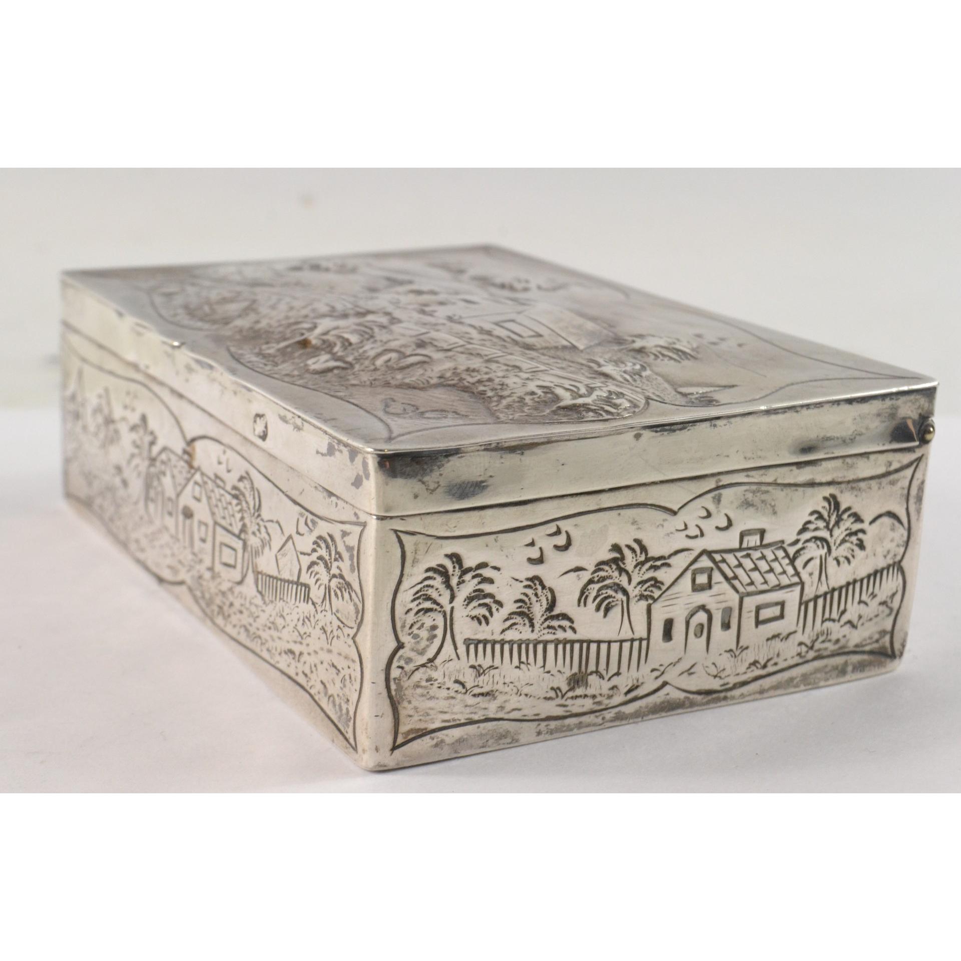 Embossed London silver cigarette box depicting rural scene with castle and housesW: 12cm approx