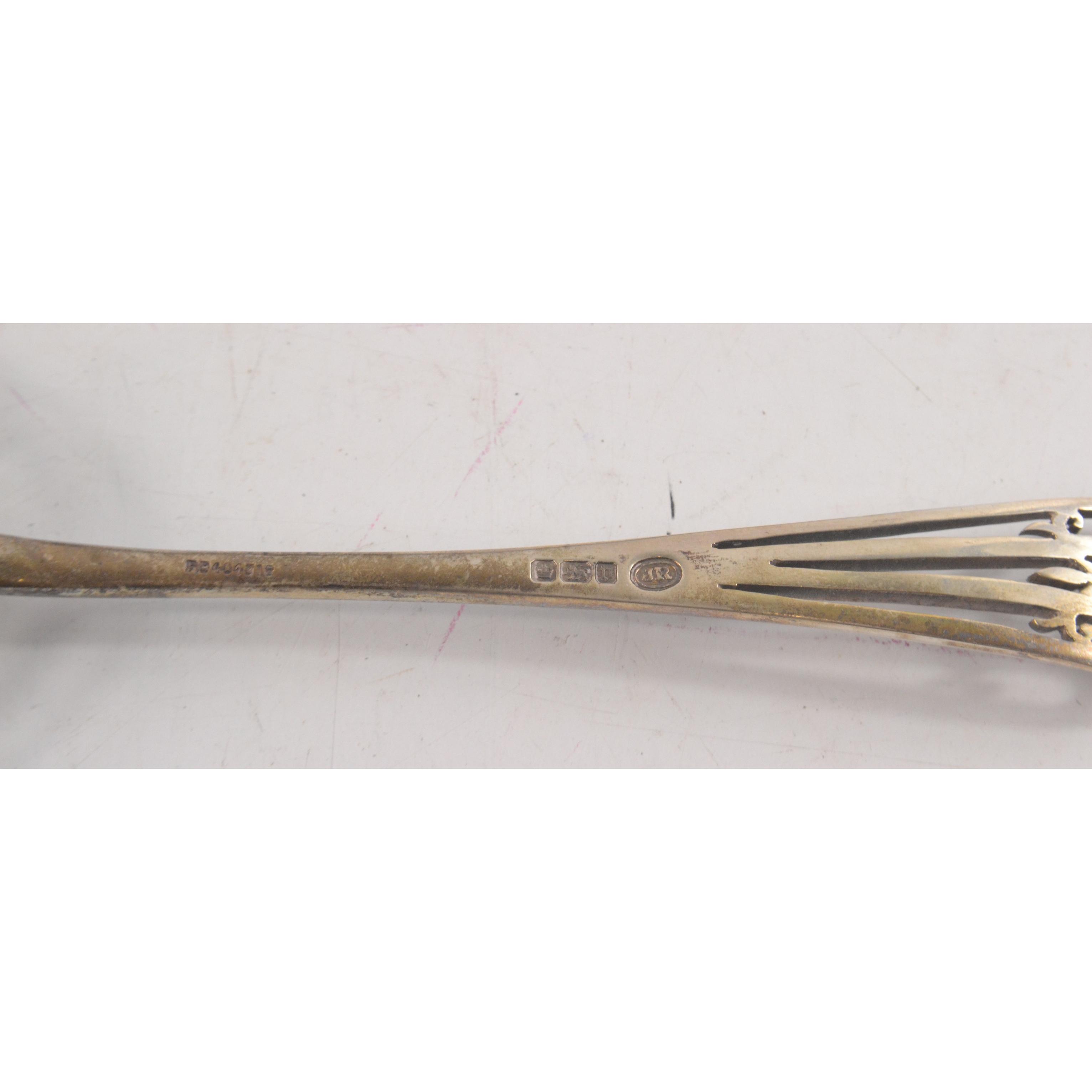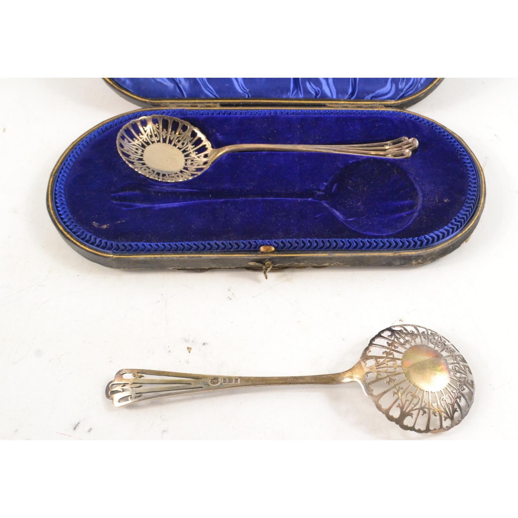 Pair of London Silver slotted serving spoons with pierced design in fitted case (spoons 20cm)