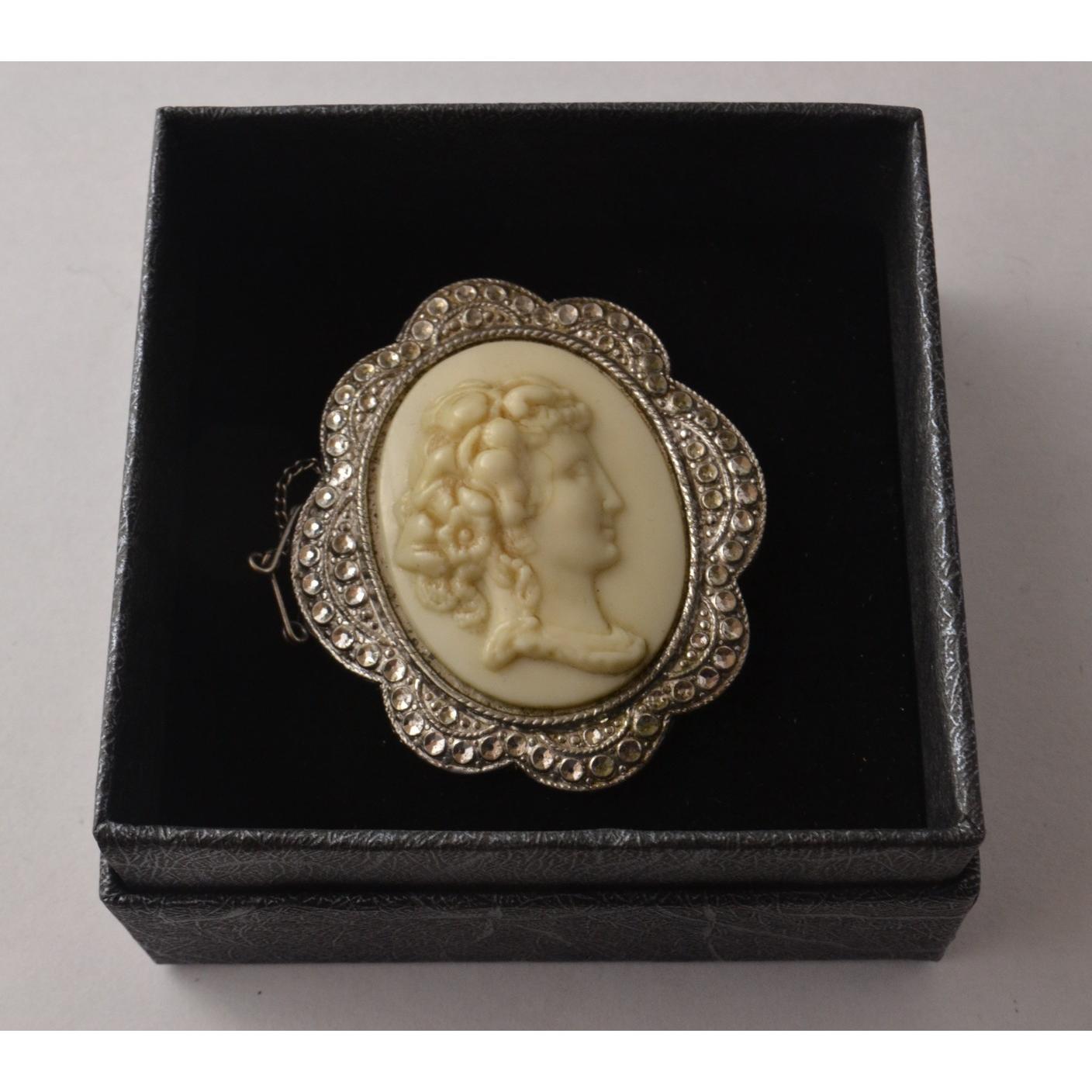 Vintage Charles Horner Chester silver and casein cameo brooch dating to 1948. With safety chain and in a boxL: 5cm approx W: 4.5cm approx Gross weight approx 14.1g