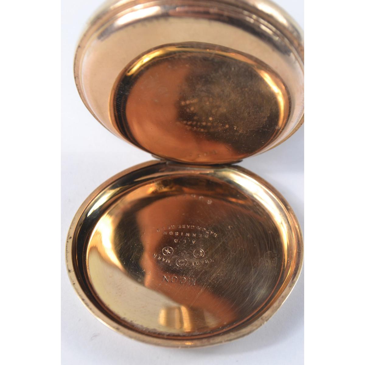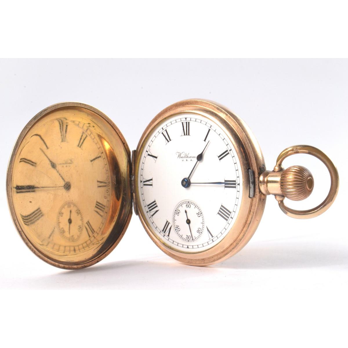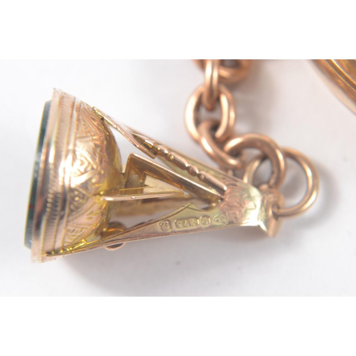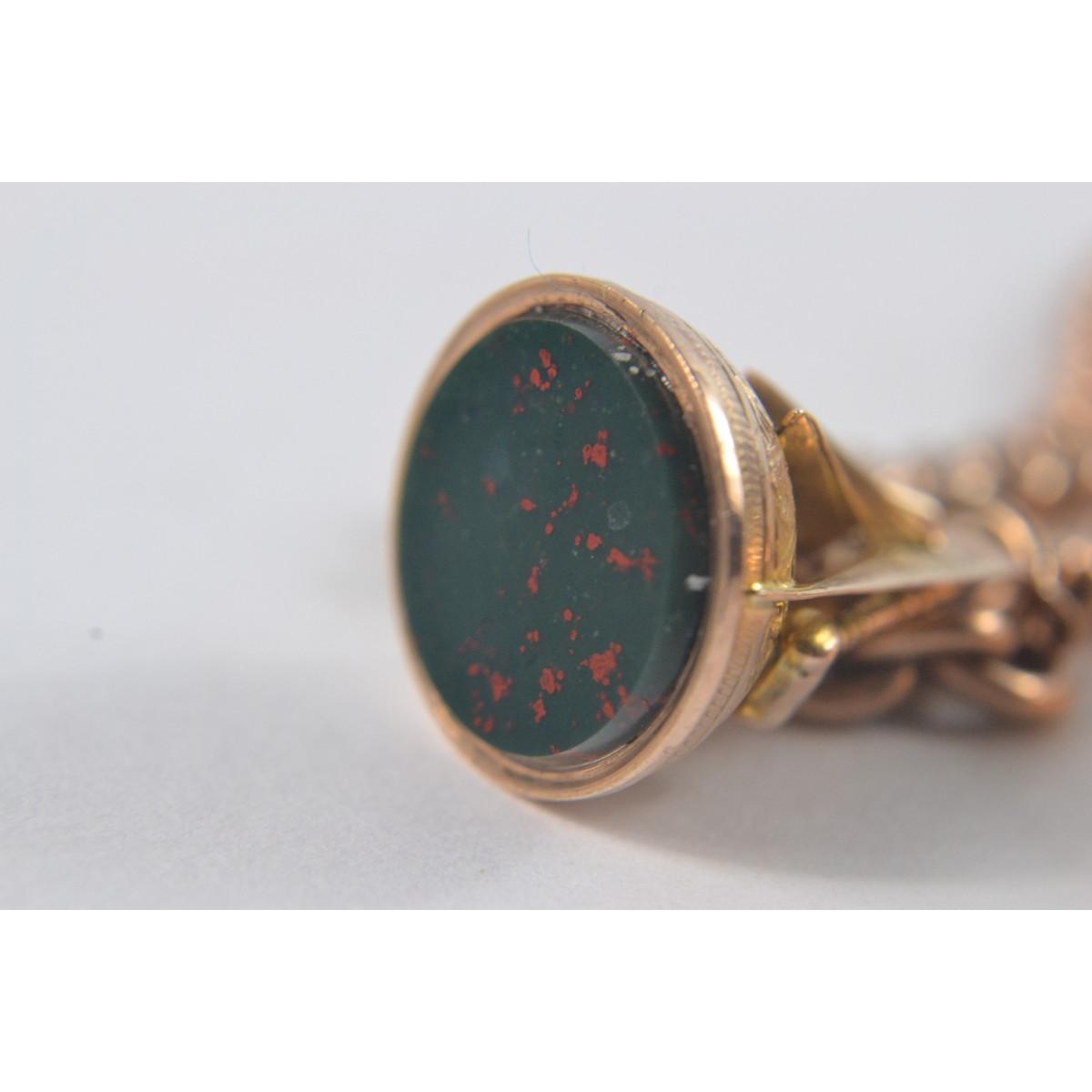 375 stamped gold fob chain with 375 stamped gold staked fob with blood stone, 45g gross weight , with a gold plated Waltham fob watch