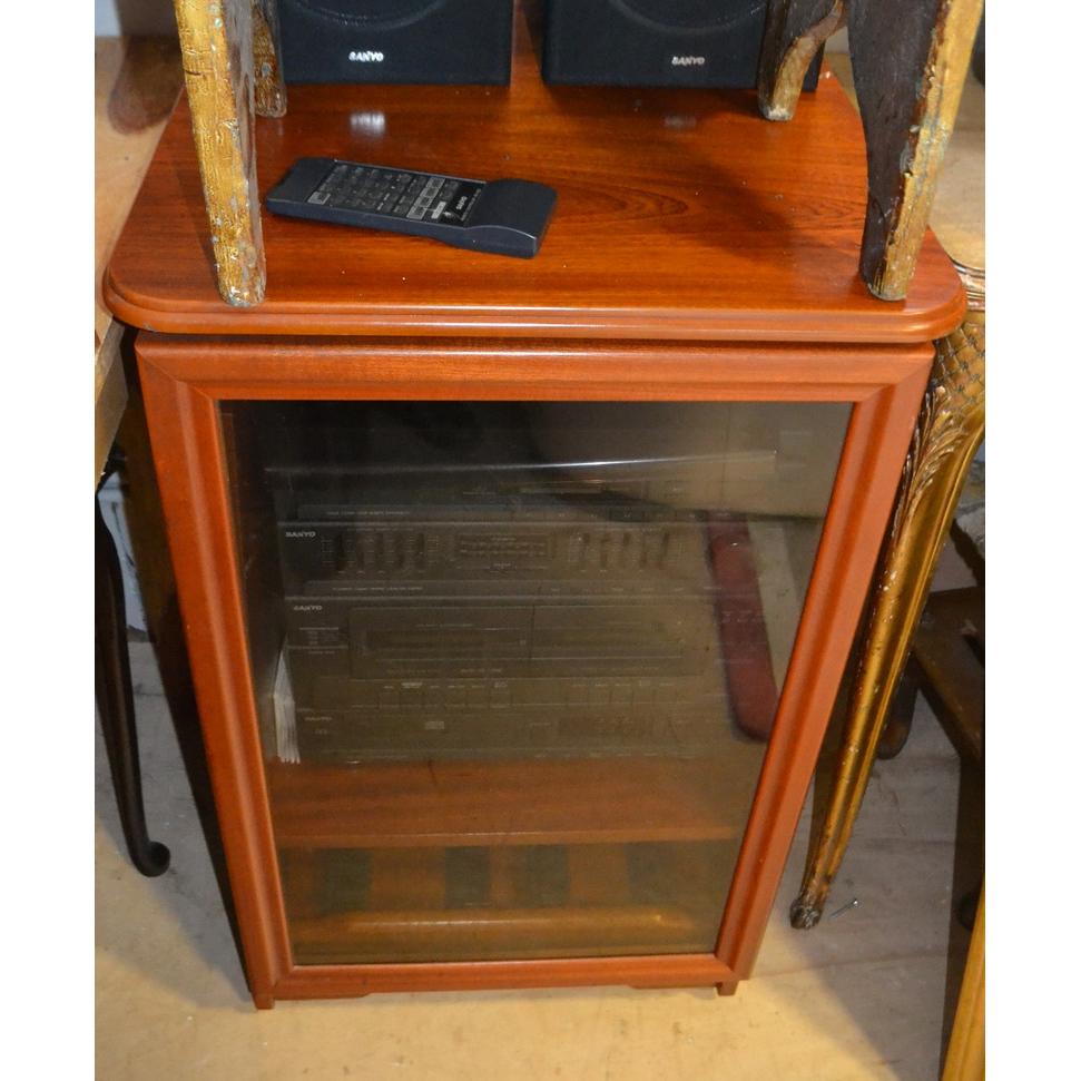 Sanyo hi-fi system with speakers in dark wood media cabinet