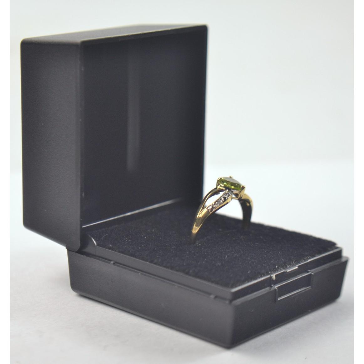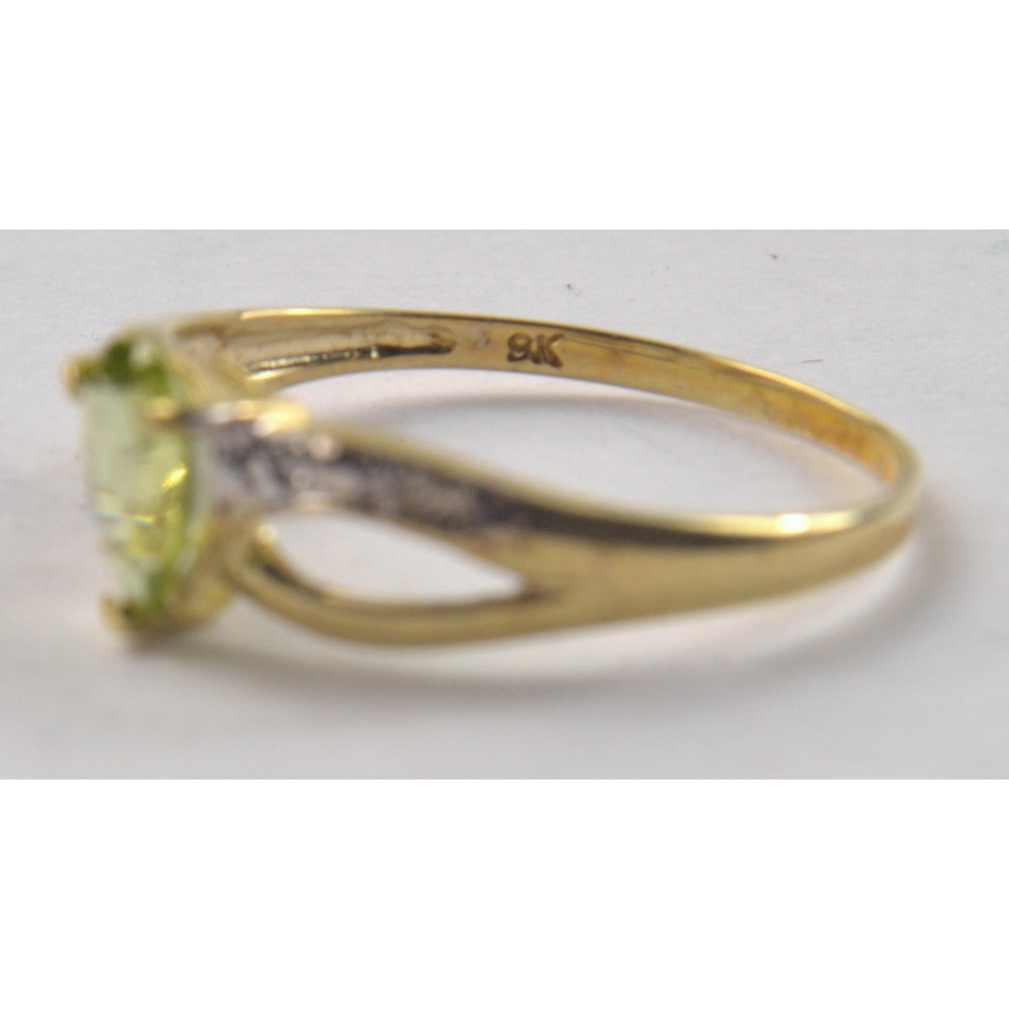 375 stamped (9ct gold) ring set with pear shaped peridot and 2 small diamonds. Size O. In ring boxGross weight approx 1.1g