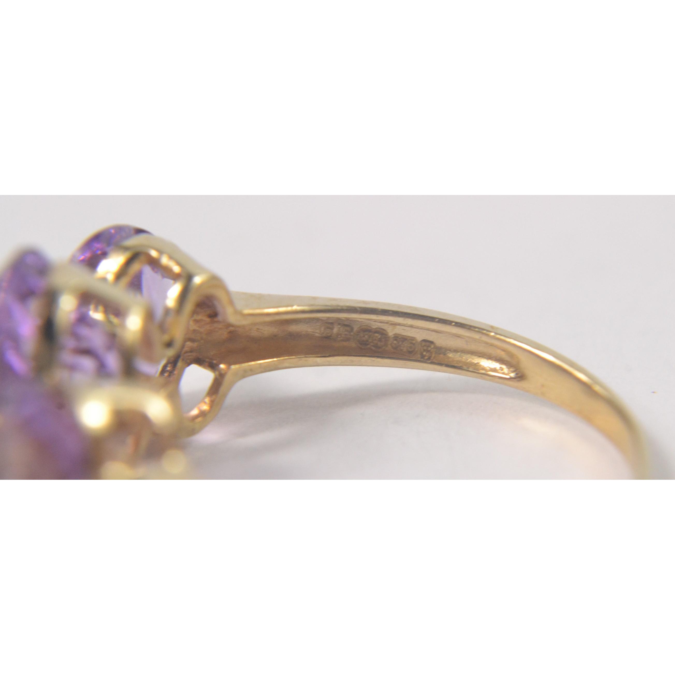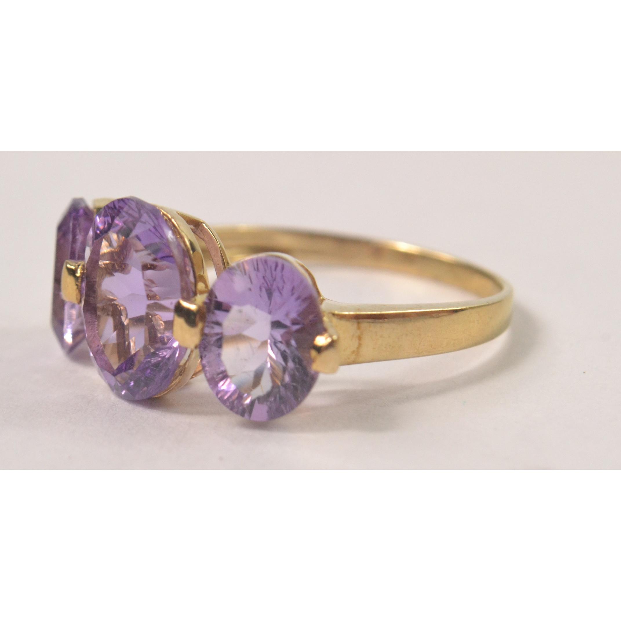 9ct Yellow gold pale Amethyst 3 stone ring. size P [2.75grm]