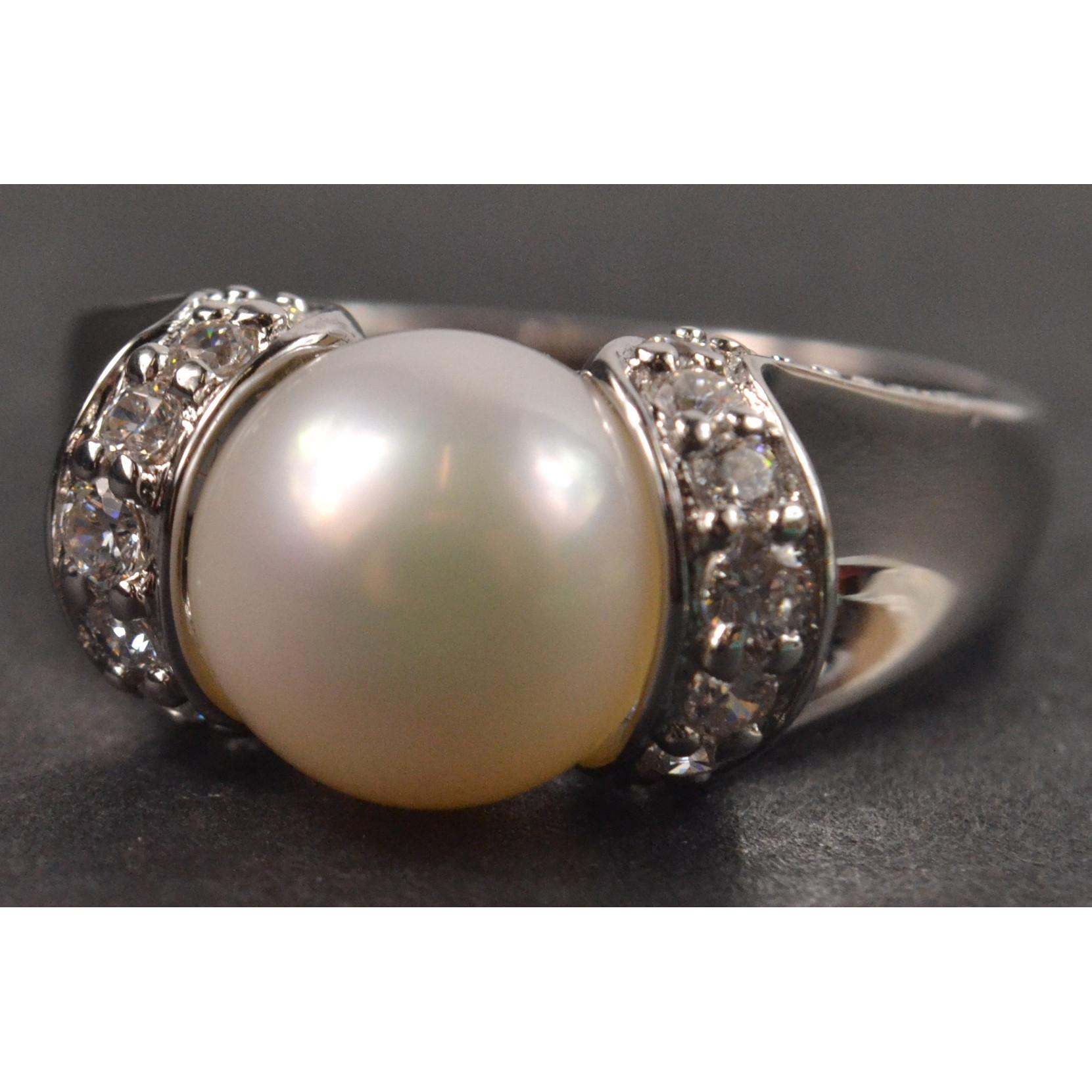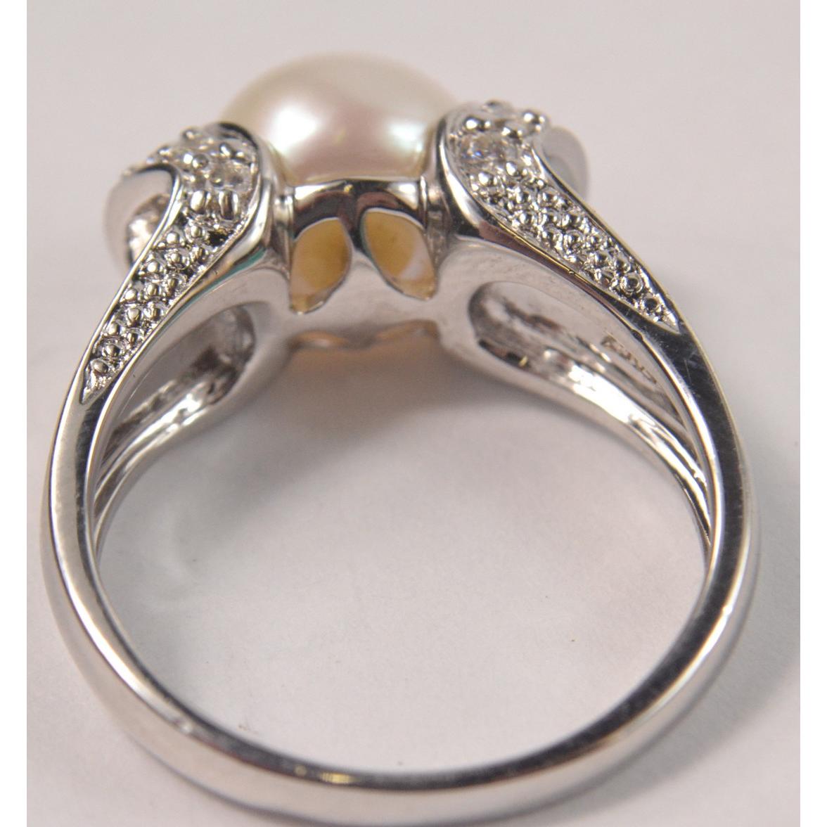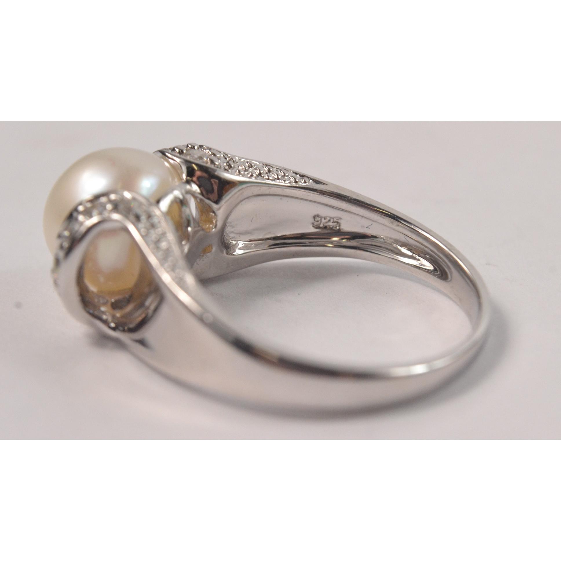 925 Silver stamped ring set with central pearl style stone and clear stone shoulders Size QGross weight approx 5.8grms