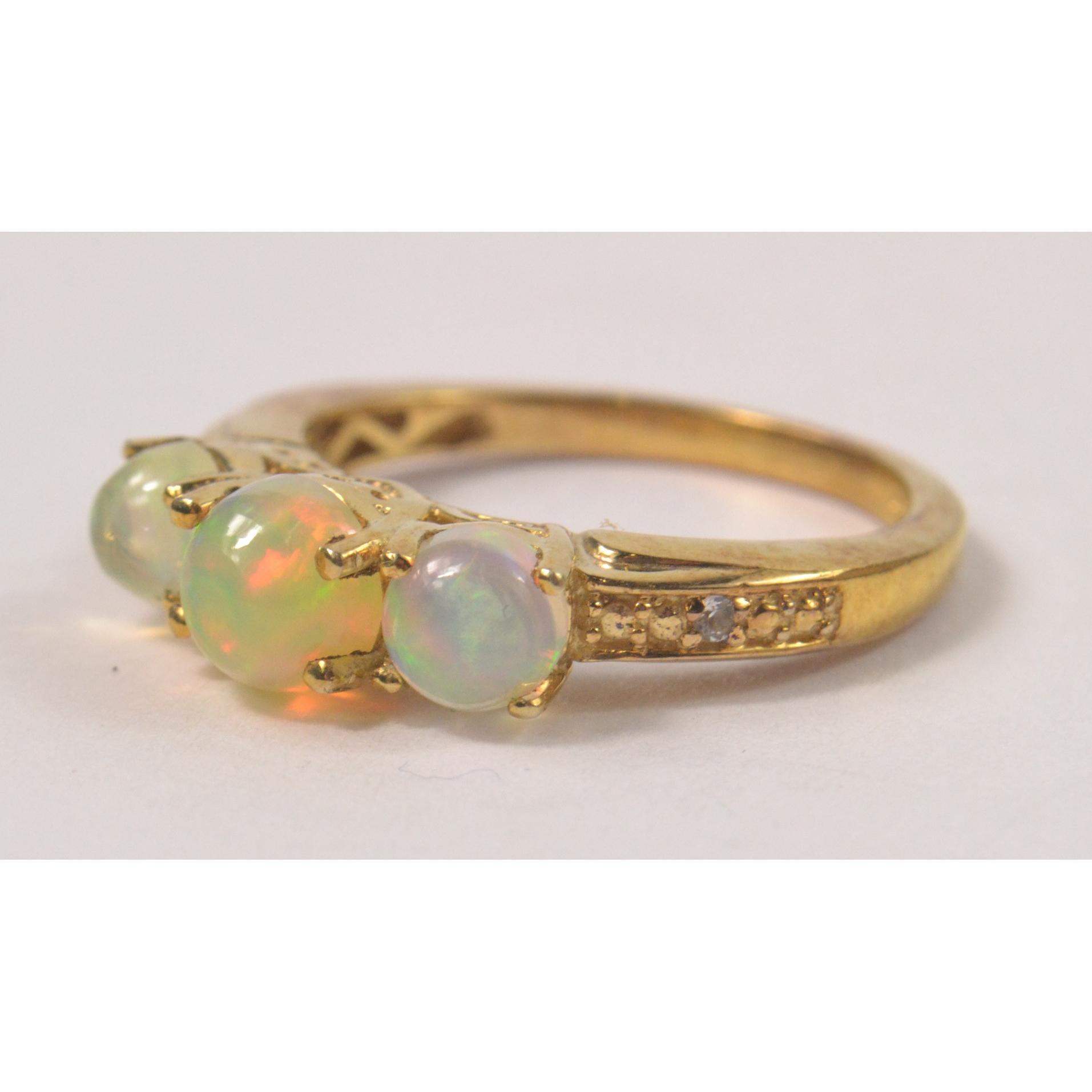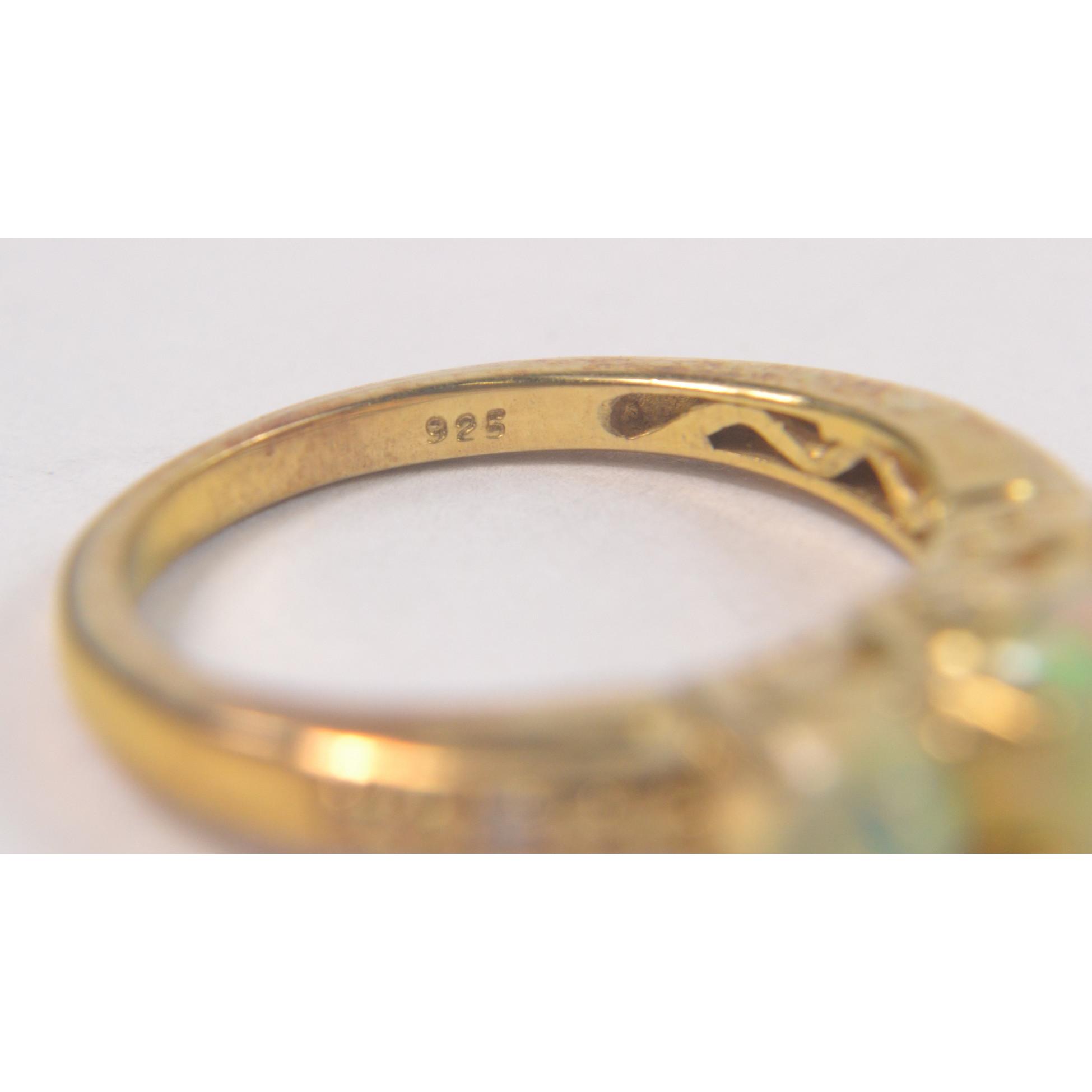 Gilded 925 stamped ring set with 3 graduated pale green stones Size PGross weight approx 3.5grms