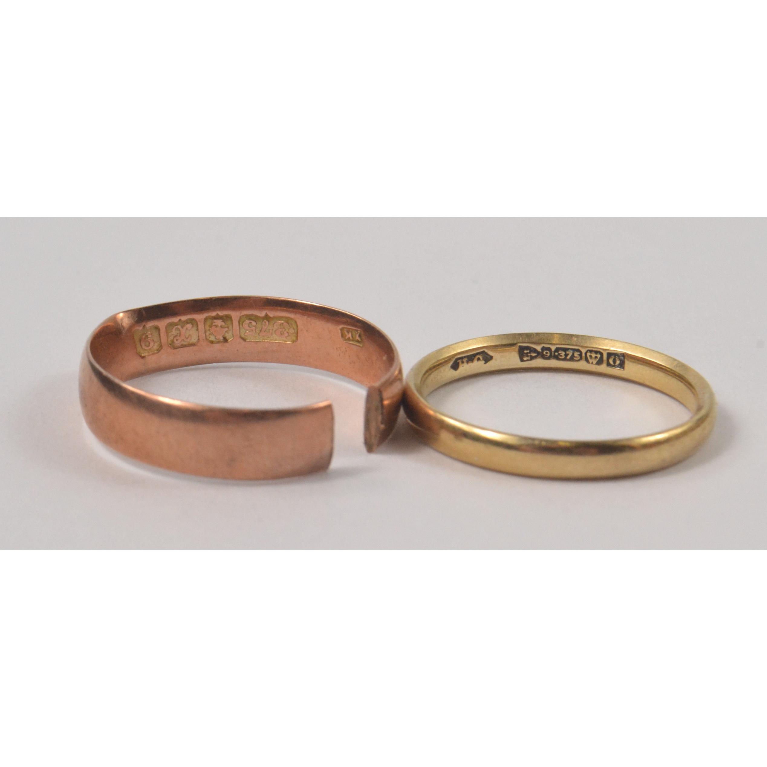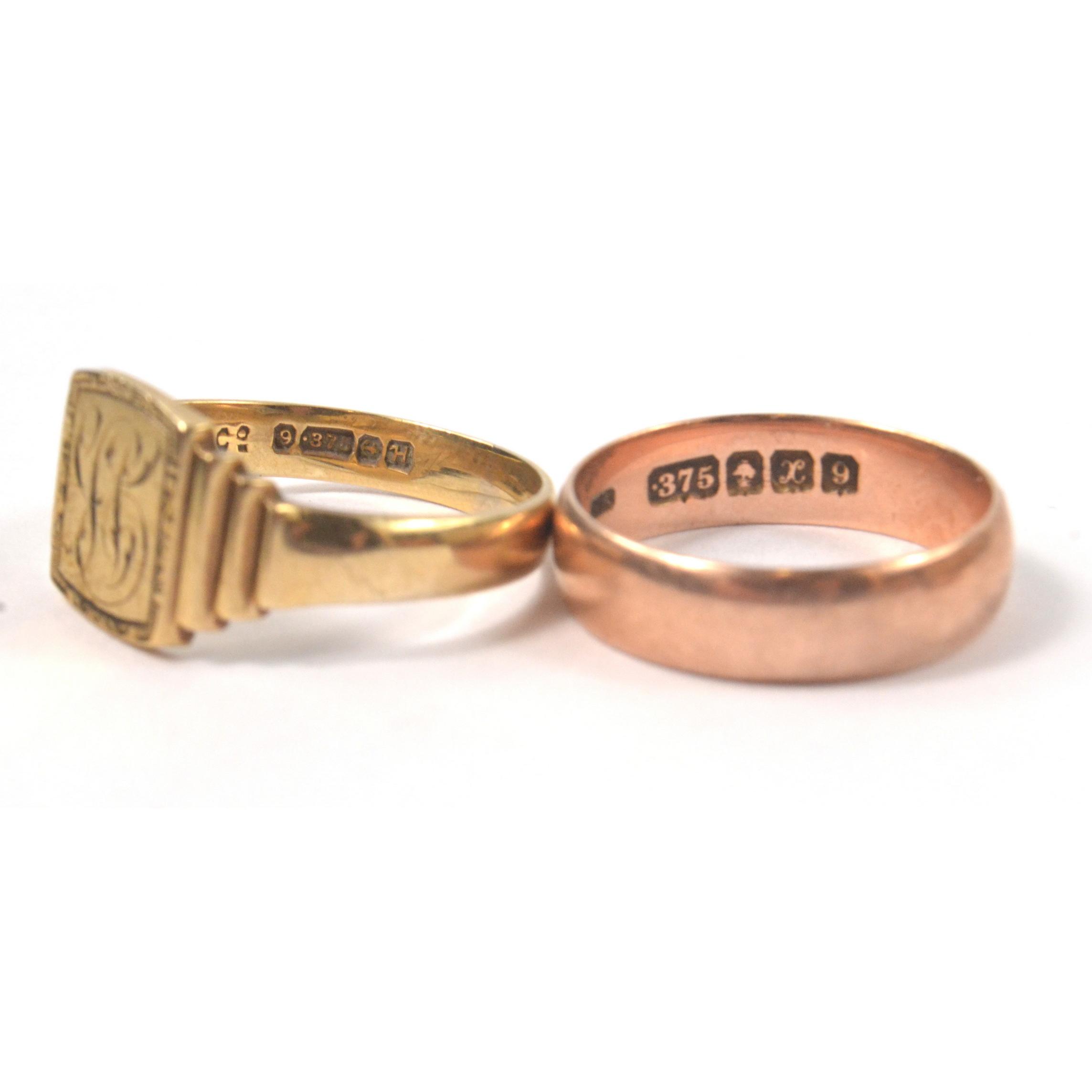 375 stamped gold wedding band ring size P 1.98g, another 375 stamped gold wedding band which has been cut ring size R weight 2.58g, another thicker 375 stamped wedding band ring size S 3.82g, and a 375 stamped gold signet ring, ring size V weight 4.65g
