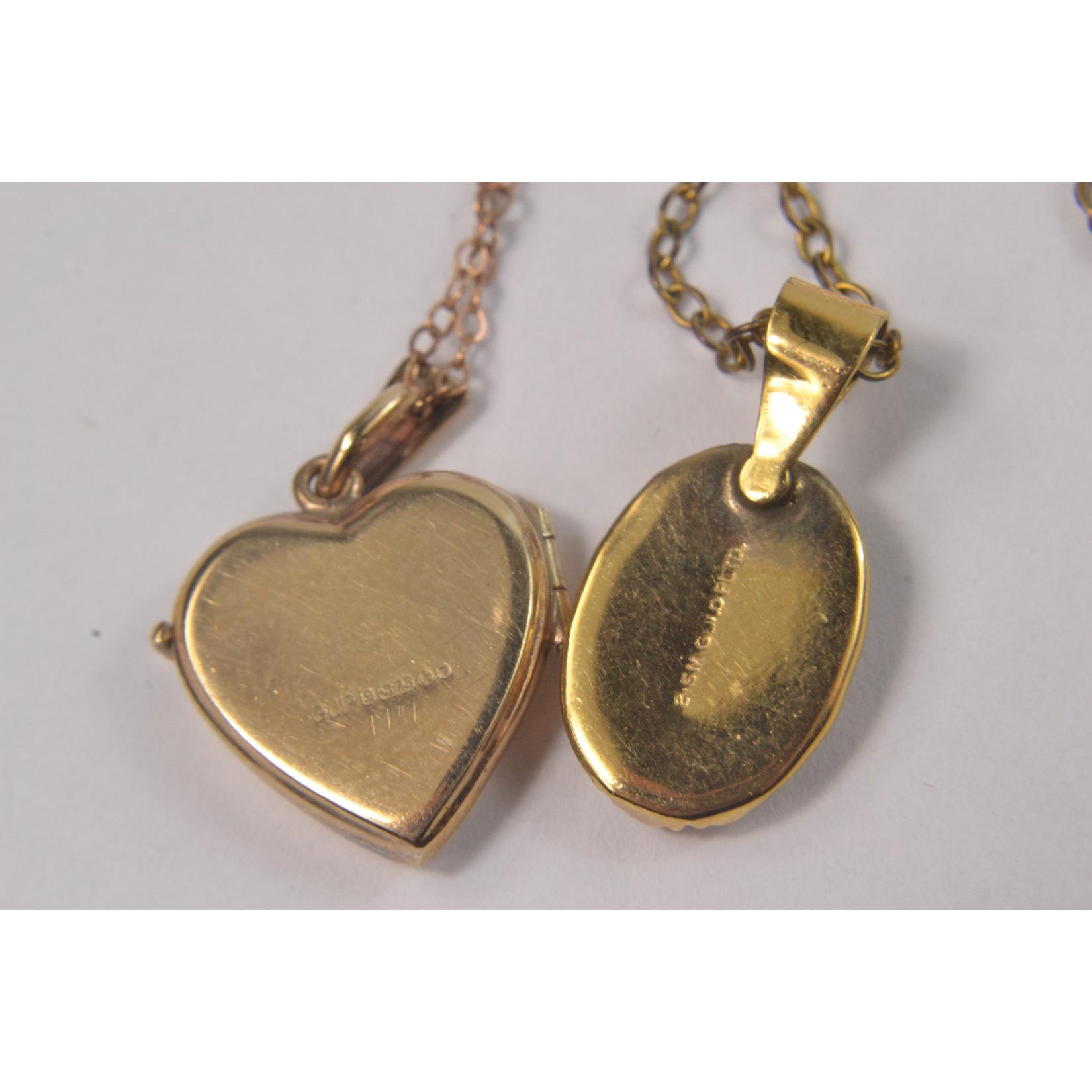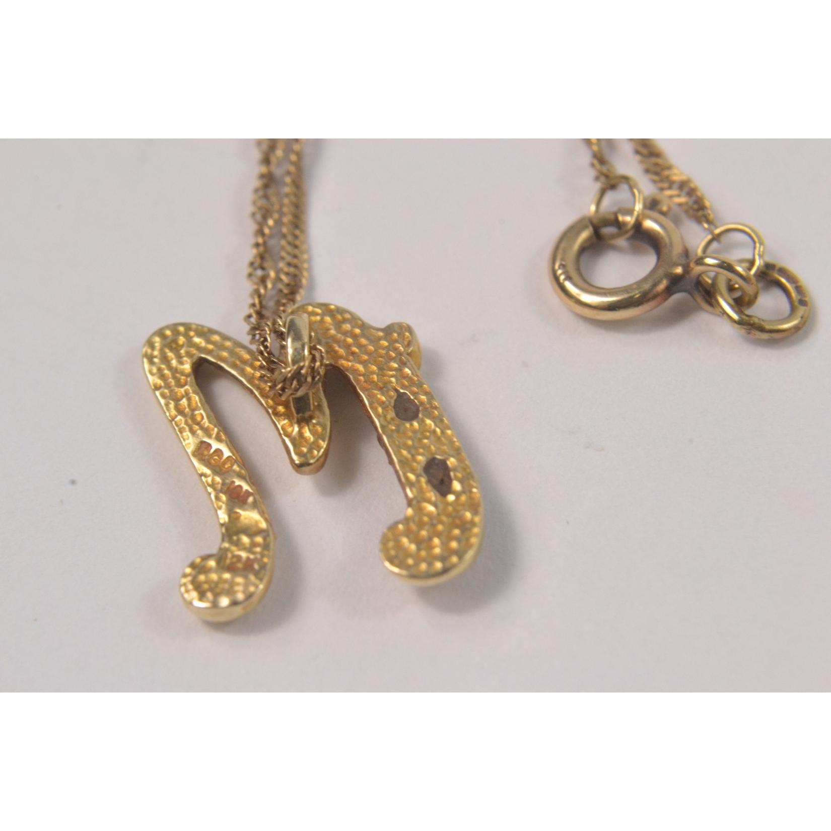 12k stamped letter M gold on a 375 stamped very fine gold chain gross weight 2.09g, also a 375 stamped gold heart shaped locket on a 'yellow metal' chain weight 2.89 gross and a vintage gold plated small cameo pendant on a chain