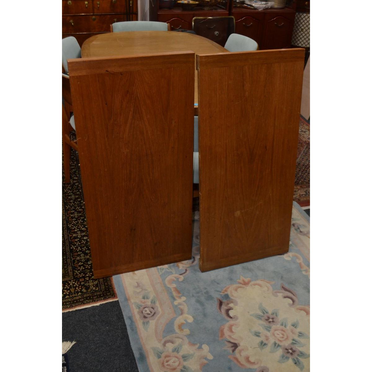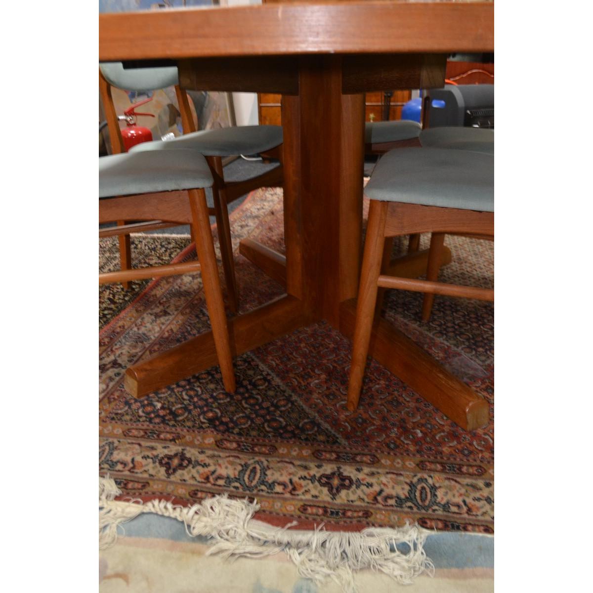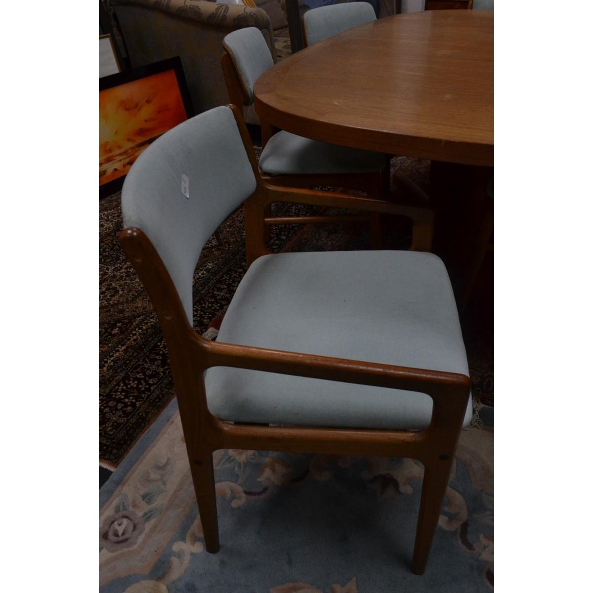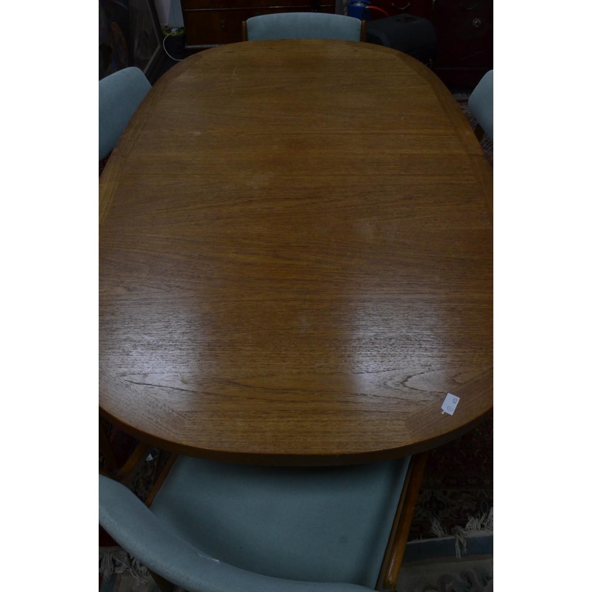 RARE Danish extending dining table c1960’s /70’s 6ft unextended with 2 extending leafs extends to 9ft approx with 2 matching teak carvers and 4 matching dining chairs all in a green velour style fabric