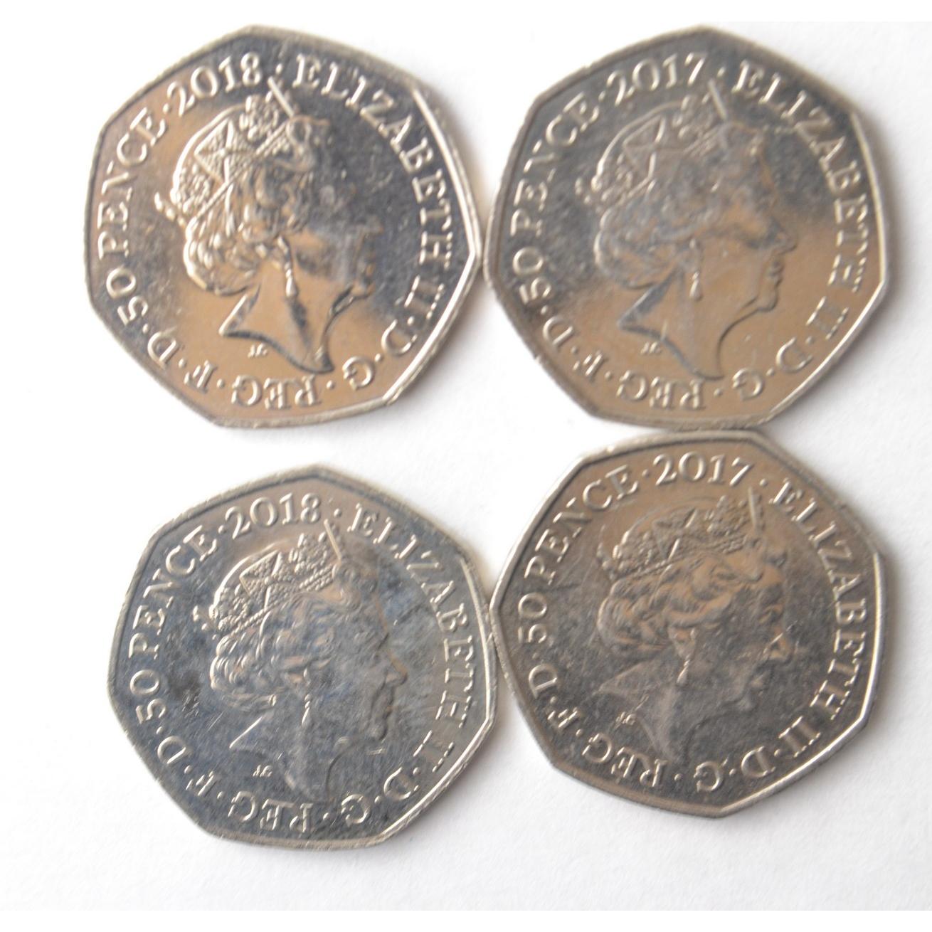 A collection of 2 fifty pence pieces Benjamin Bunny and Tom Kitten (2017), and 2 Representation of The People Act 1918-2018 mint year, in good condition Approx 4 pieces