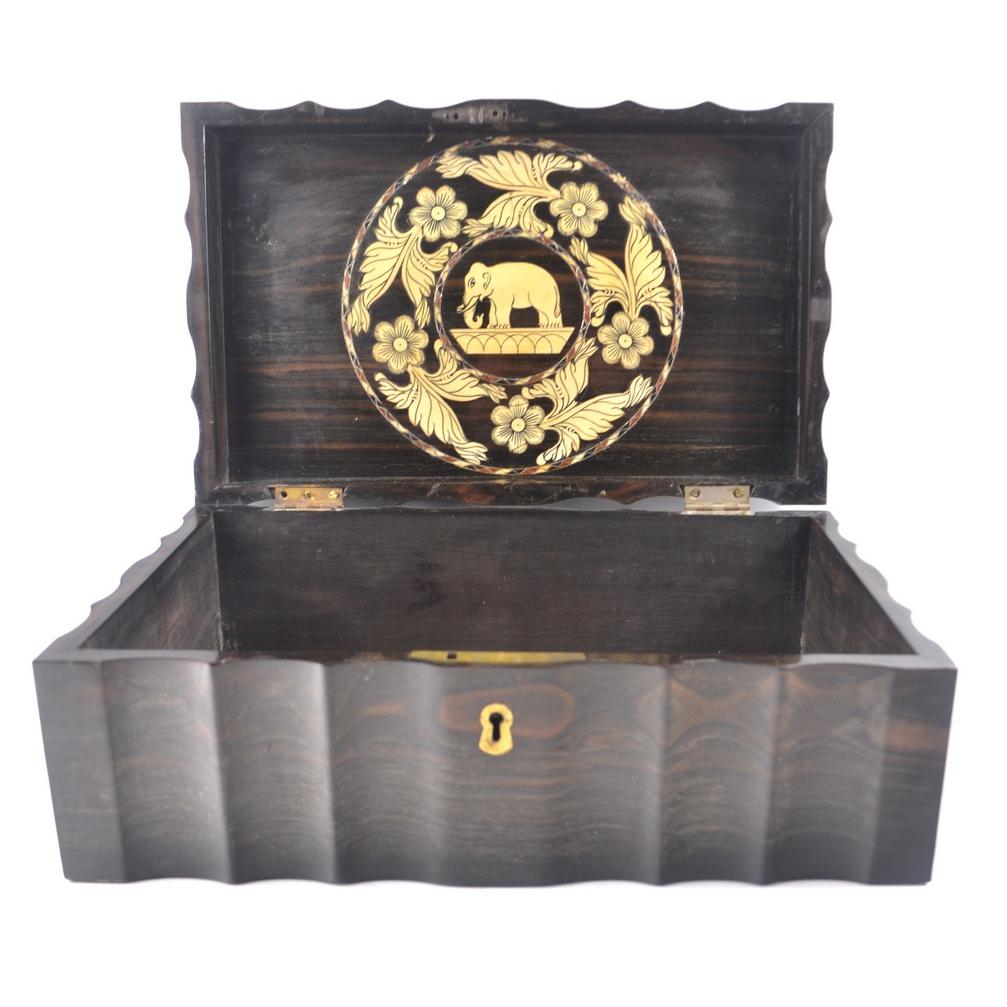 A large coromandel wood lidded box with quality bone inlay elephant design roundel within the interior of the lid, lovely quality!L: 37cm approx W: 23cm approx H: 14cm approx