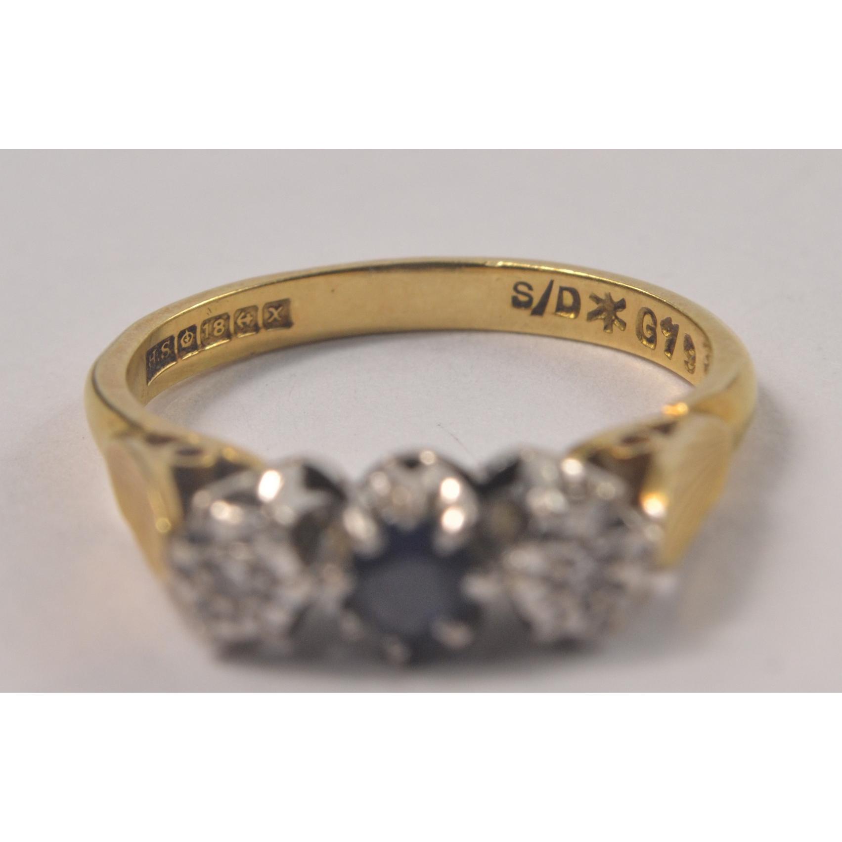 18ct Yellow gold 3 stone Sapphire and illusion set diamond ring [size N]Gross weight approx 3.9grms