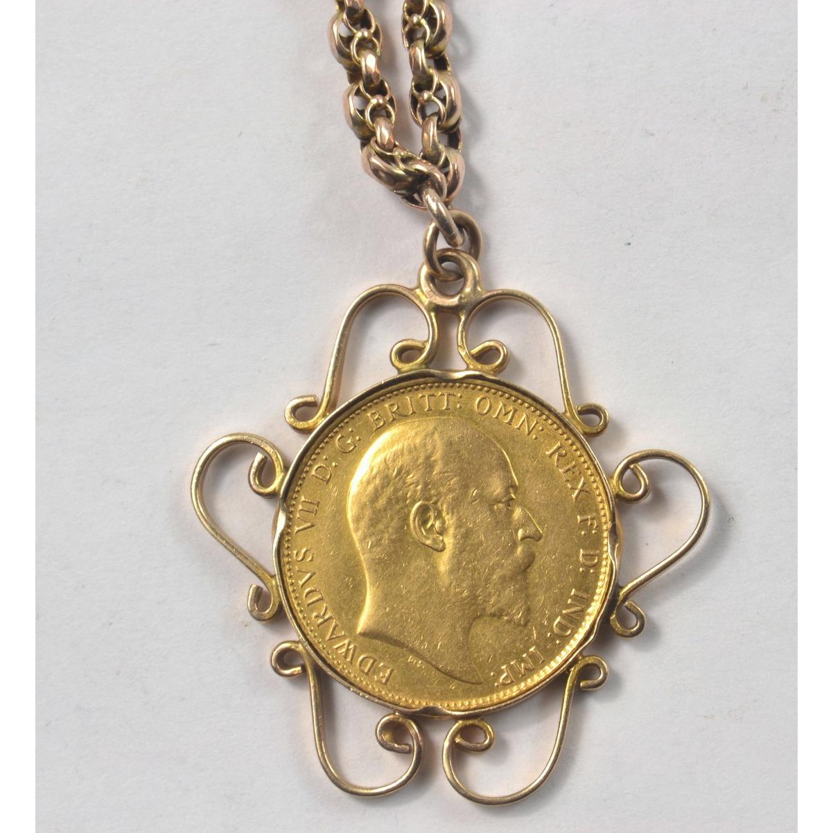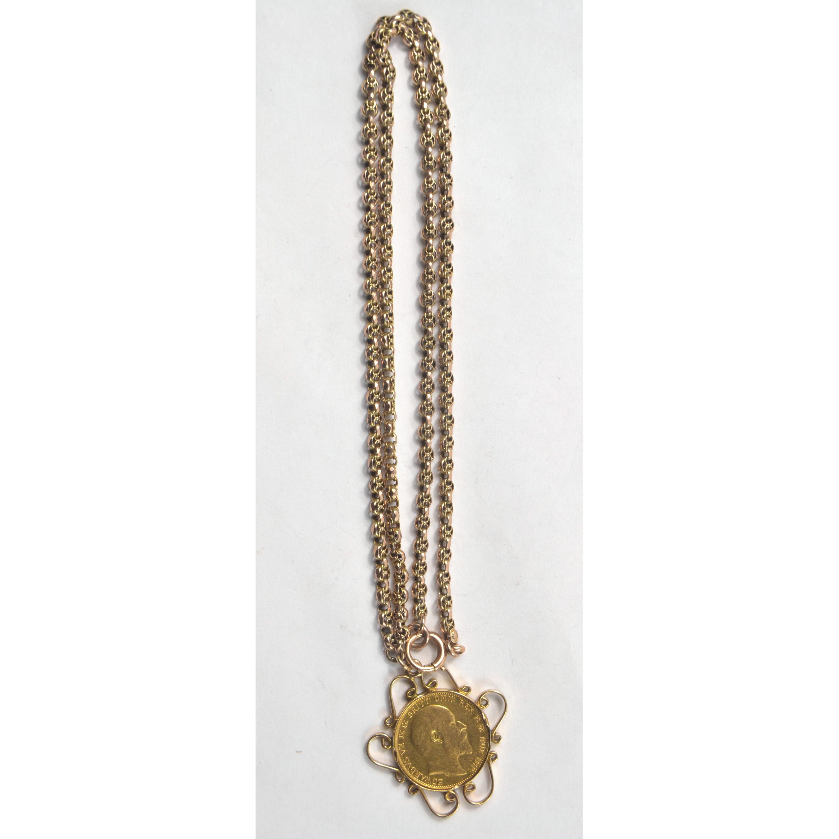 Full Edward V11 1907 gold Sovereign, mounted, with a quality guard 9ct stamped gold chain, chain measures 60cm , Gross weight approx 23.95