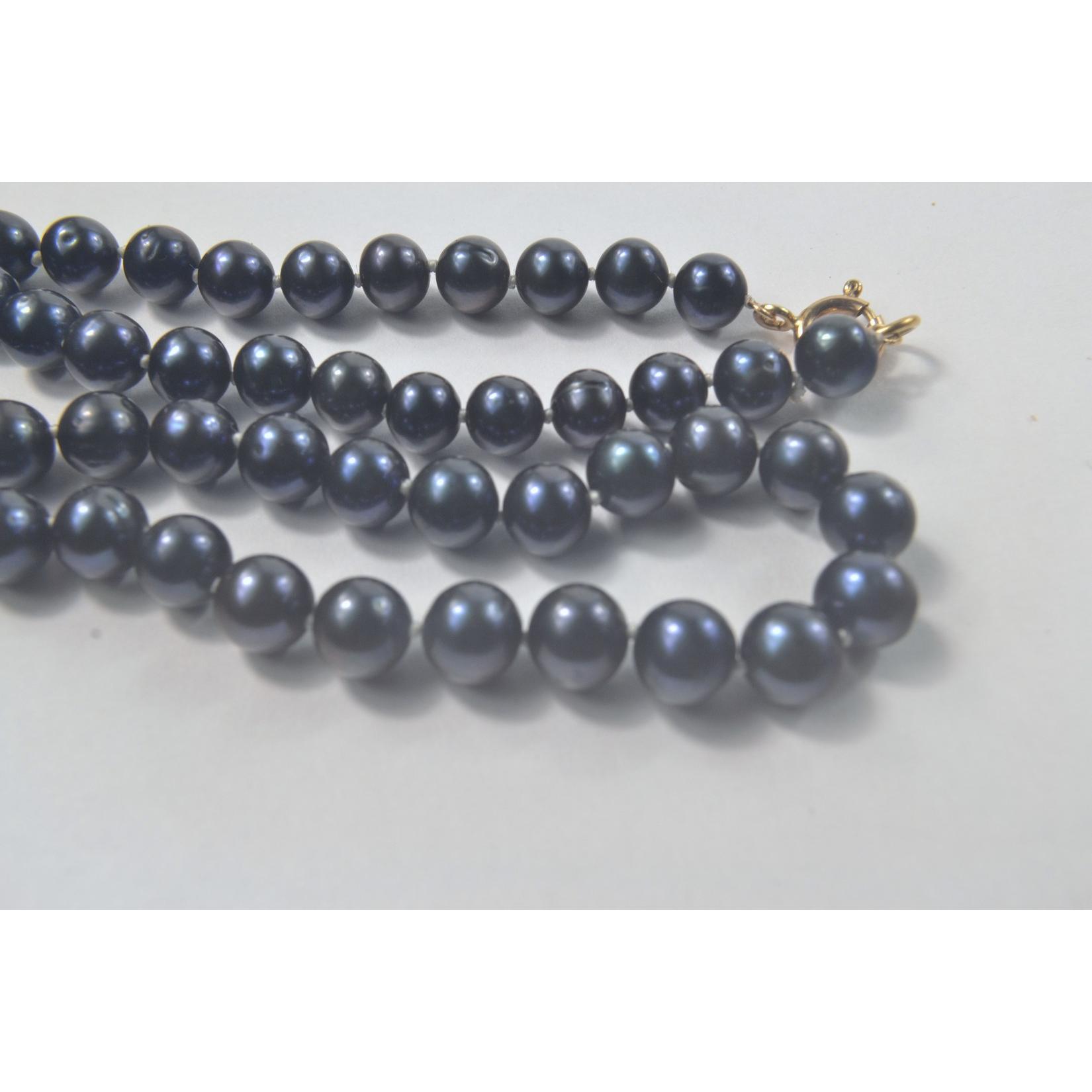 String of Purple pearls with 9ct fastening [L: 42cm]