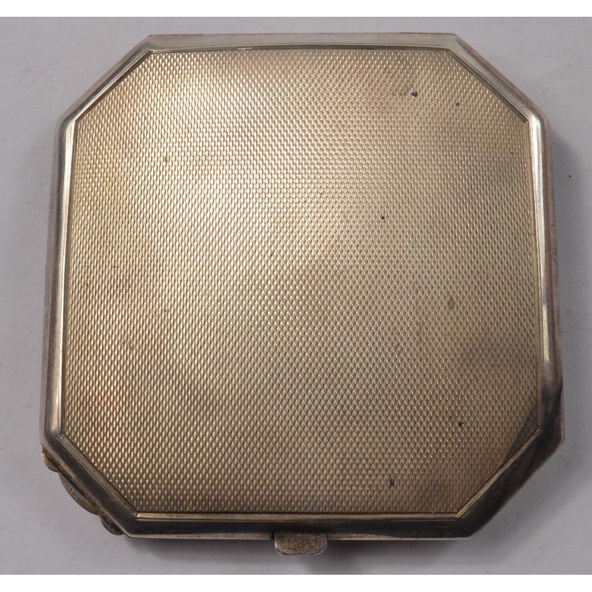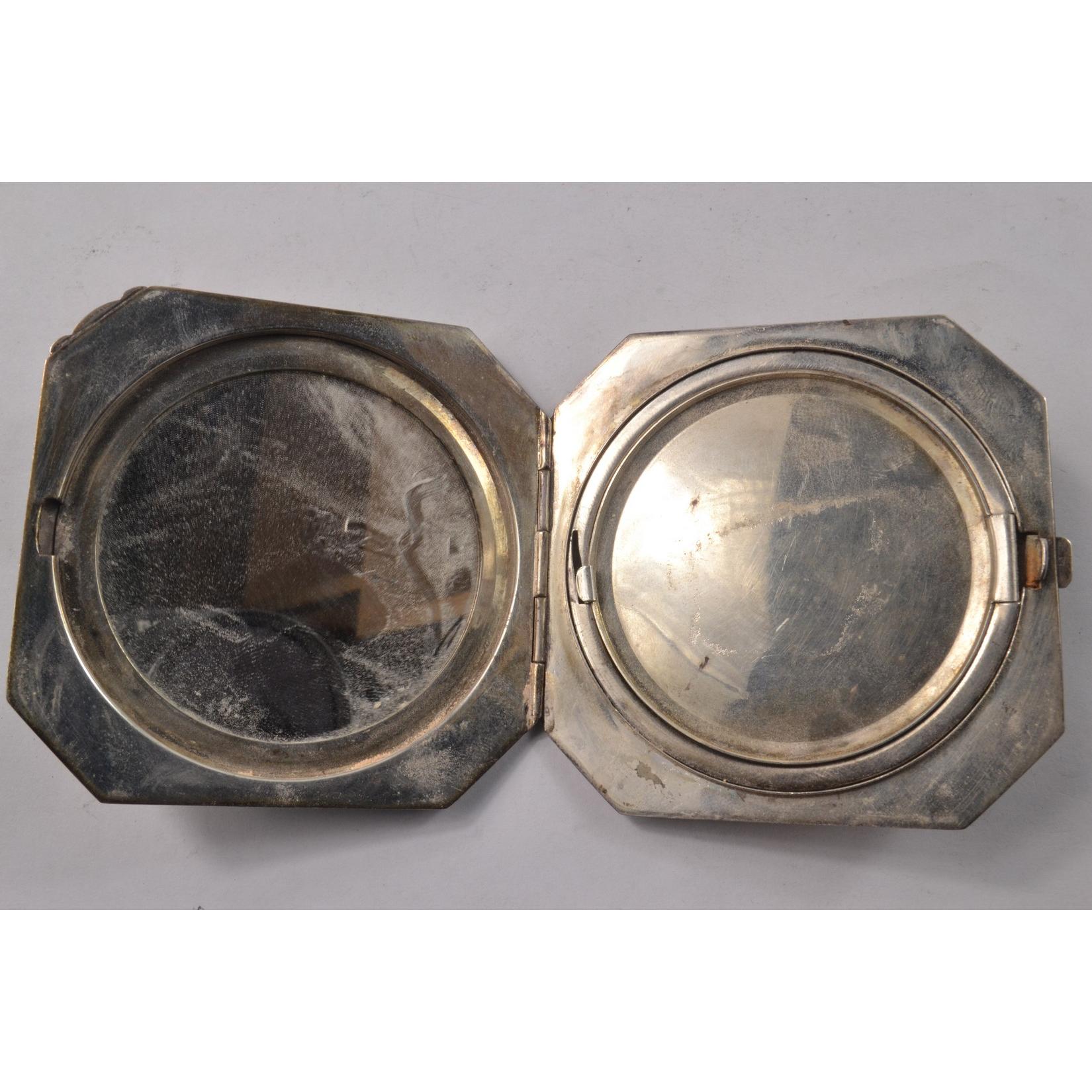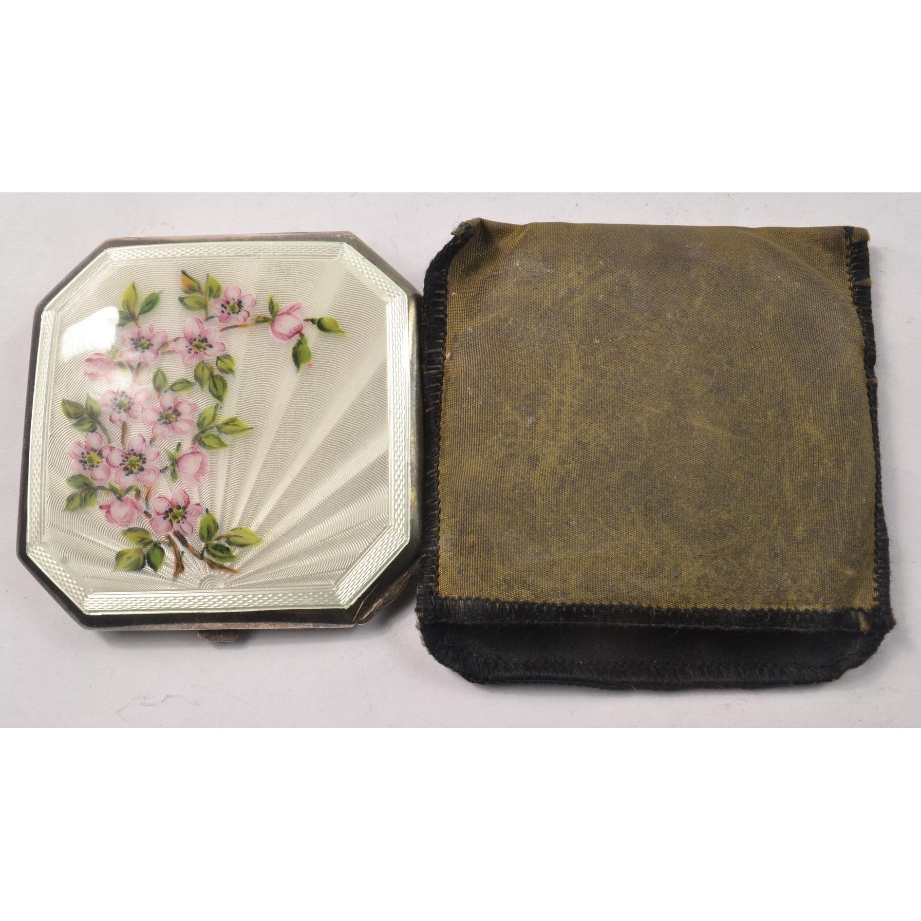 Birmingham silver compact with white enamel front and wild rose design. Comes with fitted soft case. Makers mark M W b.W: 7cm approx D: 7cm approx