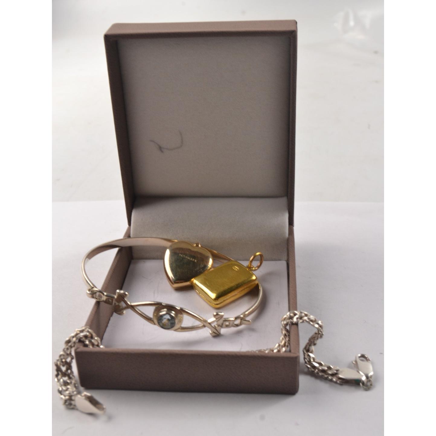 Small box containing a silver bangle with a blue stone, a flat link silver bracelet [16cm] a heart shaped 9ct back and front locket and a square yellow metal locket.Gross weight approx 29.9grms