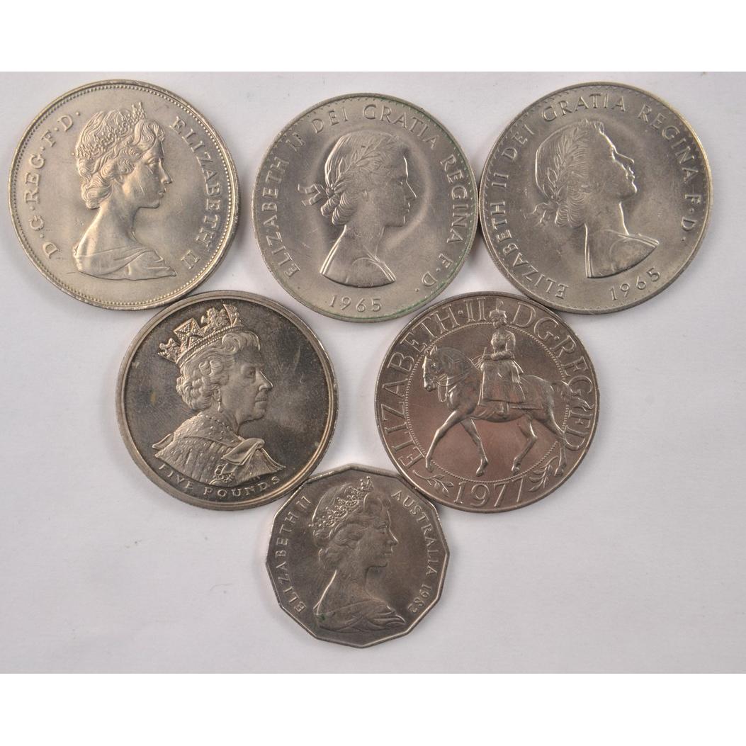 2002 FIVE POUND Jubilee celebration coin and 1977 Jubilee coin, Charles & Diana 1981, 2 x 1965 Churchill coins and a 1982 Australian 50 cents