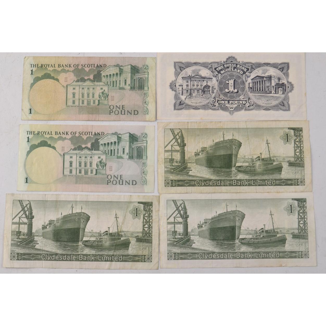 2 x The Royal Bank Of Scotland One Pound Notes 1967 Serial No A 1862050 FINE , A/18 165355 Extra Fine, and a Royal Bank Of Scotland One Pound note March 1966 Serial No C/M 358927 FINE condition, also 3 Clydesdale Bank One Pound Notes, FINE condition, 3rd April 1967 Serial No C/K 943893, 1st September 1969 C/U 039472, 1st September 1969 C/S 654493