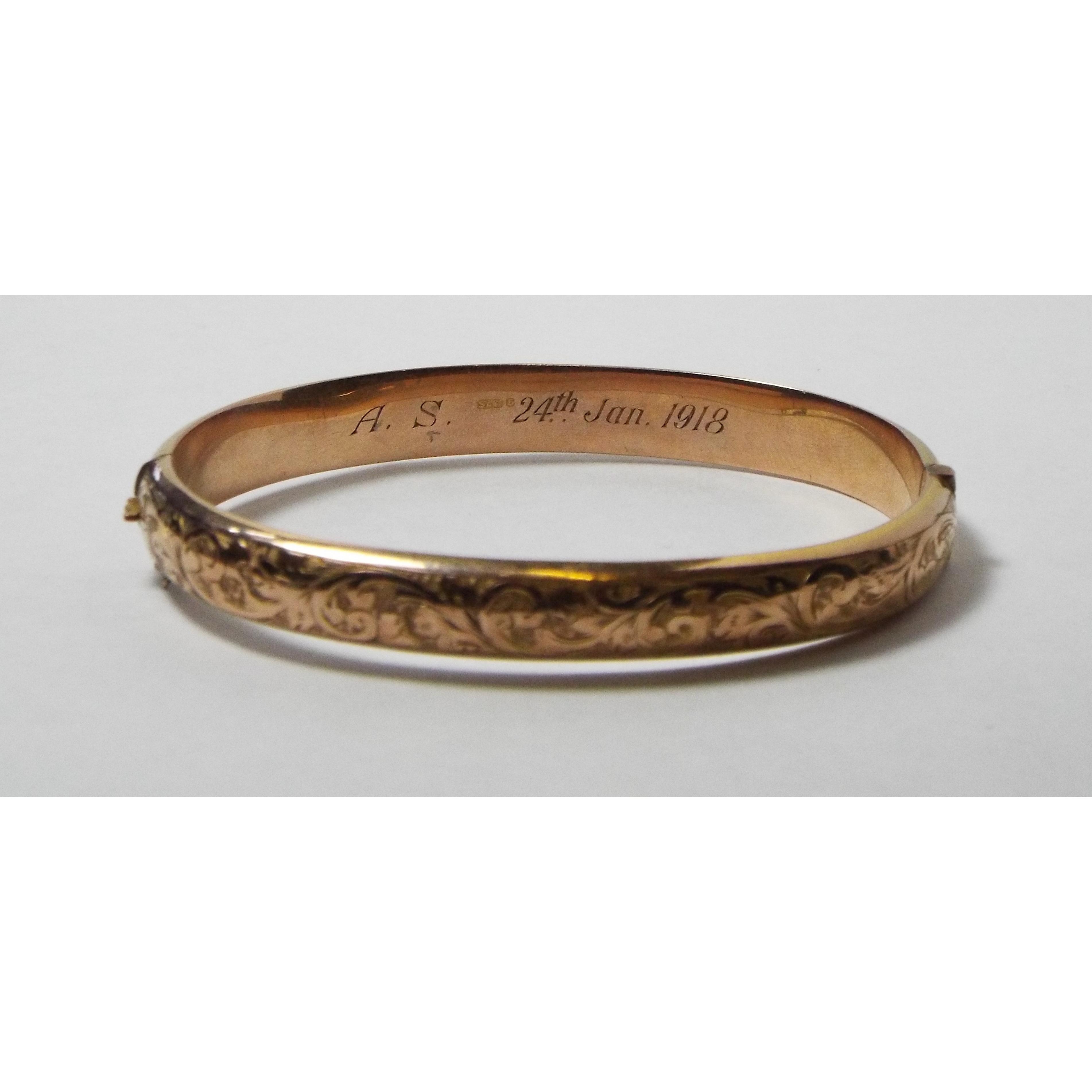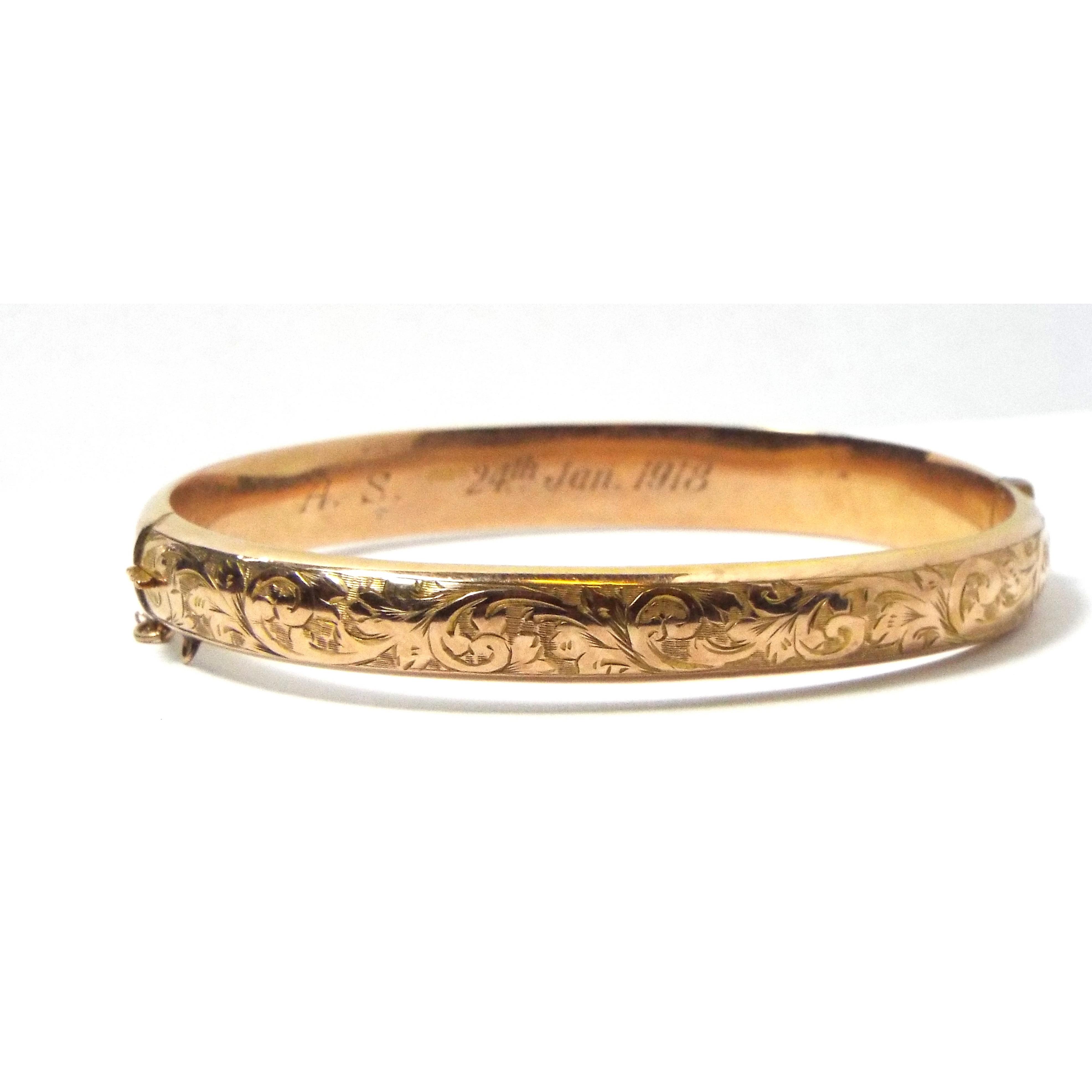 Antique stiff yellow gold bangle with scroll decoration, engraved 1918, 8.6gGross weight approx 8.6g