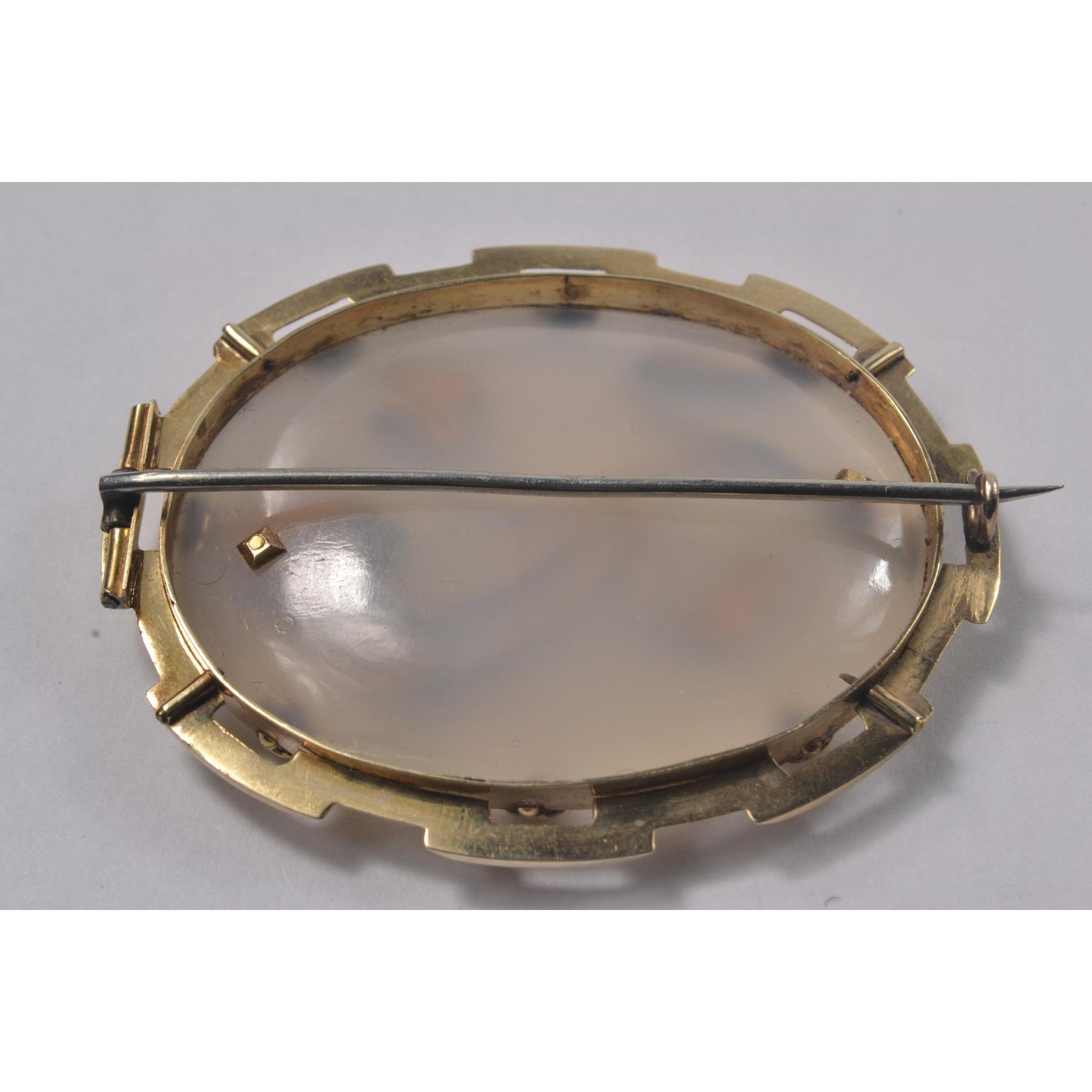 15ct Oval opaline brooch decorated with floral motif set with torquoise and small old cut diamond.L: 5cm approx H: 4.25cm approx Gross weight approx 17.25grms