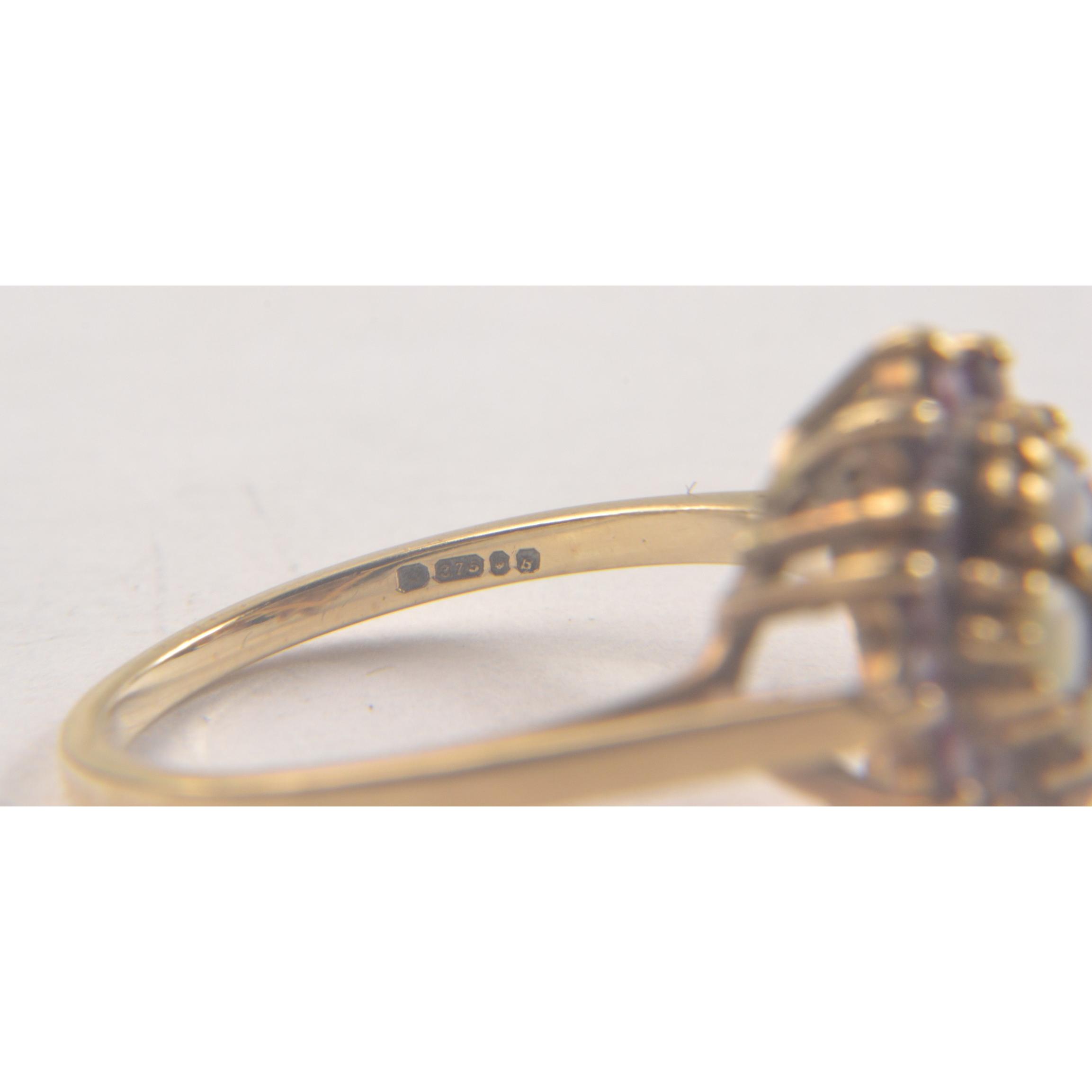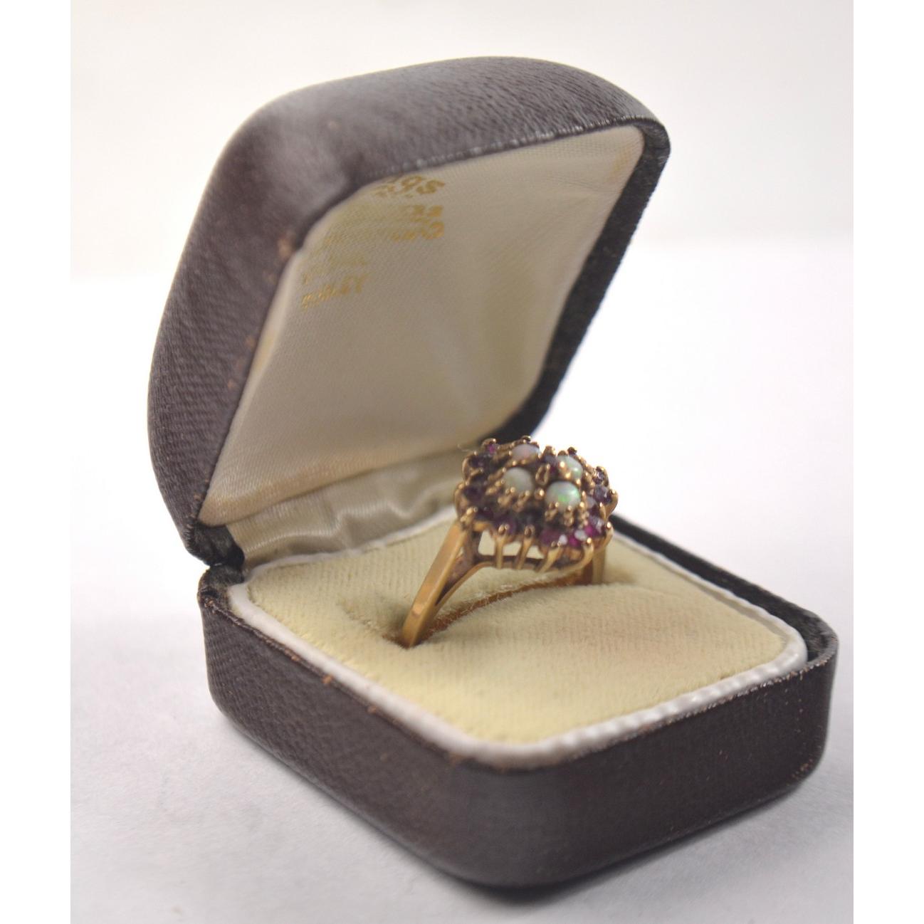 9ct gold ruby and opal ring. Size P/Q. Set with 4 opals surrounded by rubies with a central ruby. In ring boxGross weight approx 3.2g