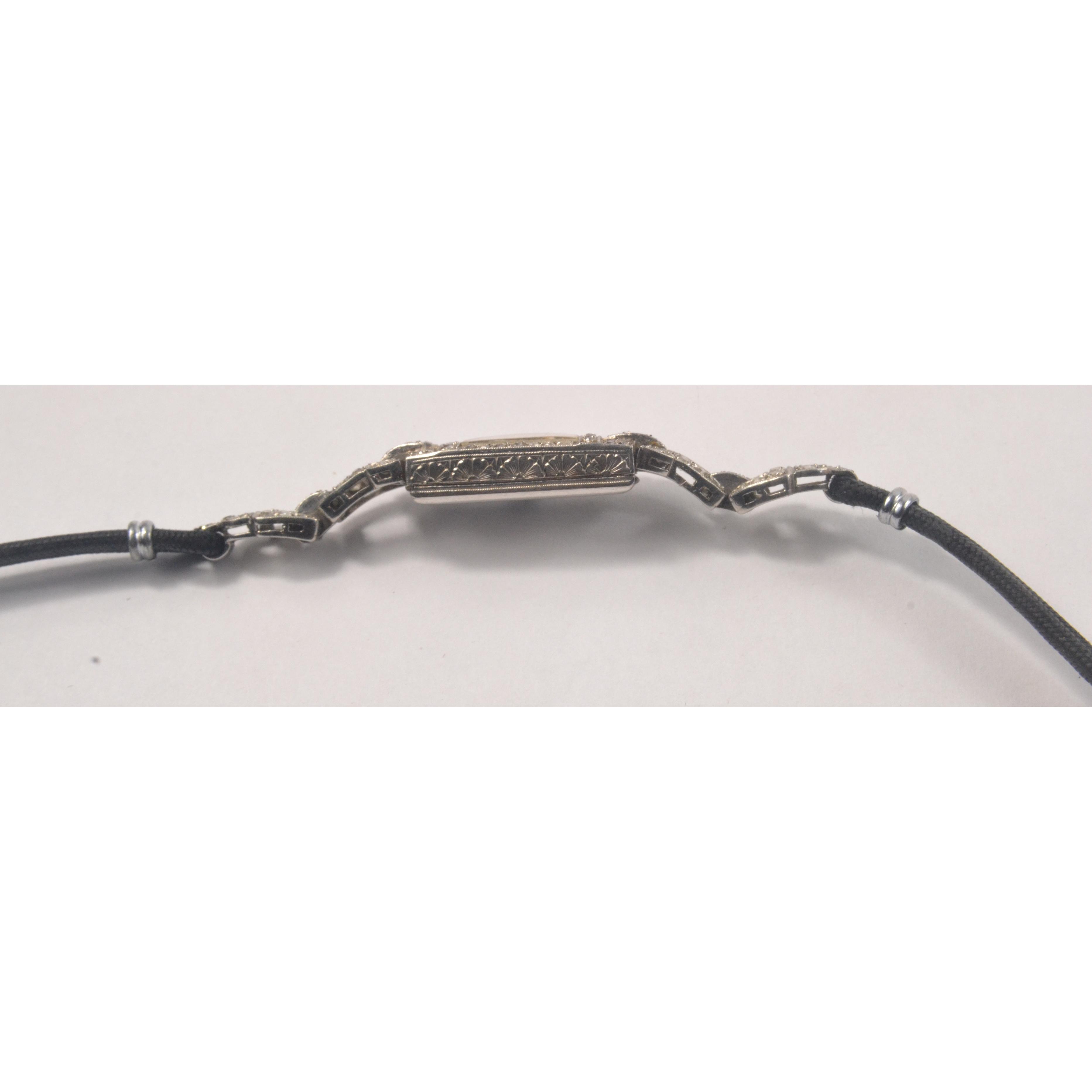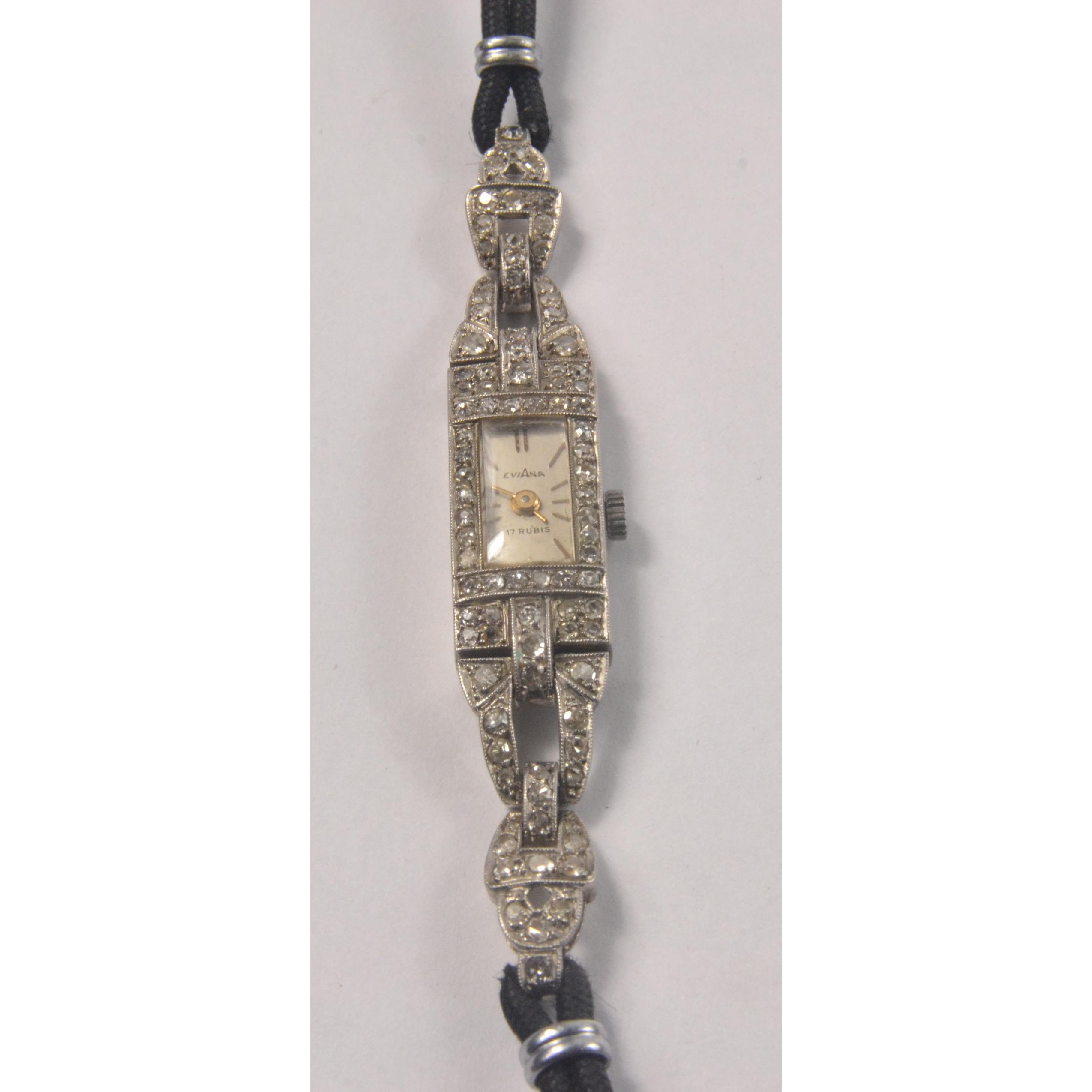French Eviana white metal (indistinct mark inside case) and diamond Art Deco cocktail watch [ in working order ] 6.5 cm watch part. 14 cm with strap.