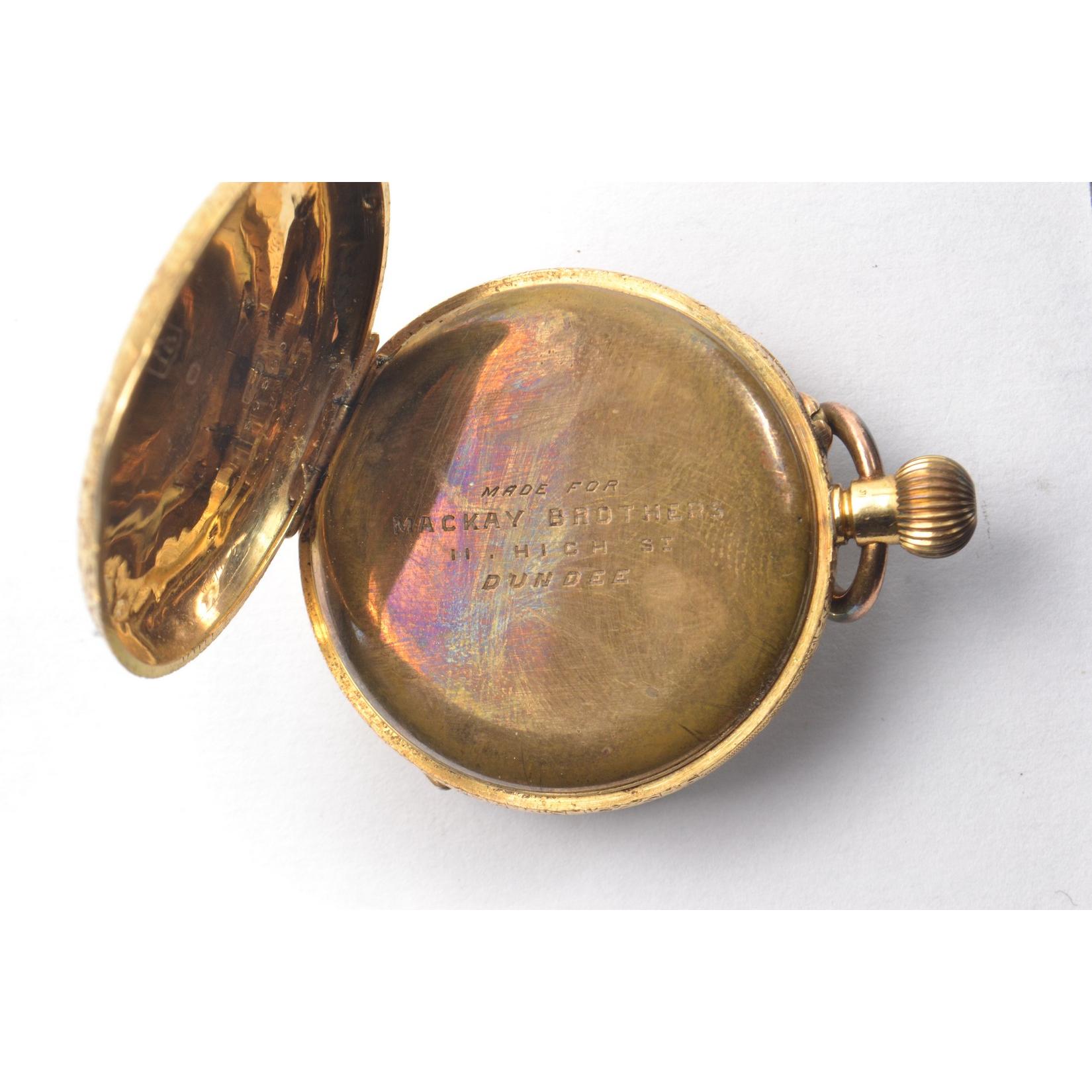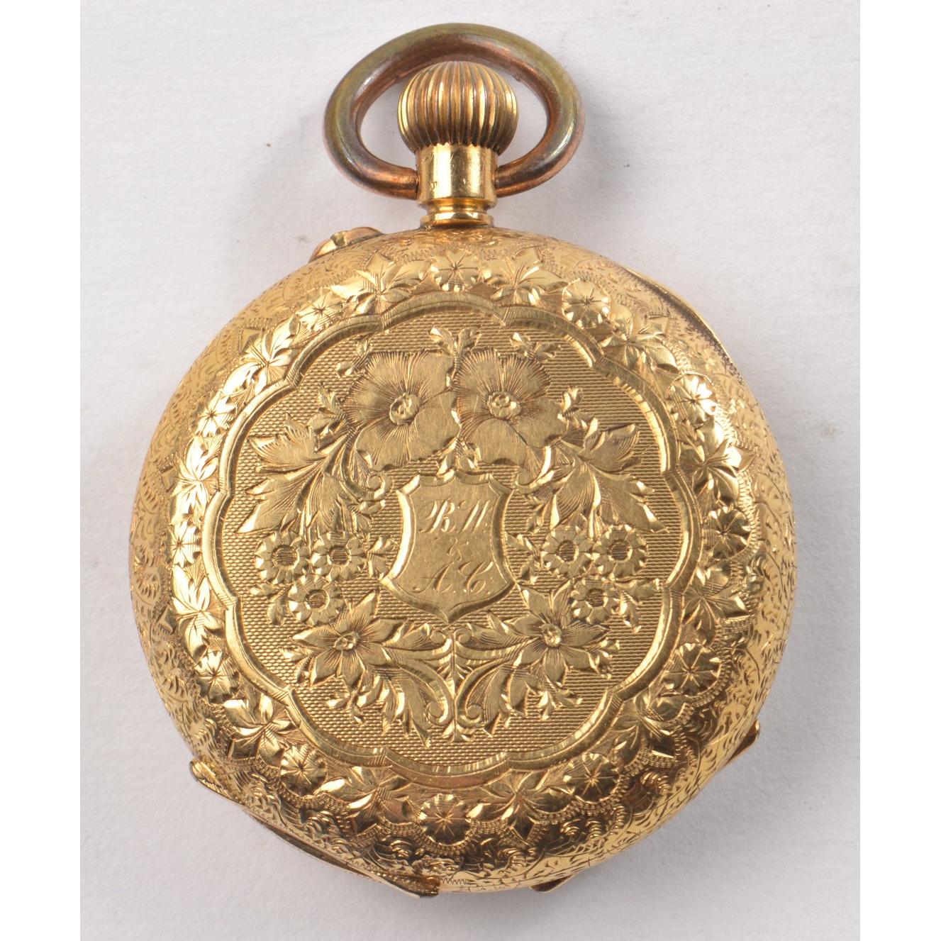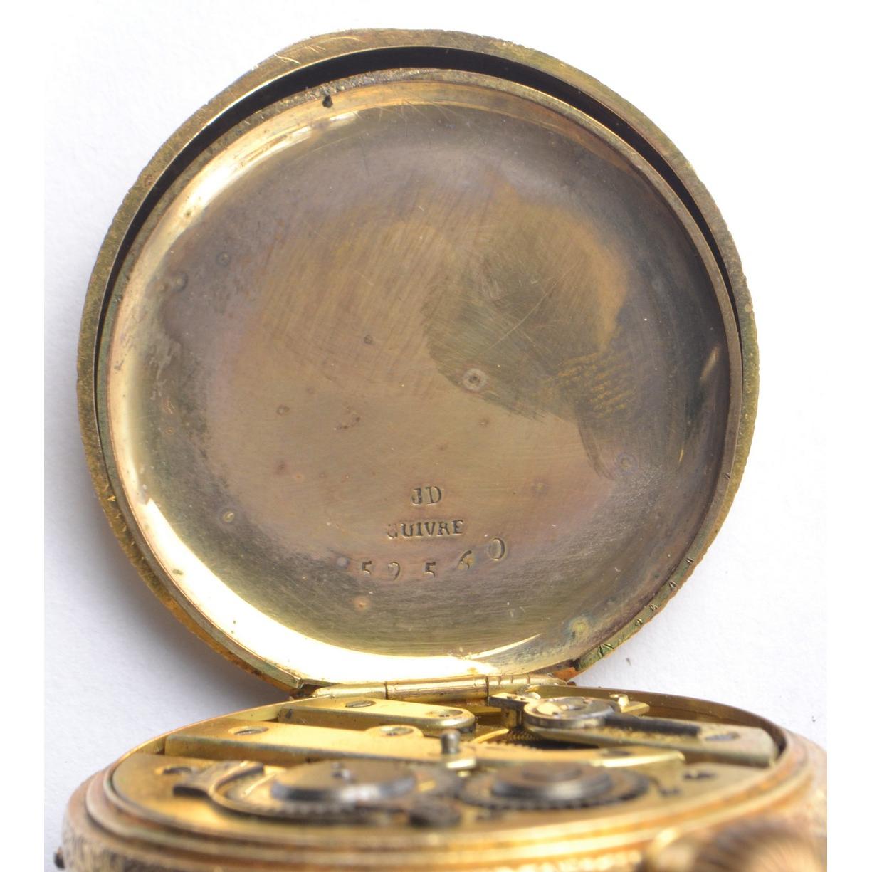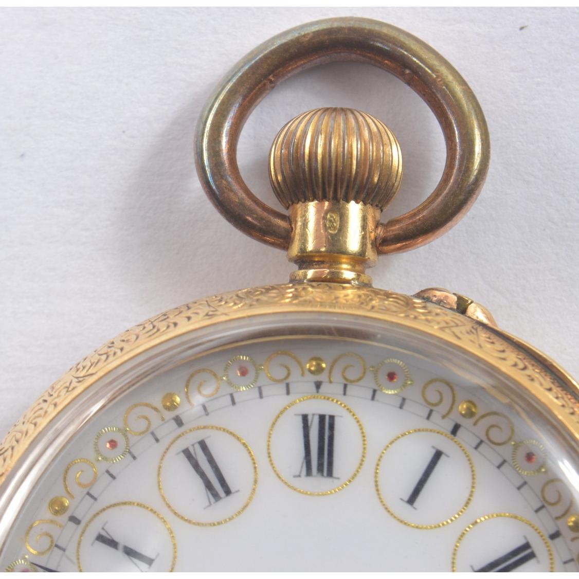 cEdwardian 18kt stamped gold cased ladies antique pocket watch 3.5cm diameter with an ornately decorated enamelled face gross weight 38g, in good condition, glass face also in good condition.