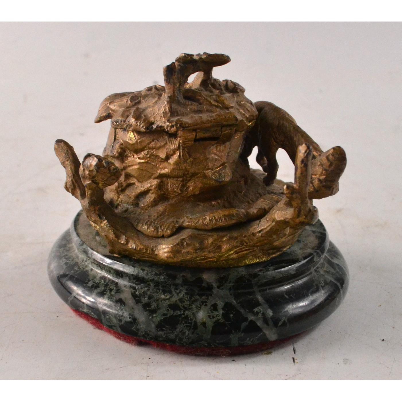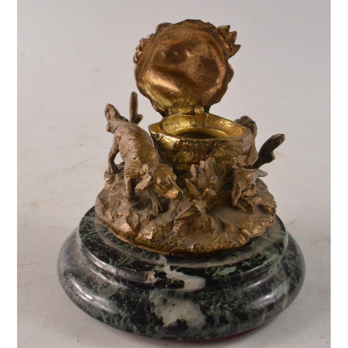 Unusual inkwell with bronzed hunting dog on the prowl on a marble base. Liner not included W: 9cm approx H: 7cm approx