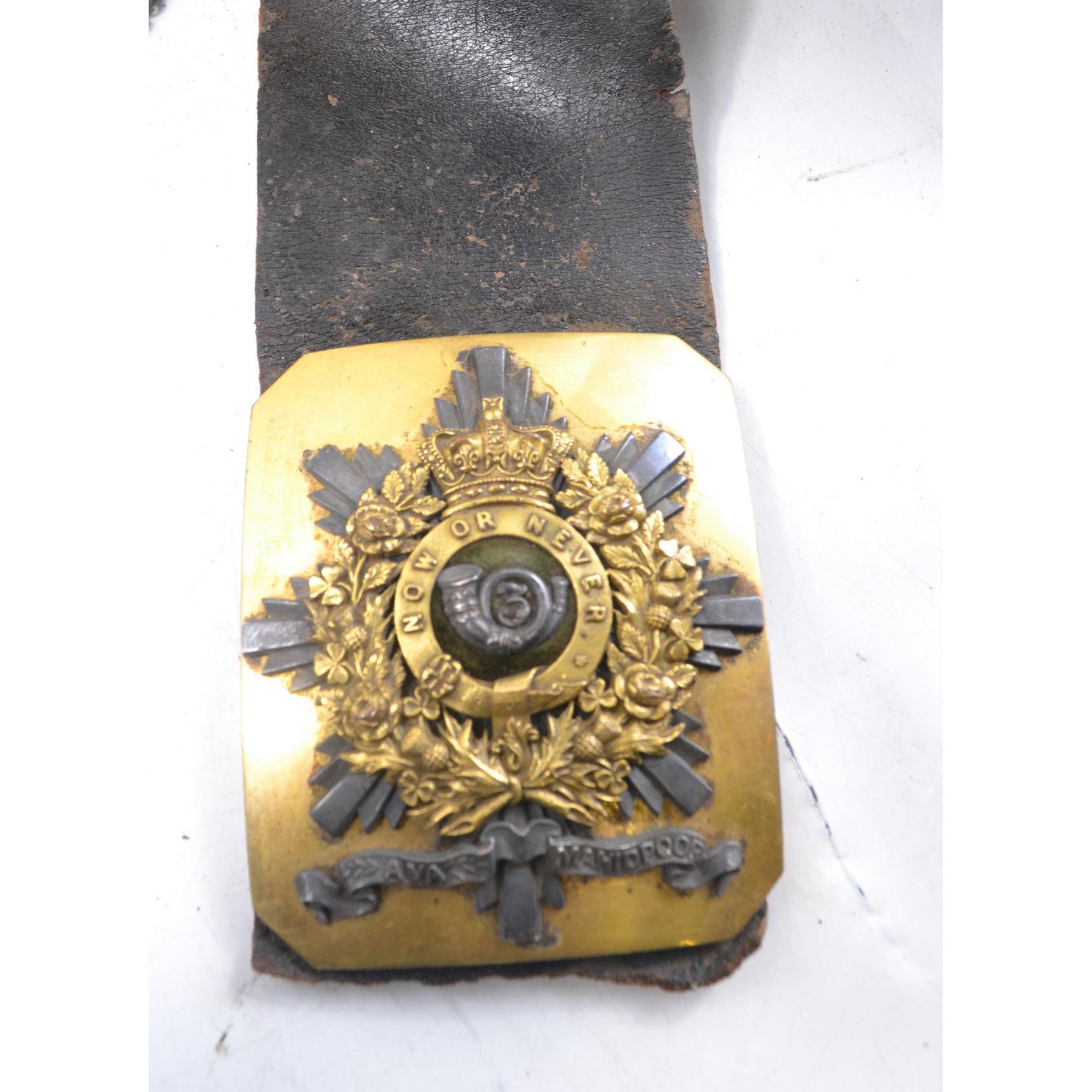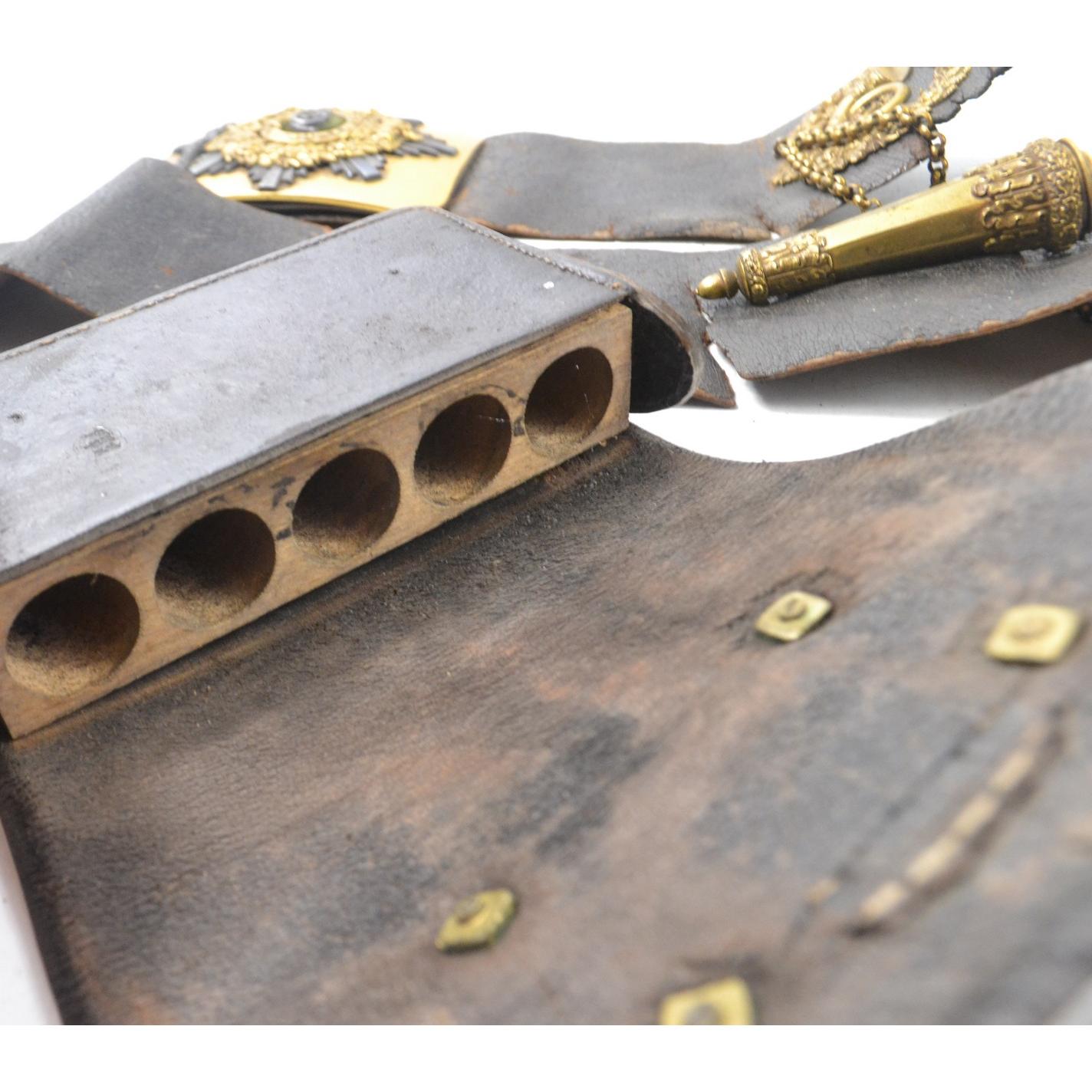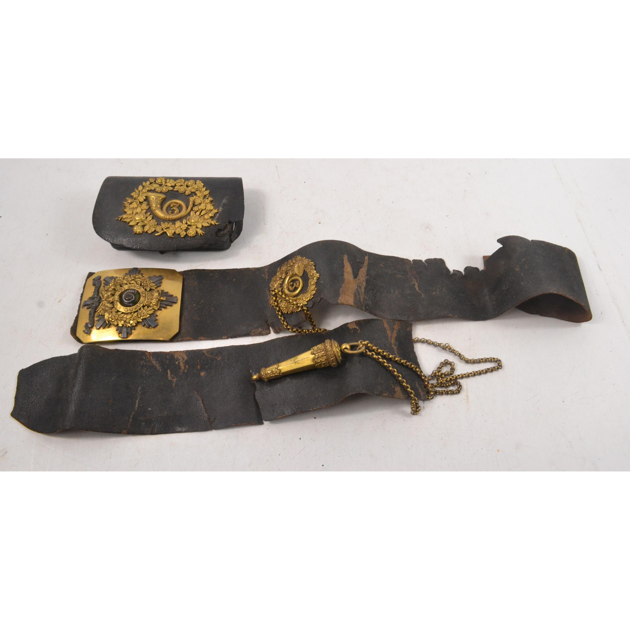 Very old Military belt with 'Now or Never' motto and 3 in trumpet emblem, with matching musket ball holder. Family story reported to be in battle of WaterlooApprox 2 pieces